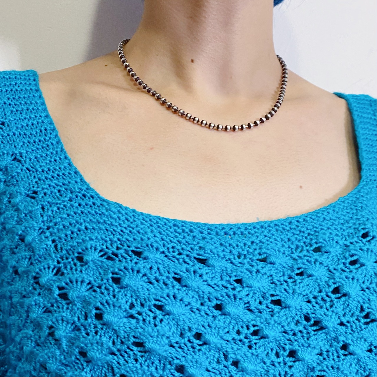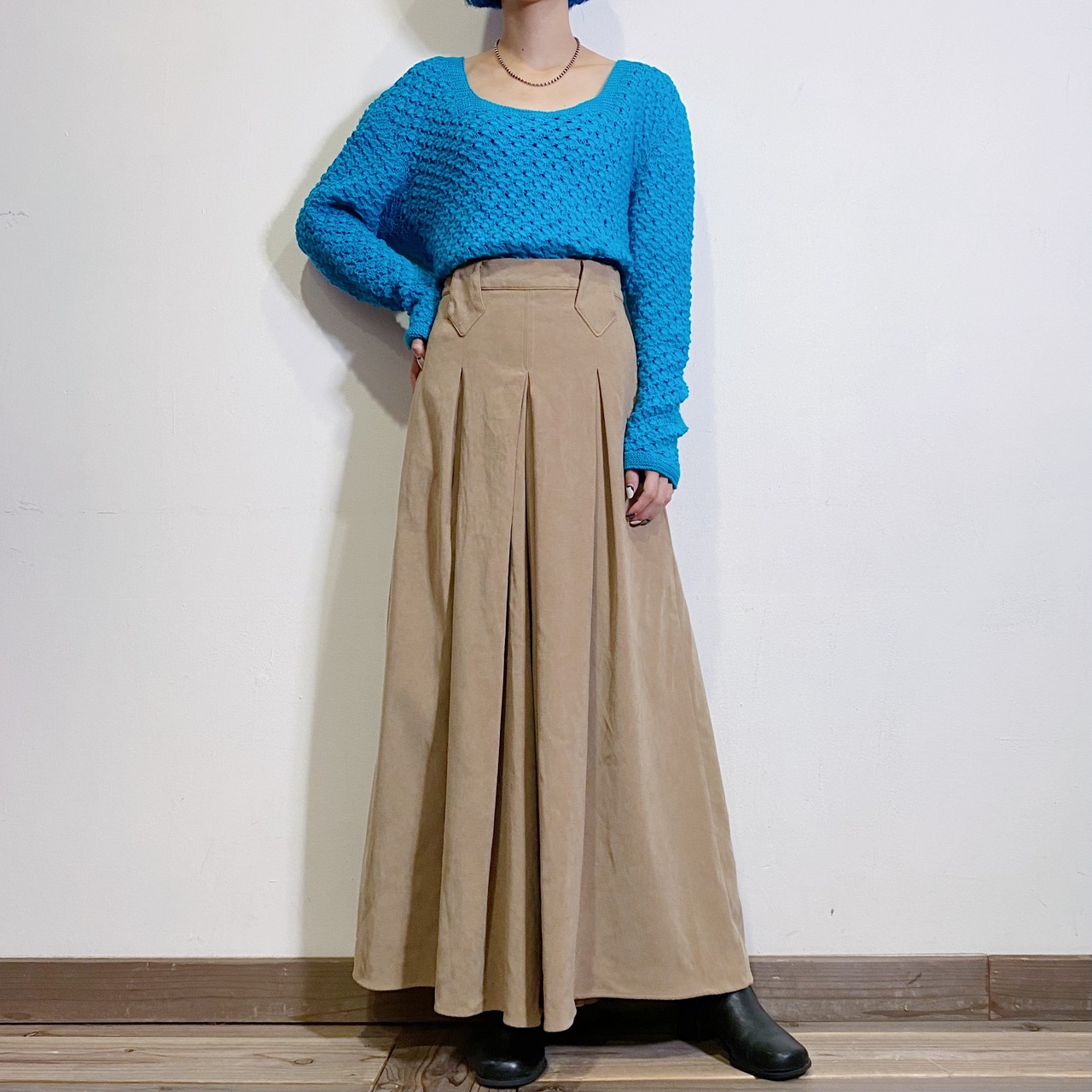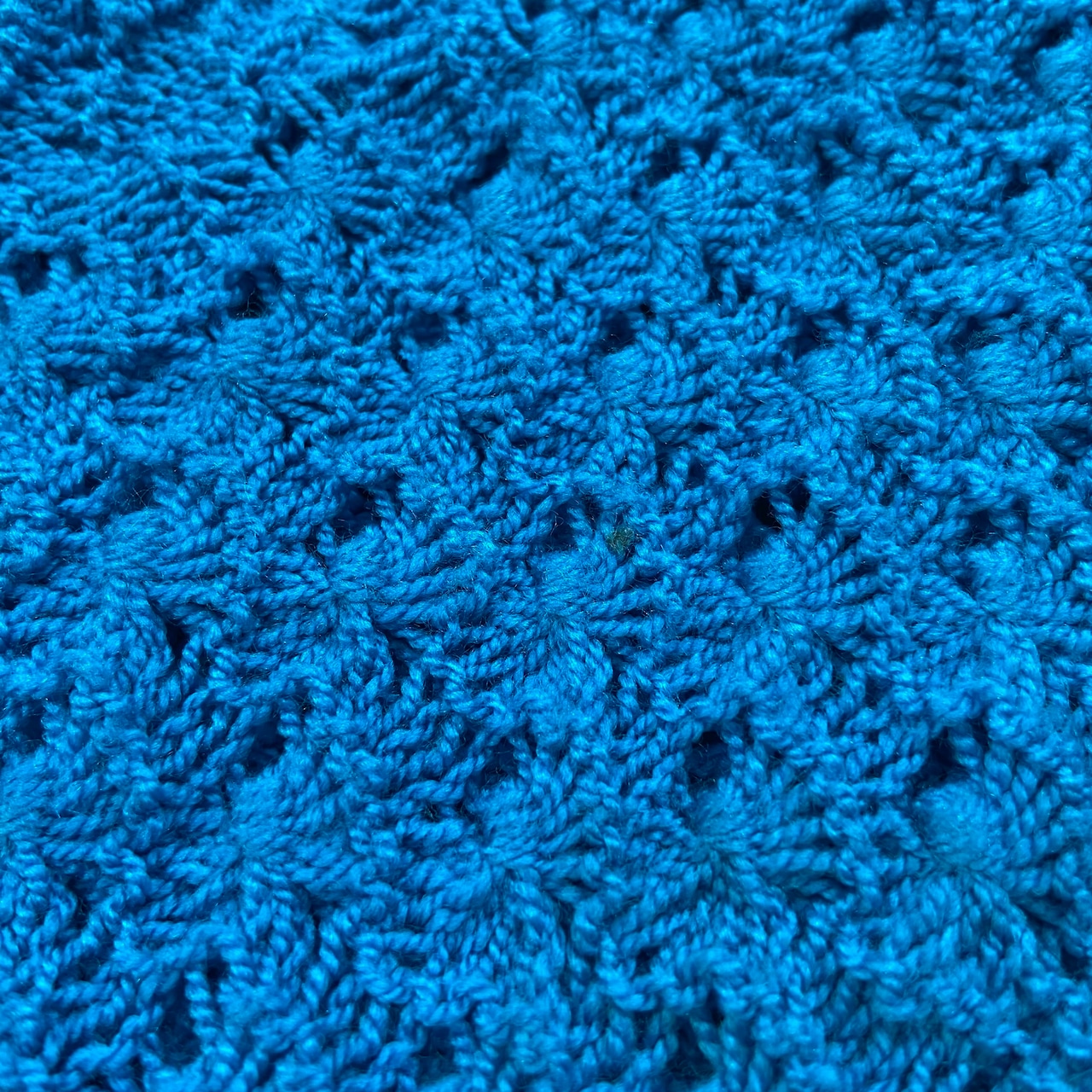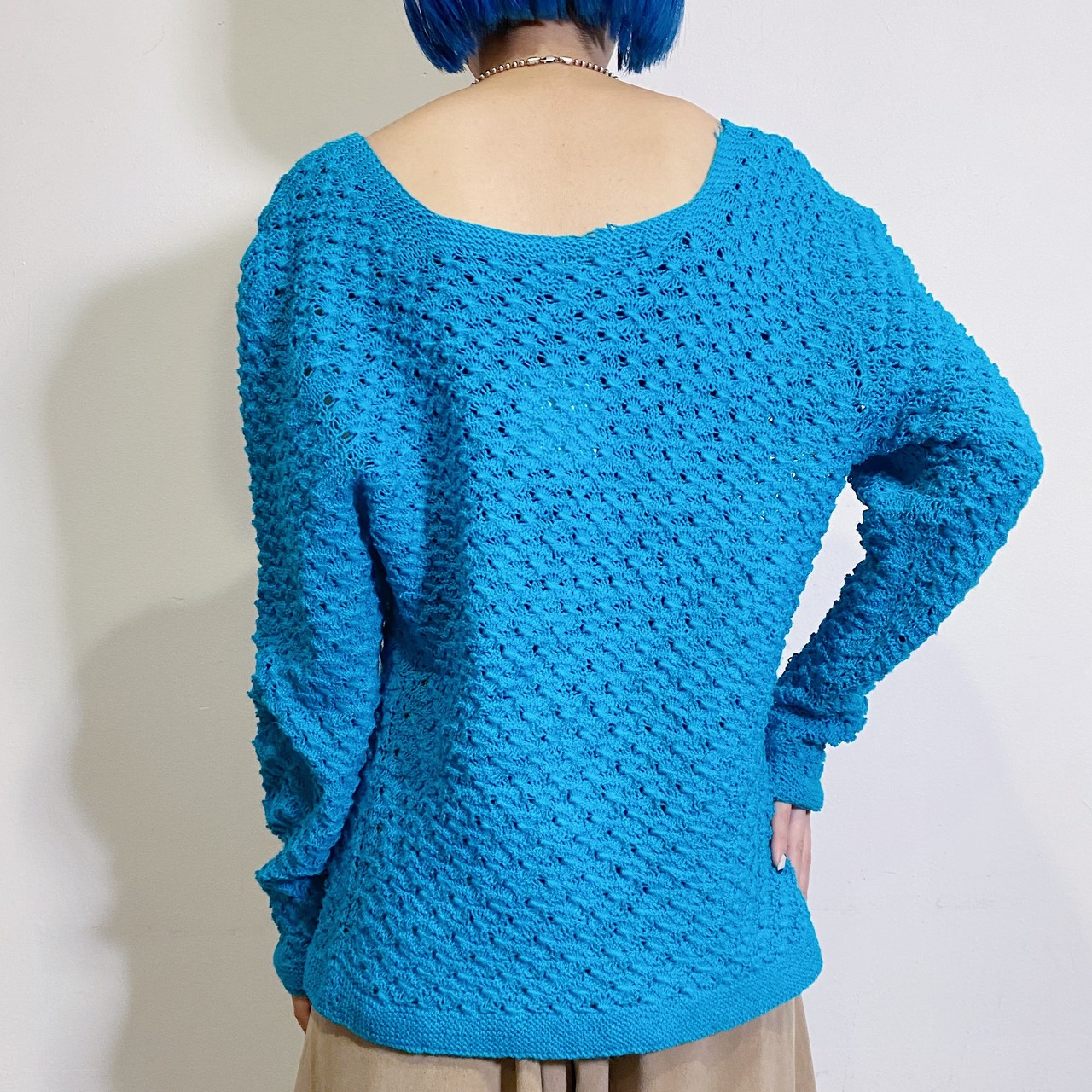 ターコイズブルーカラーのクロシェ編みが可愛い、70年代のハンドニットです。