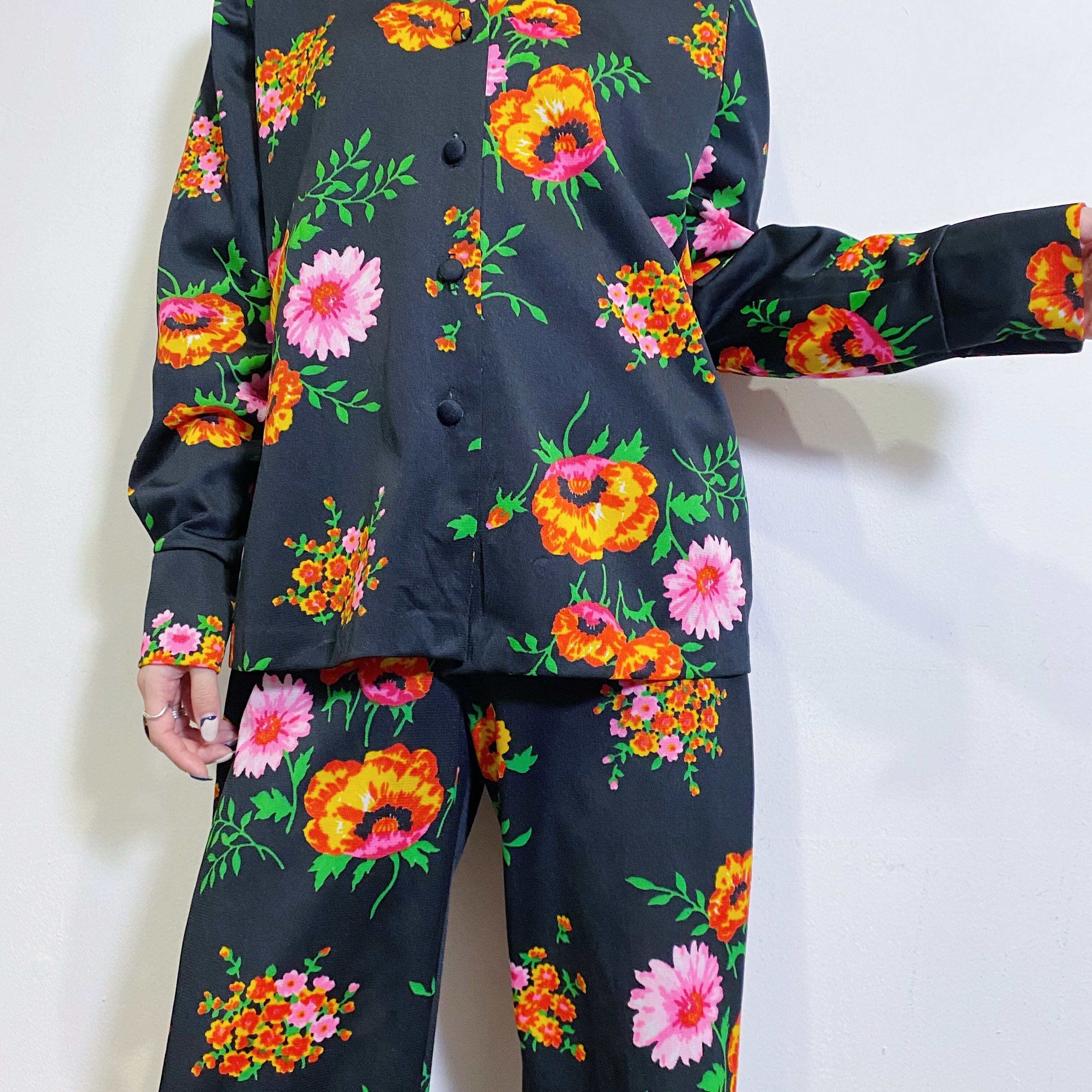 ブラックベースにオレンジやピンクの花柄が映える、70年代のセットアップです。