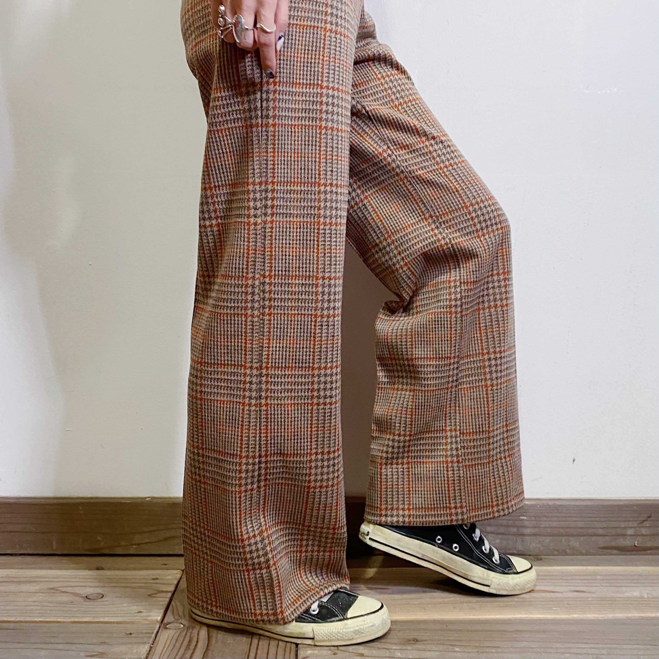 ブラウンとオレンジのような色の組み合わせのチェック柄が可愛い、70年代のパンツです。
