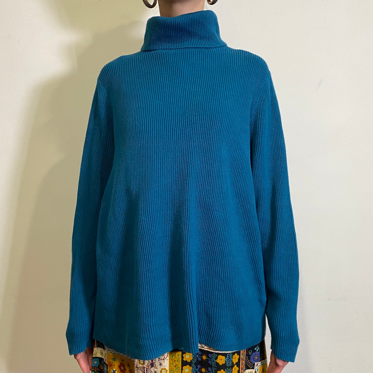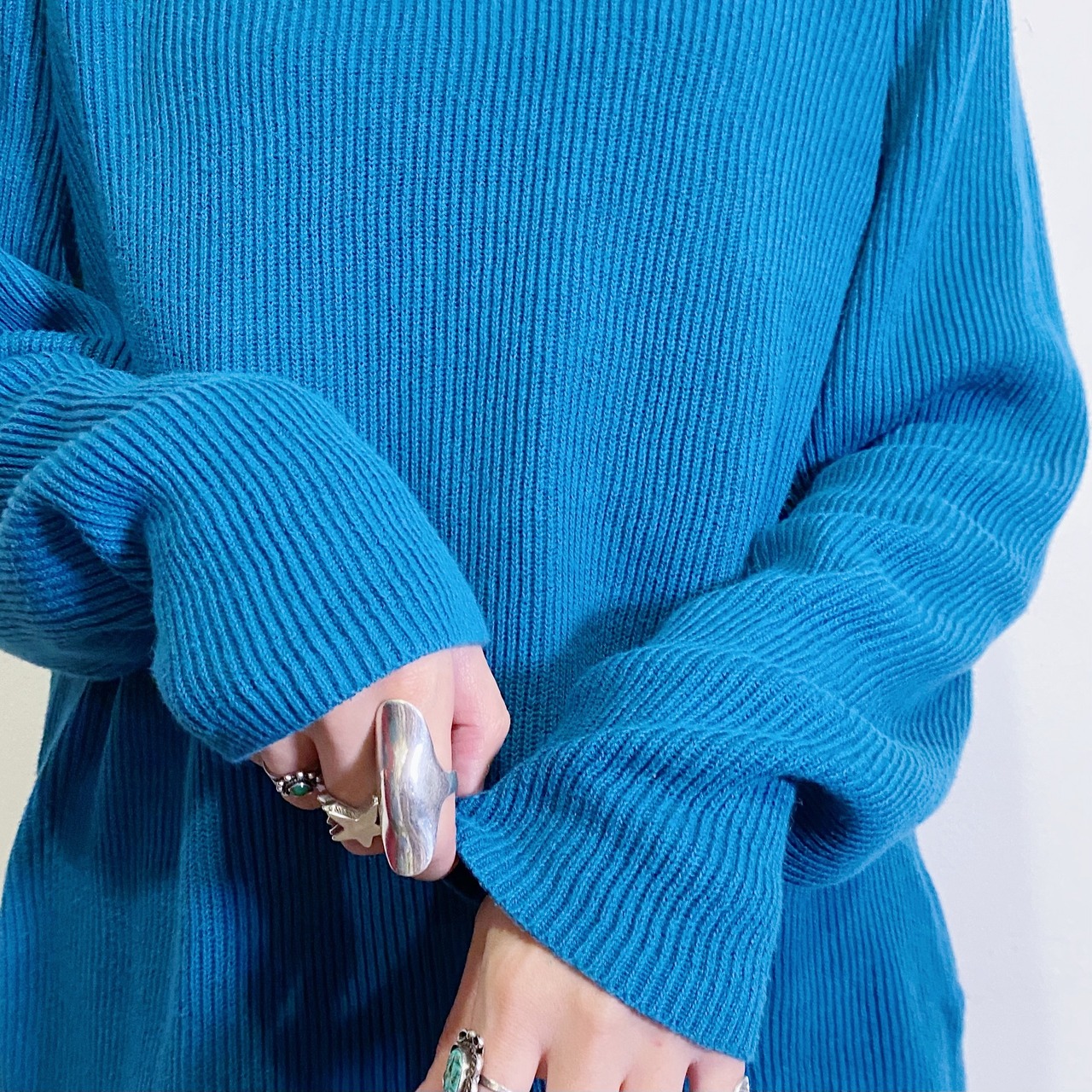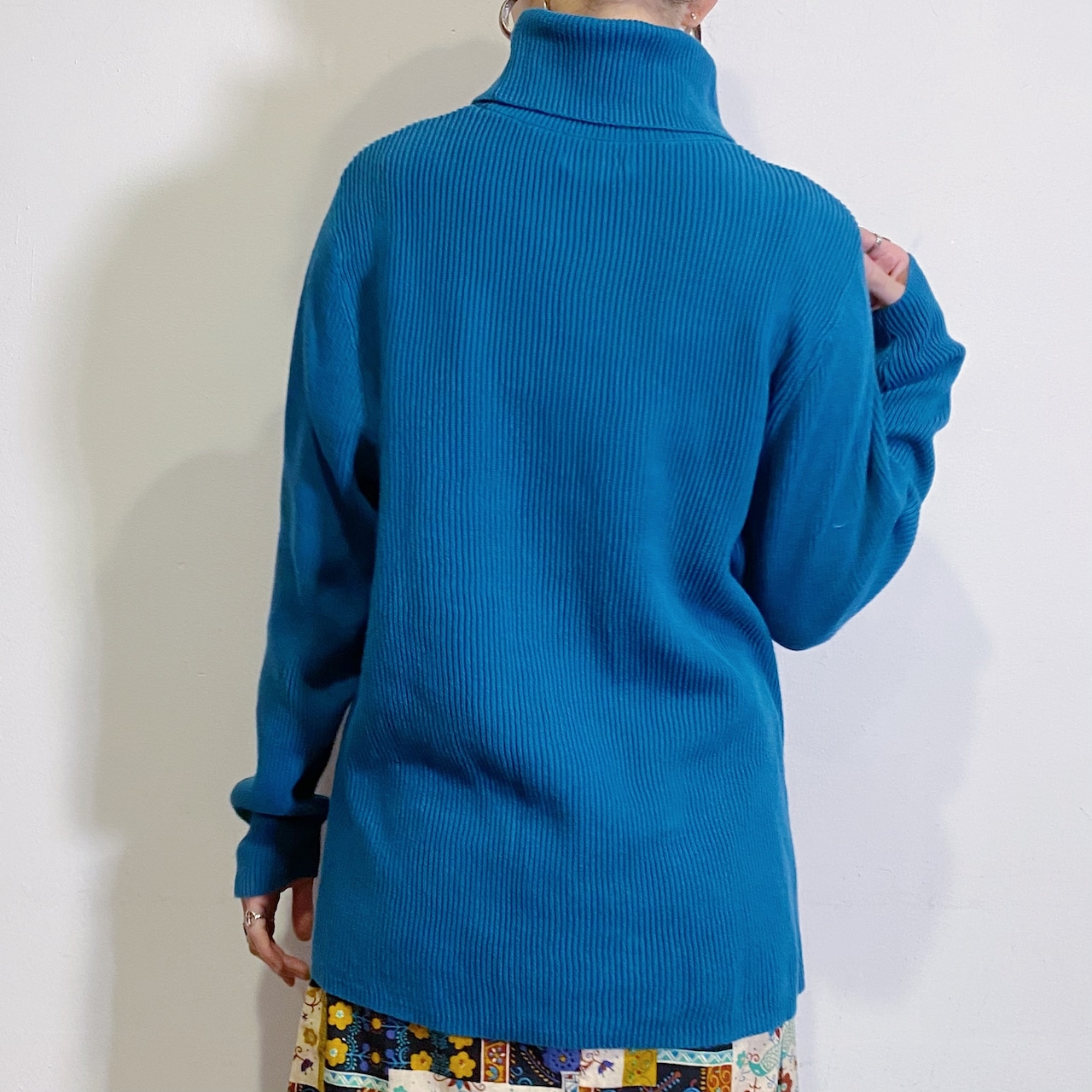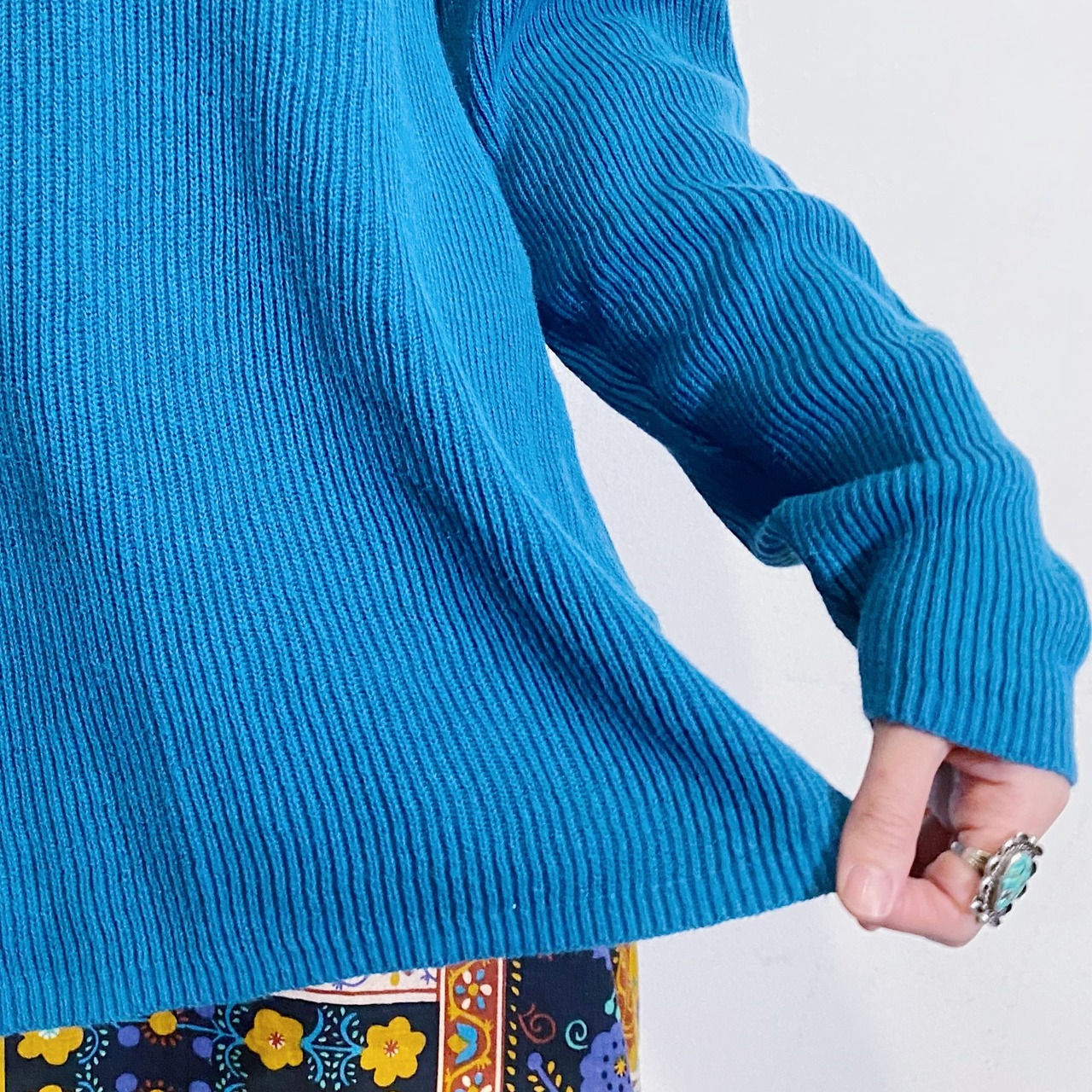 鮮やかな深めのターコイズブルーカラーが可愛い、タートルネックニットです。
