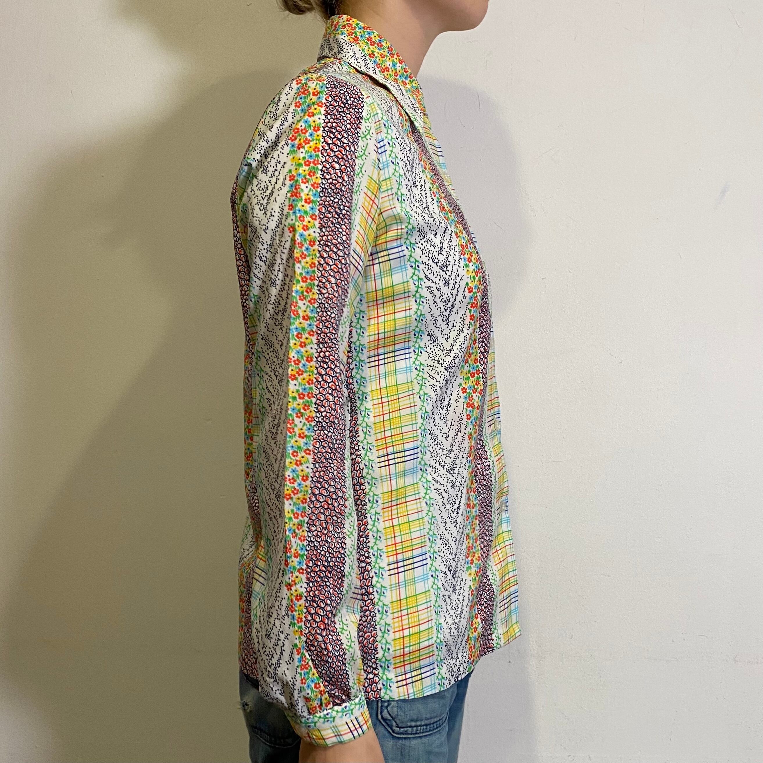 小花柄やチェック柄などの組み合わせが可愛い、70年代の長袖シャツです。