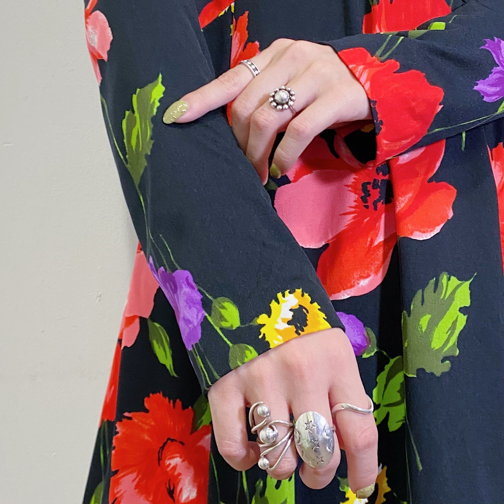 ブラックベースにカラフルなお花のプリントが映える、70年代のワンピースです。
