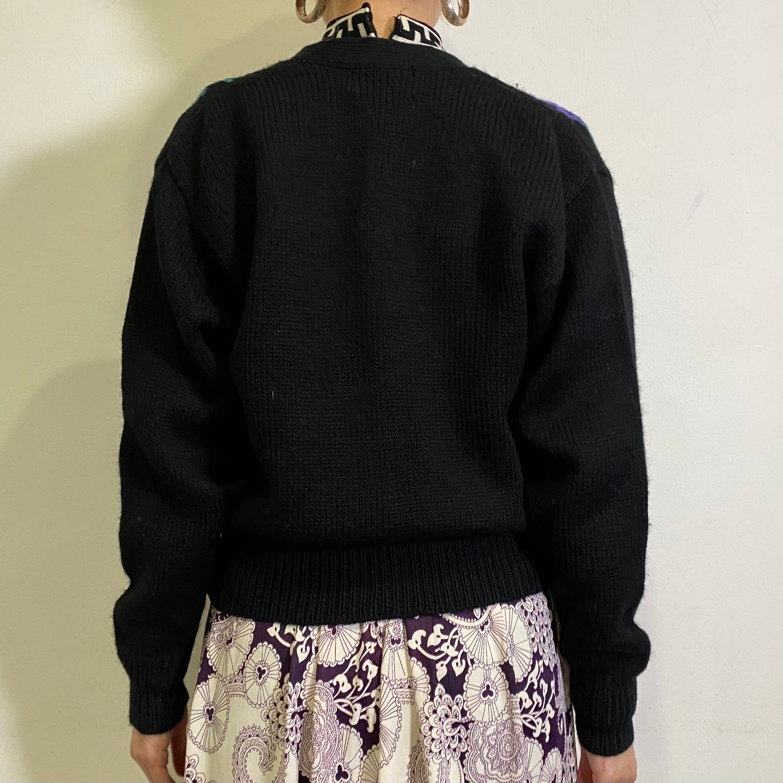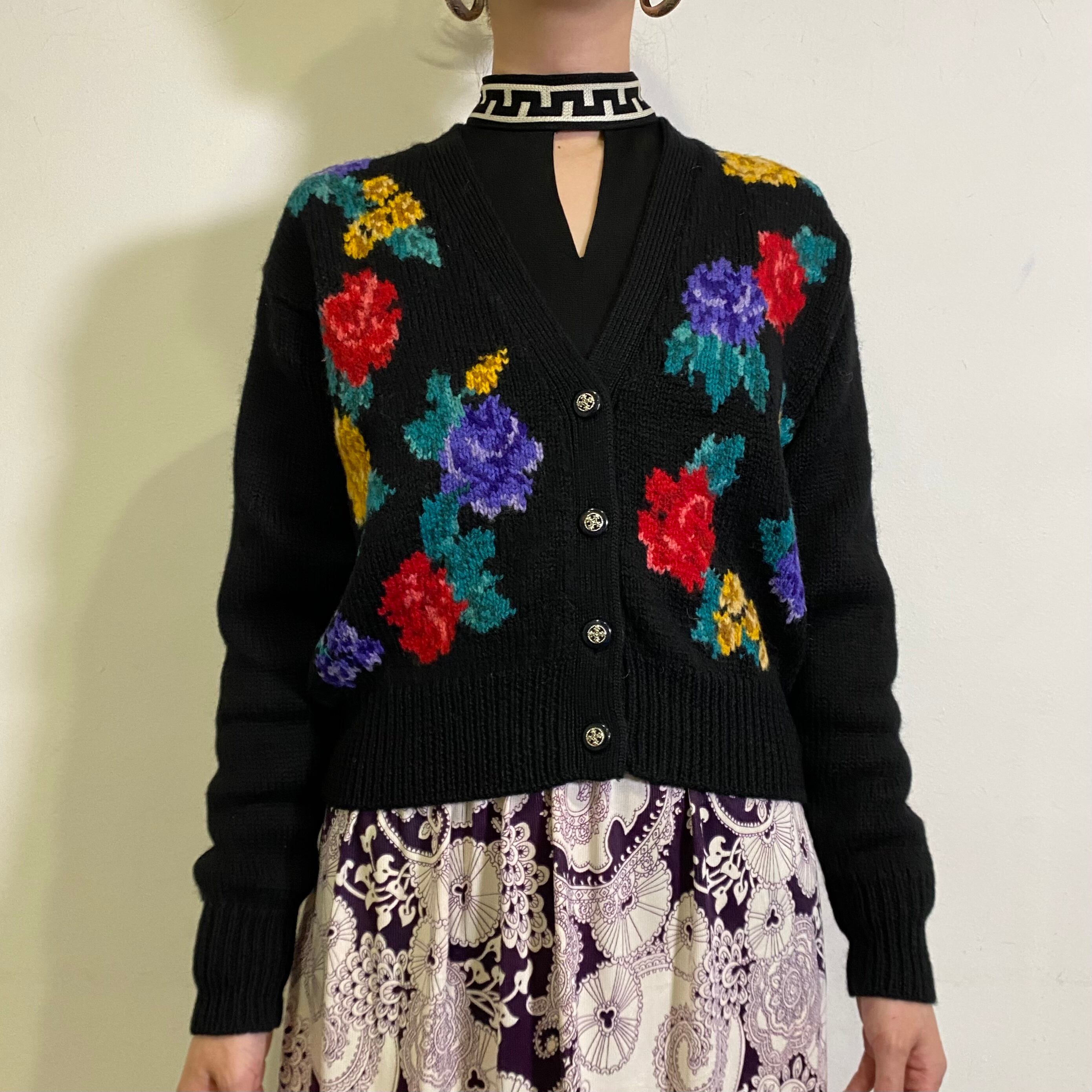 ブラックベースにカラフルなお花のモチーフが映える、80年代のニットカーディガンです。