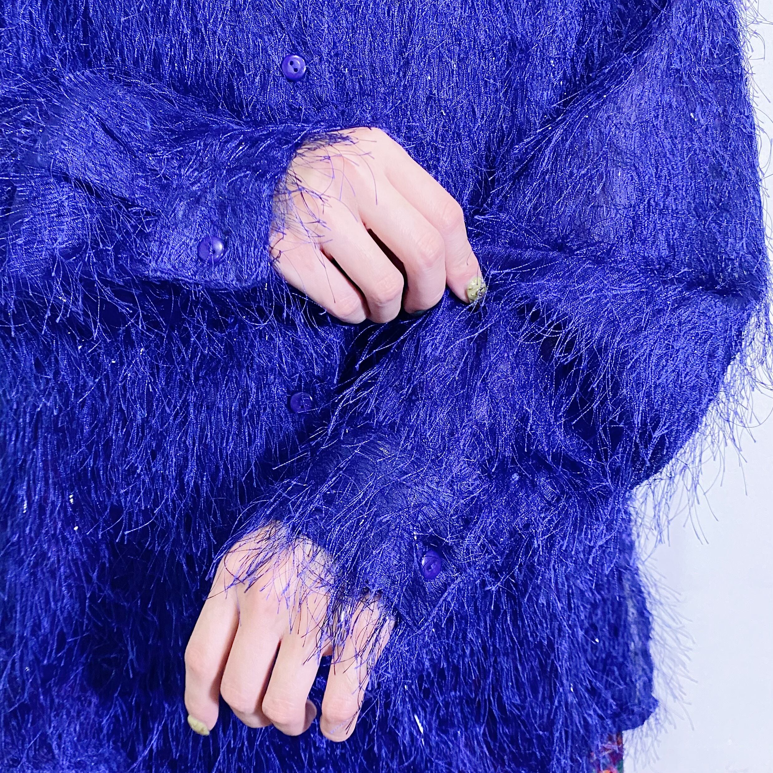 ブルーとパープルの中間のような絶妙な色合いも可愛く、モードな雰囲気のある一枚。