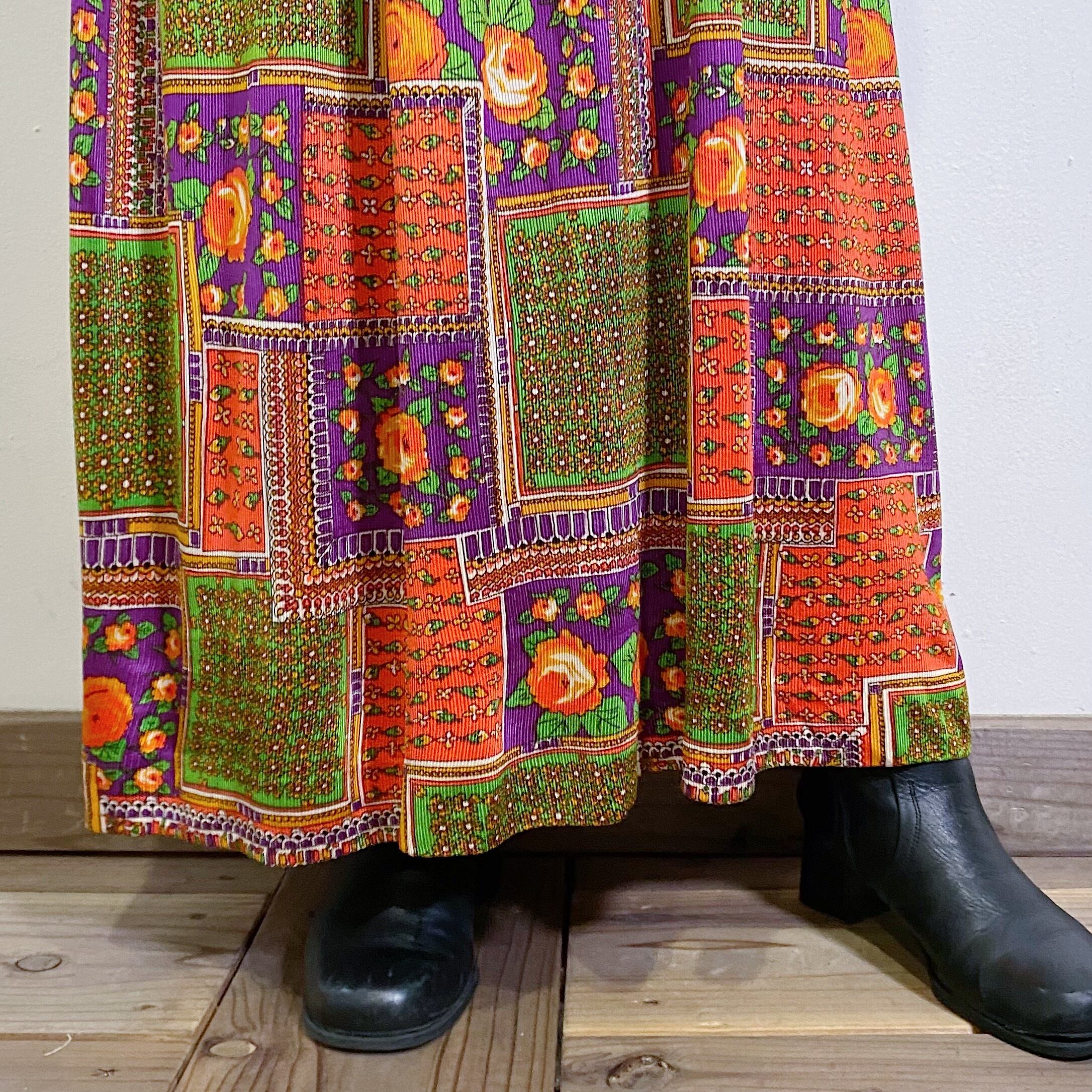 パッチワークプリントのような花柄に、ロング丈で大人可愛く着ていただけますよ。