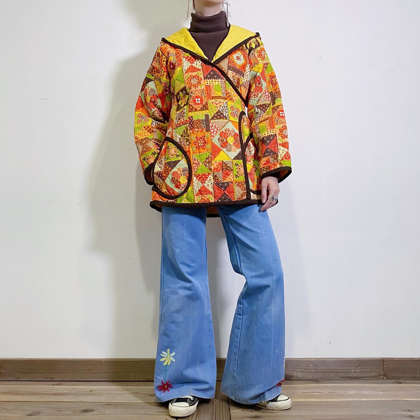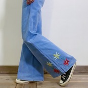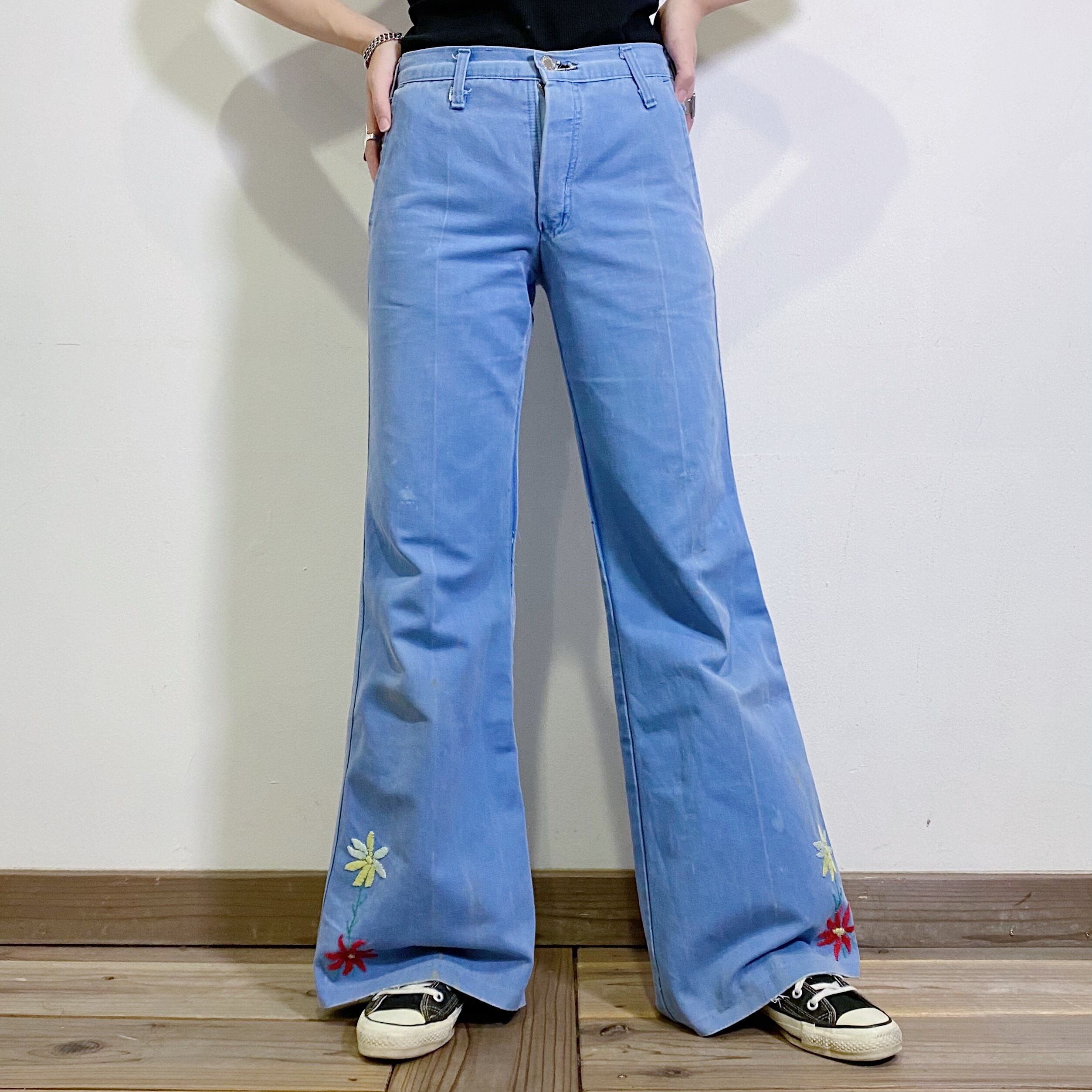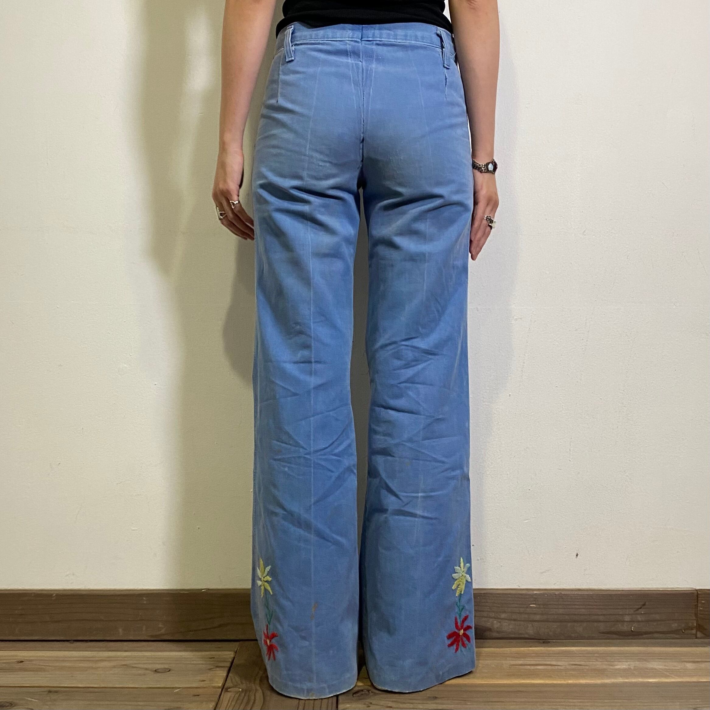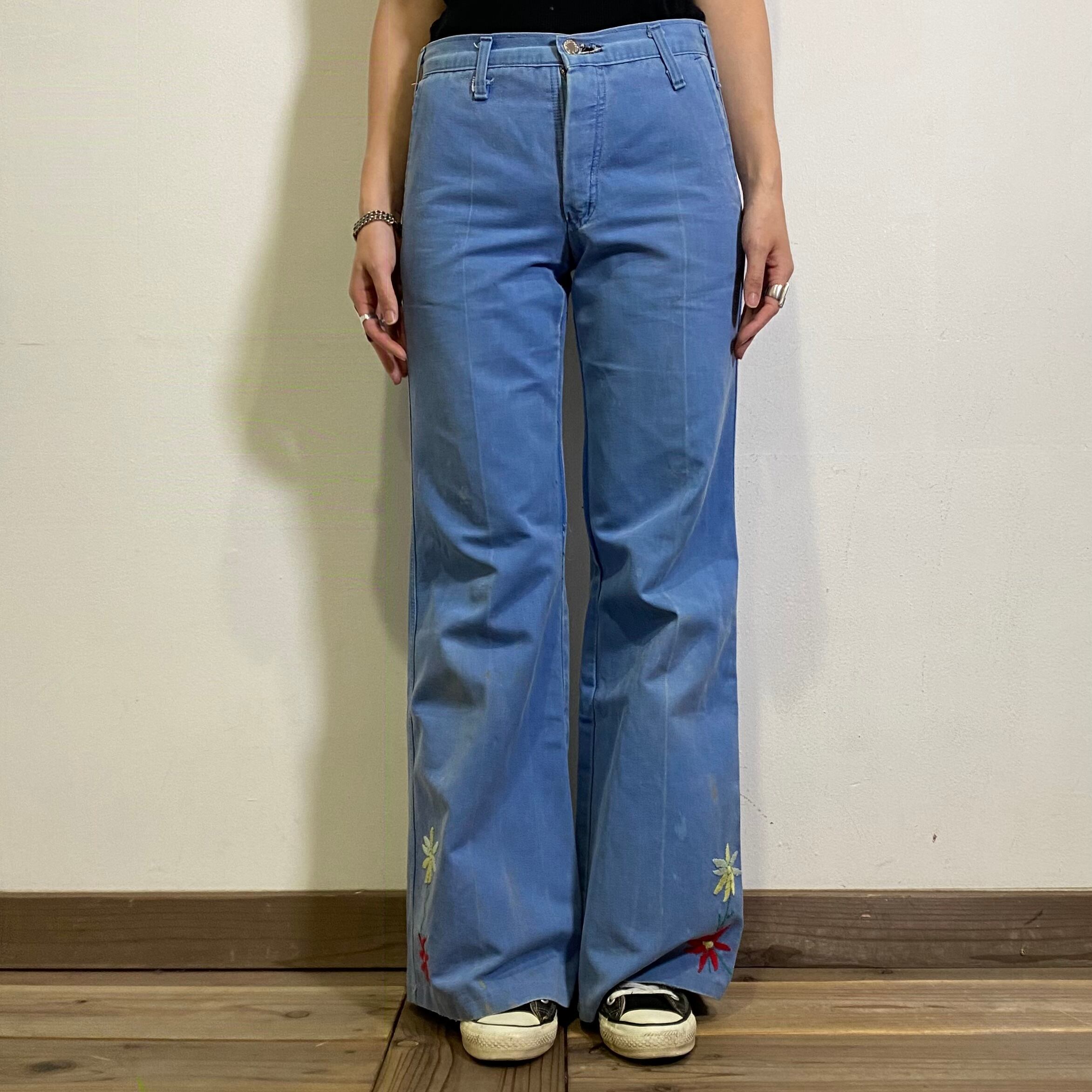 裾に施されたお花の刺繍が可愛い、70年代のデニムフレアパンツです。
