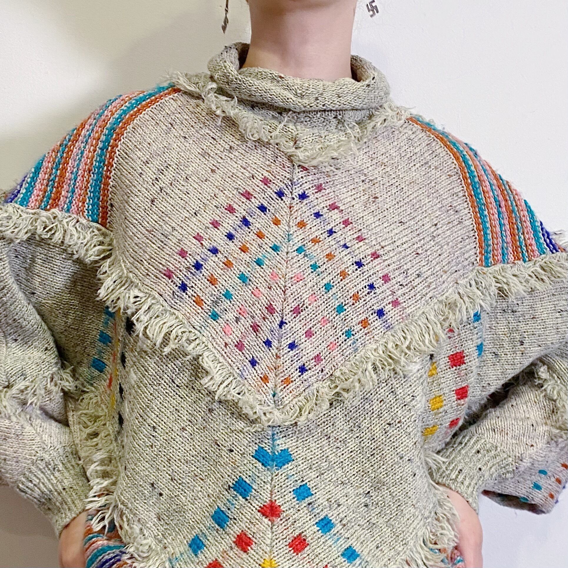 ゆったりとしたドルマンスリーブにハイネックやフリンジデザインが可愛い、80年代のニットセーターです。