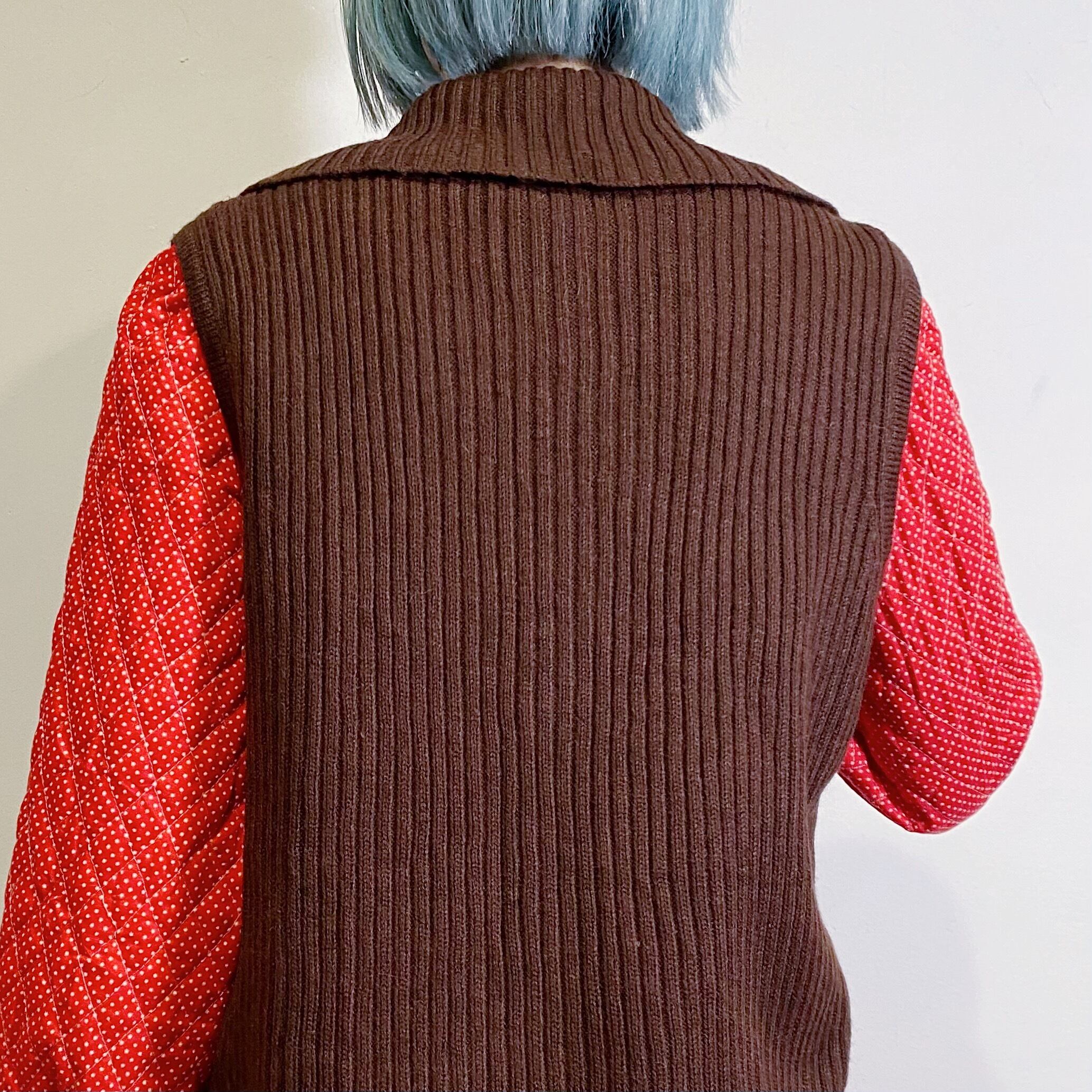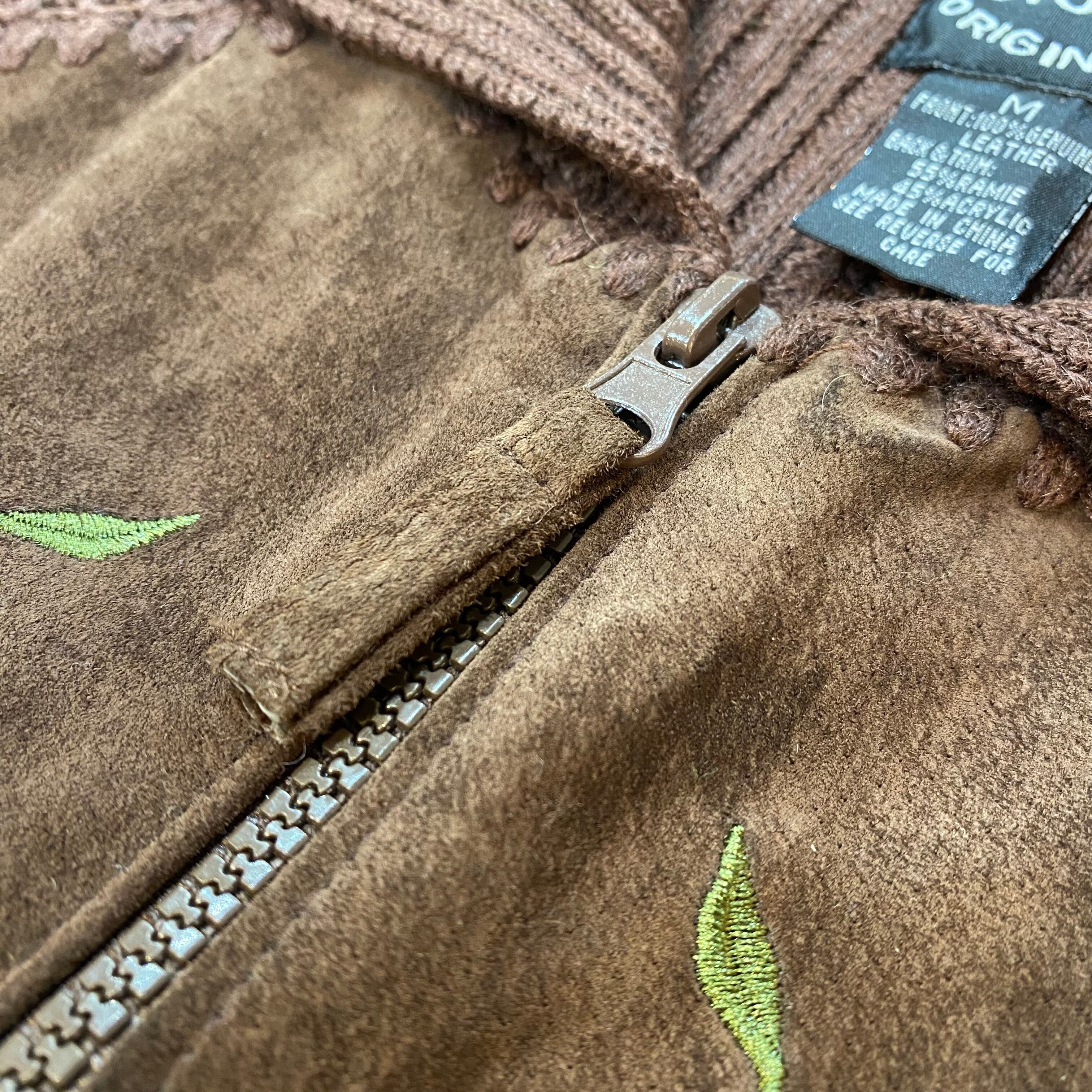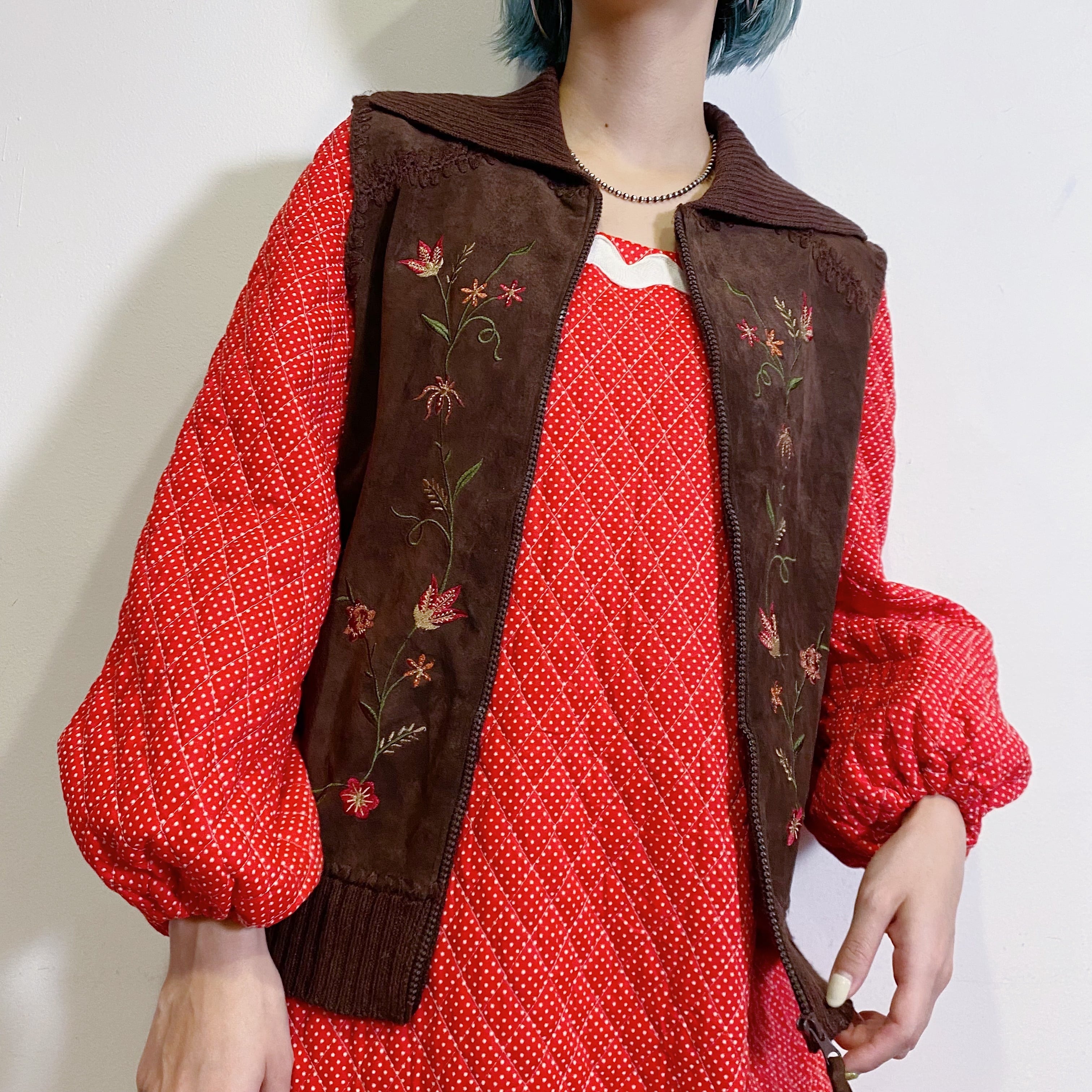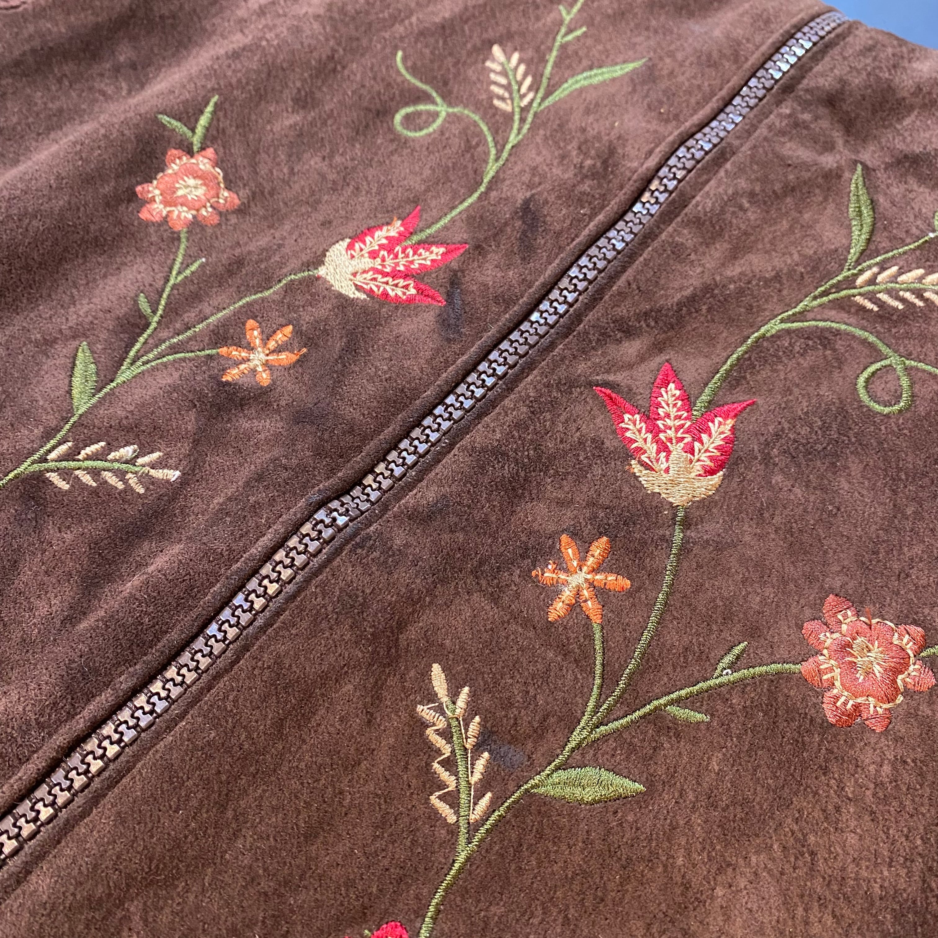 こっくりとしたブラウンベースにお花の刺繍が可愛い、ジップアップベストです。