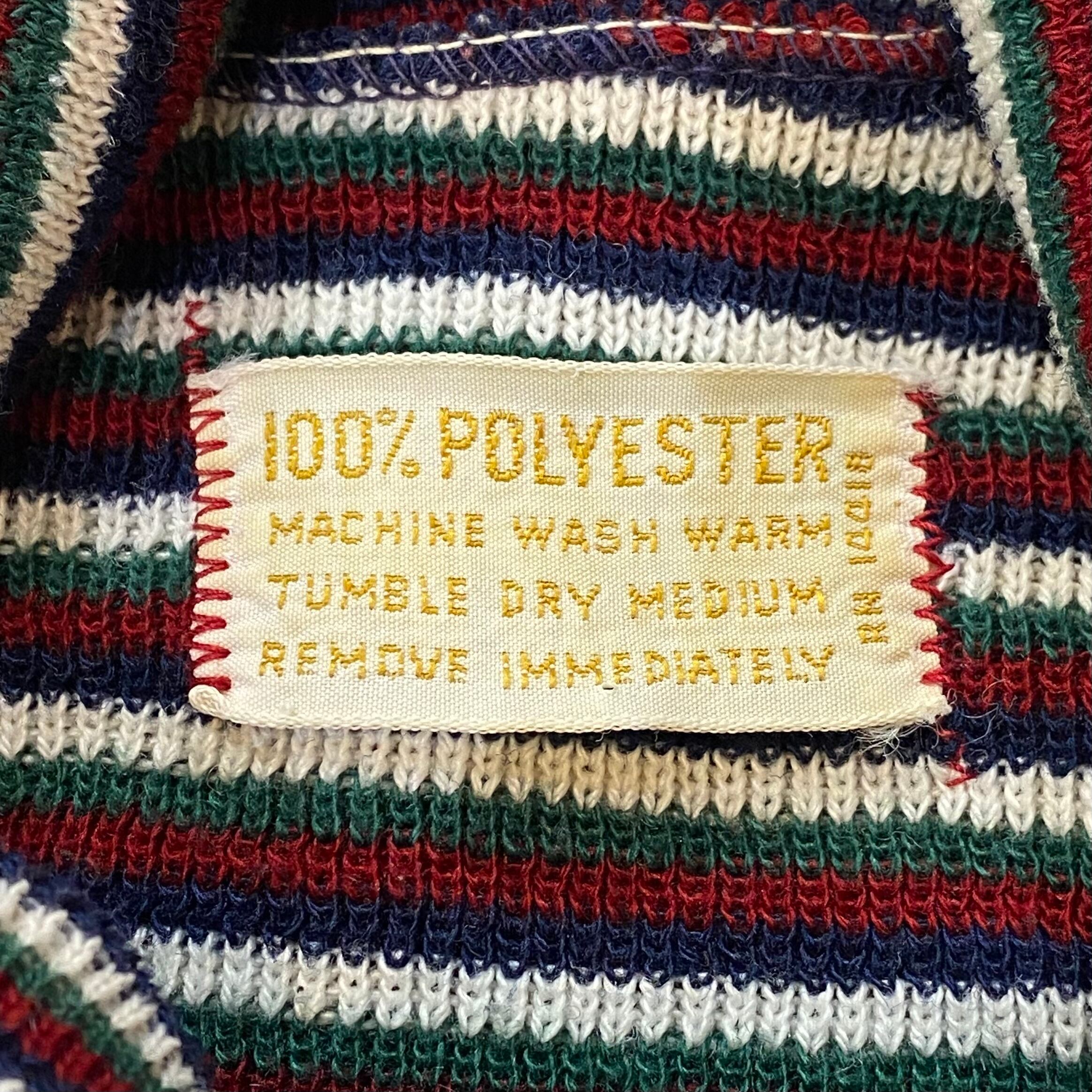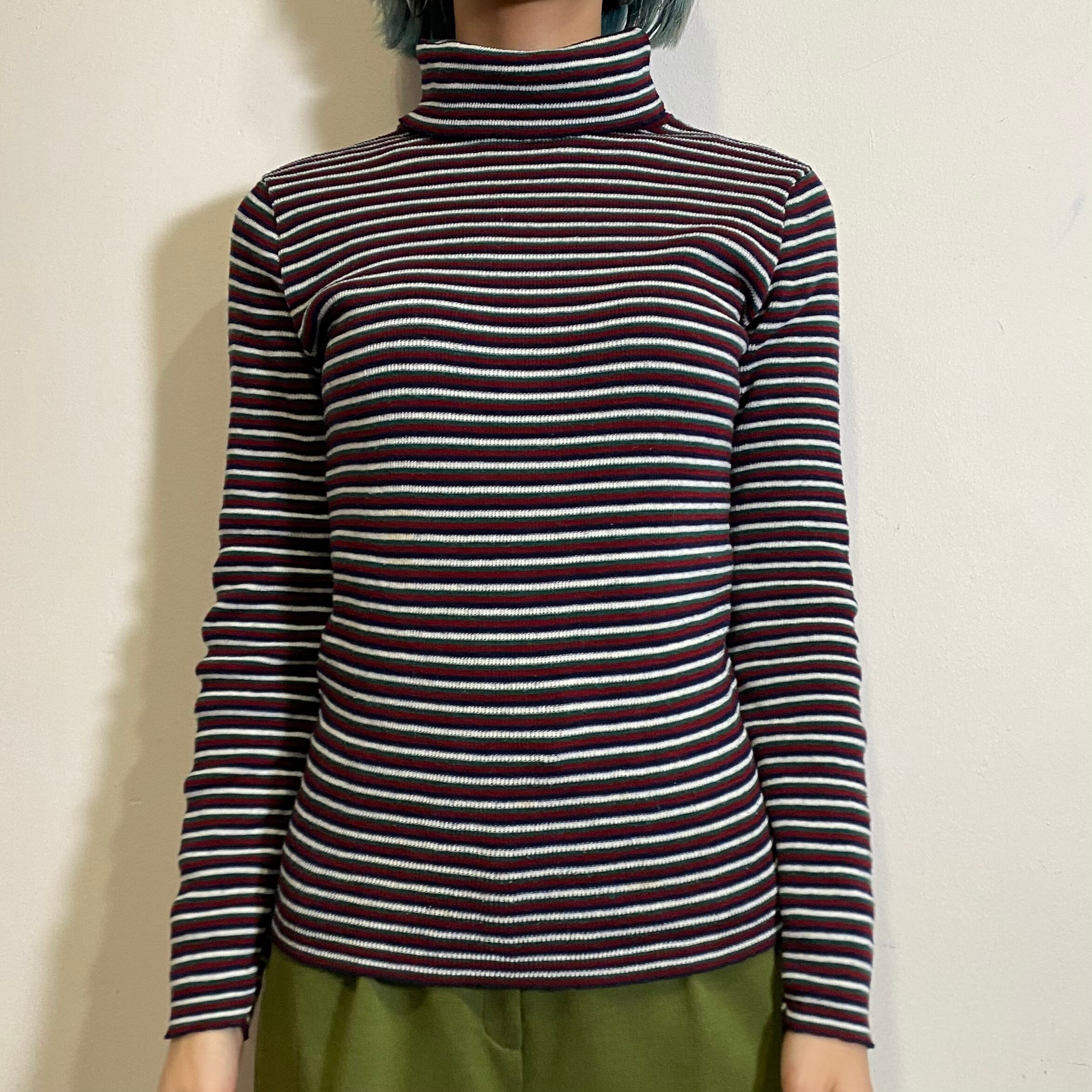 グリーン・ボルドー・ネイビーの細かいボーダーが可愛い、70年代のタートルネックトップスです。
