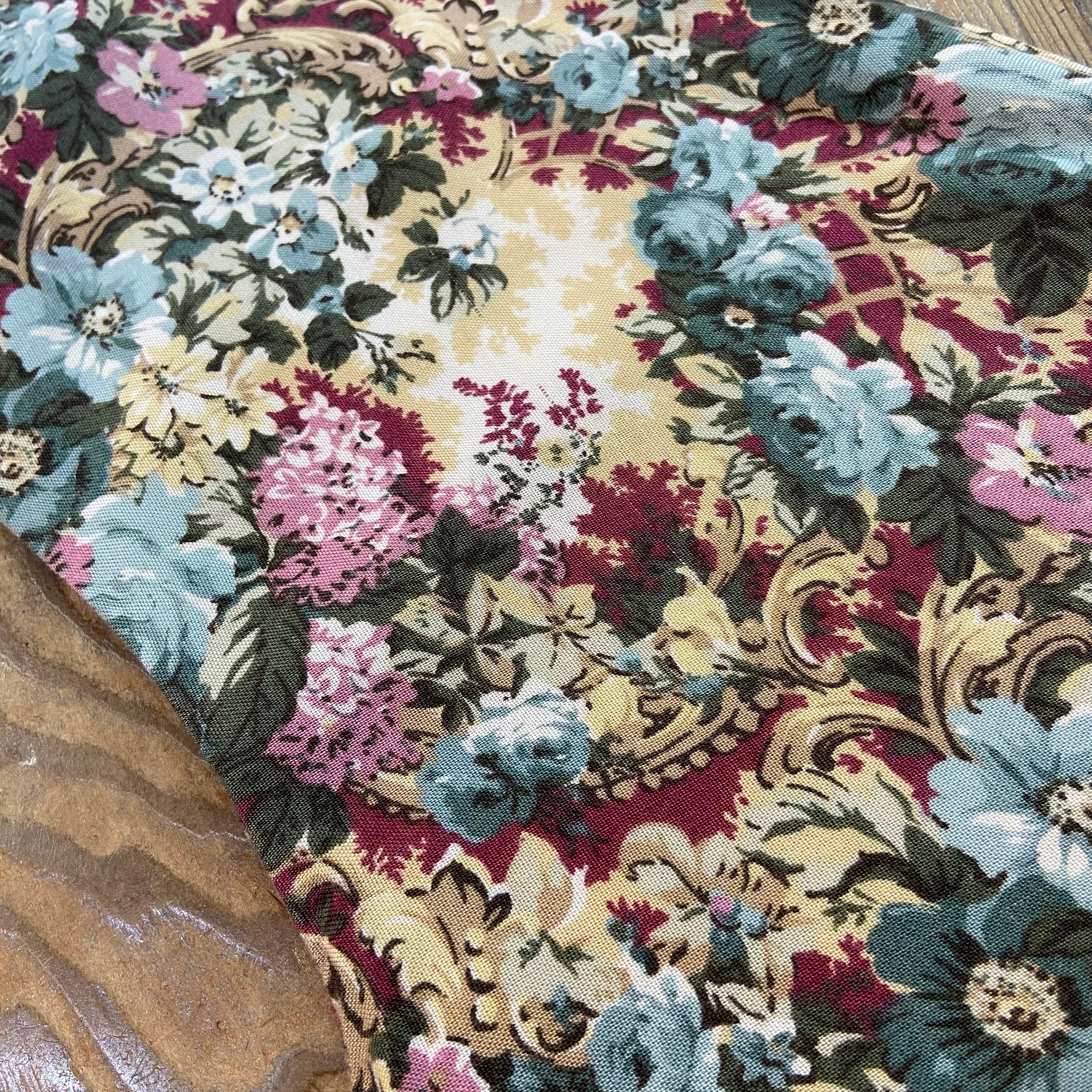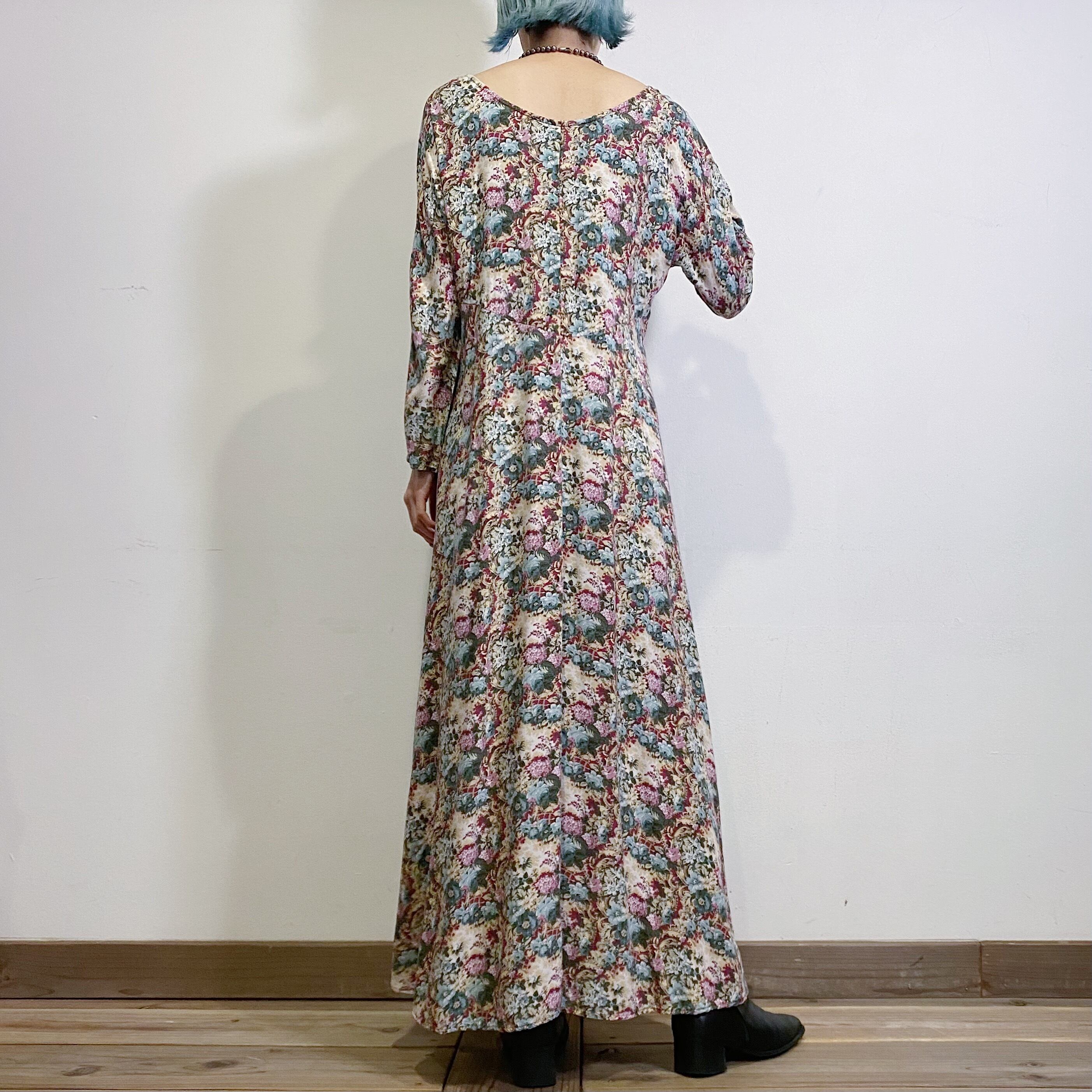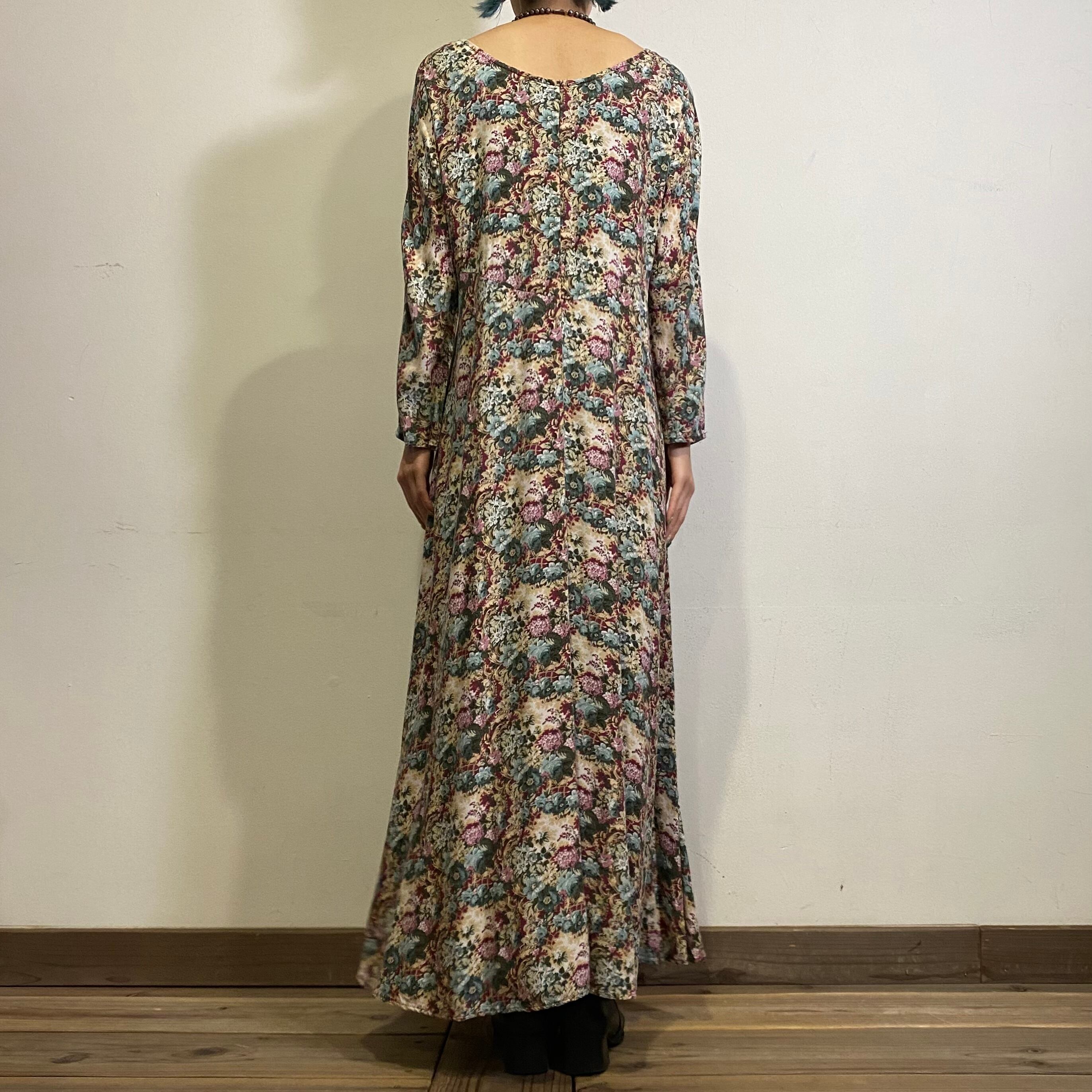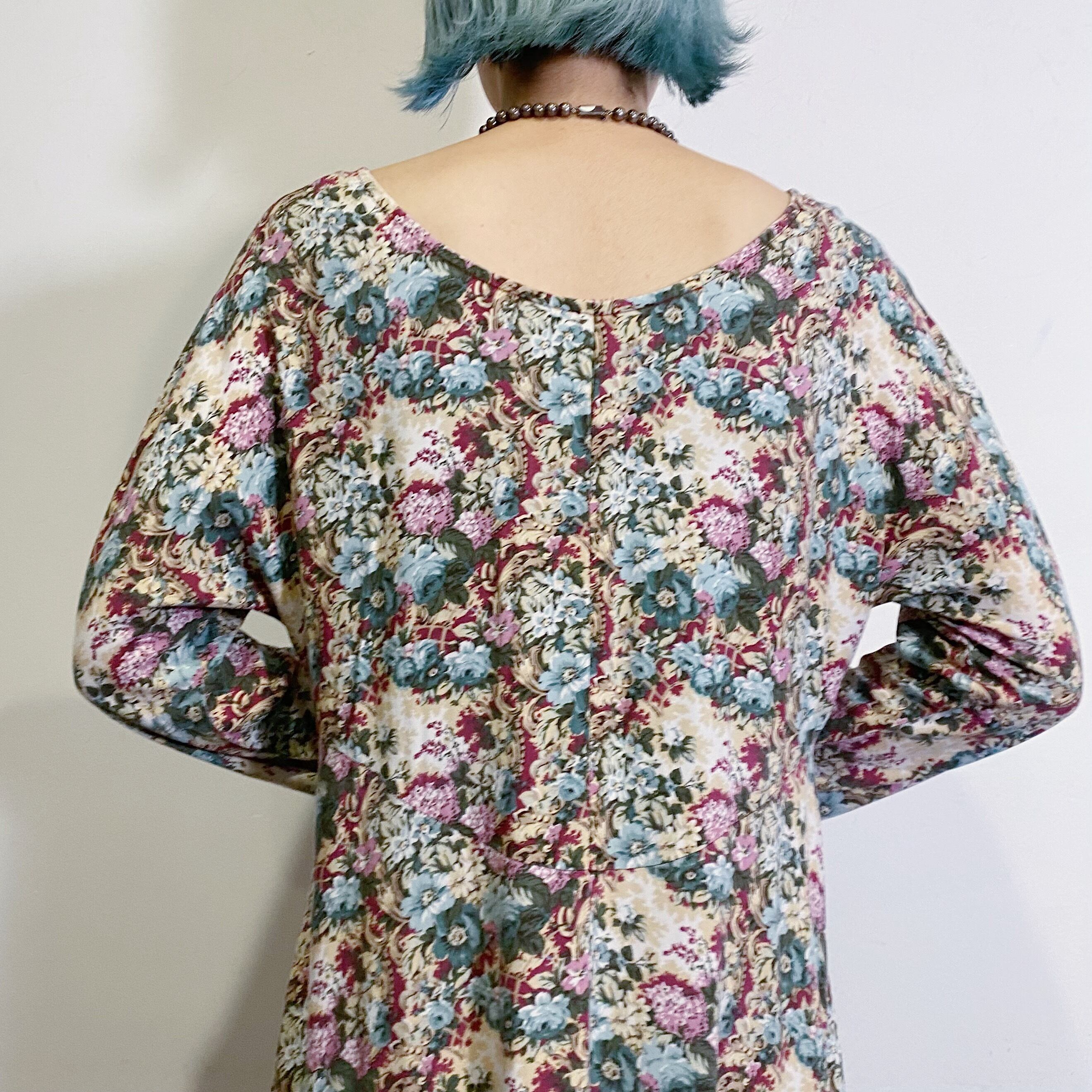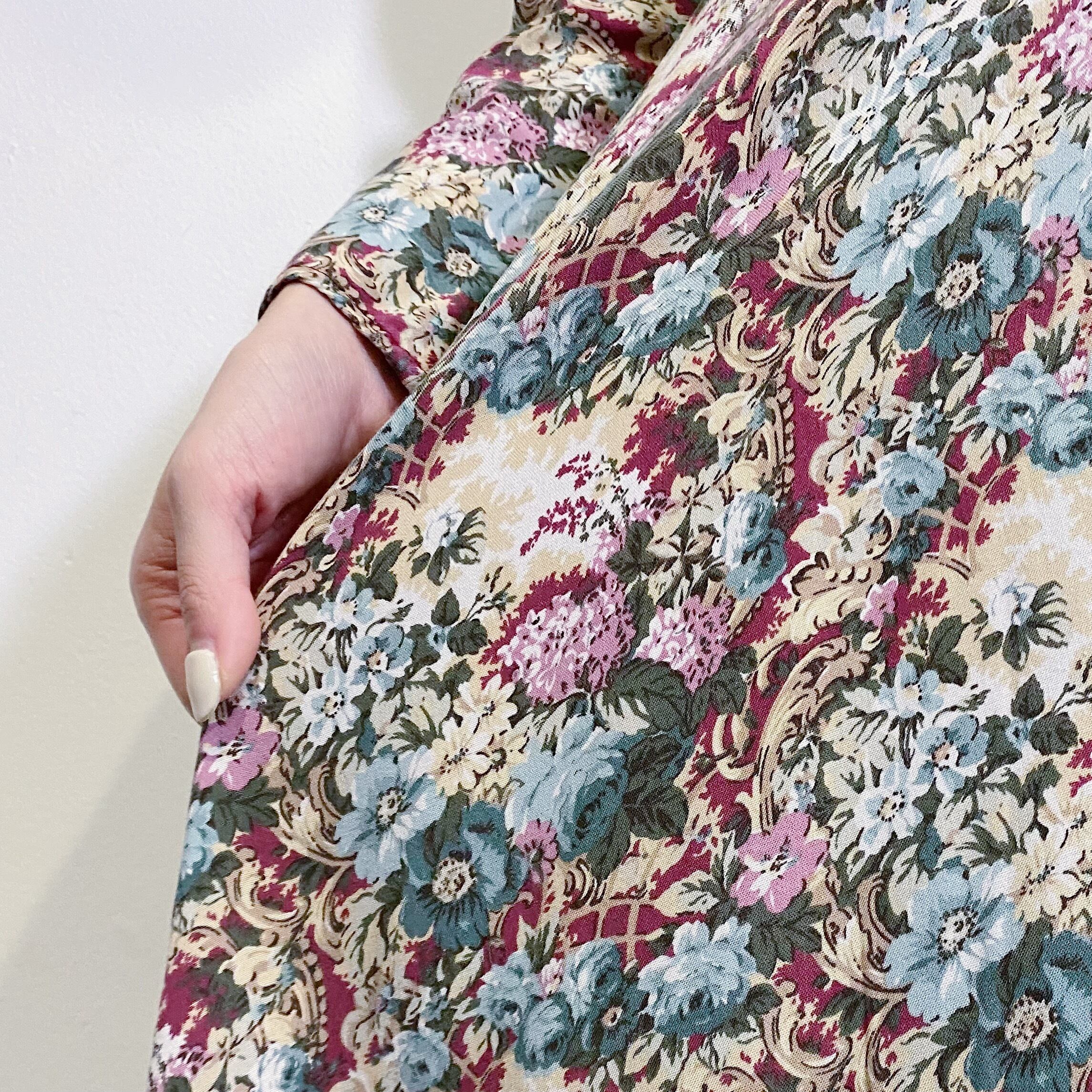 ブルーやイエロー・レッドの花柄の色合いが素敵な、80年代のワンピースです。