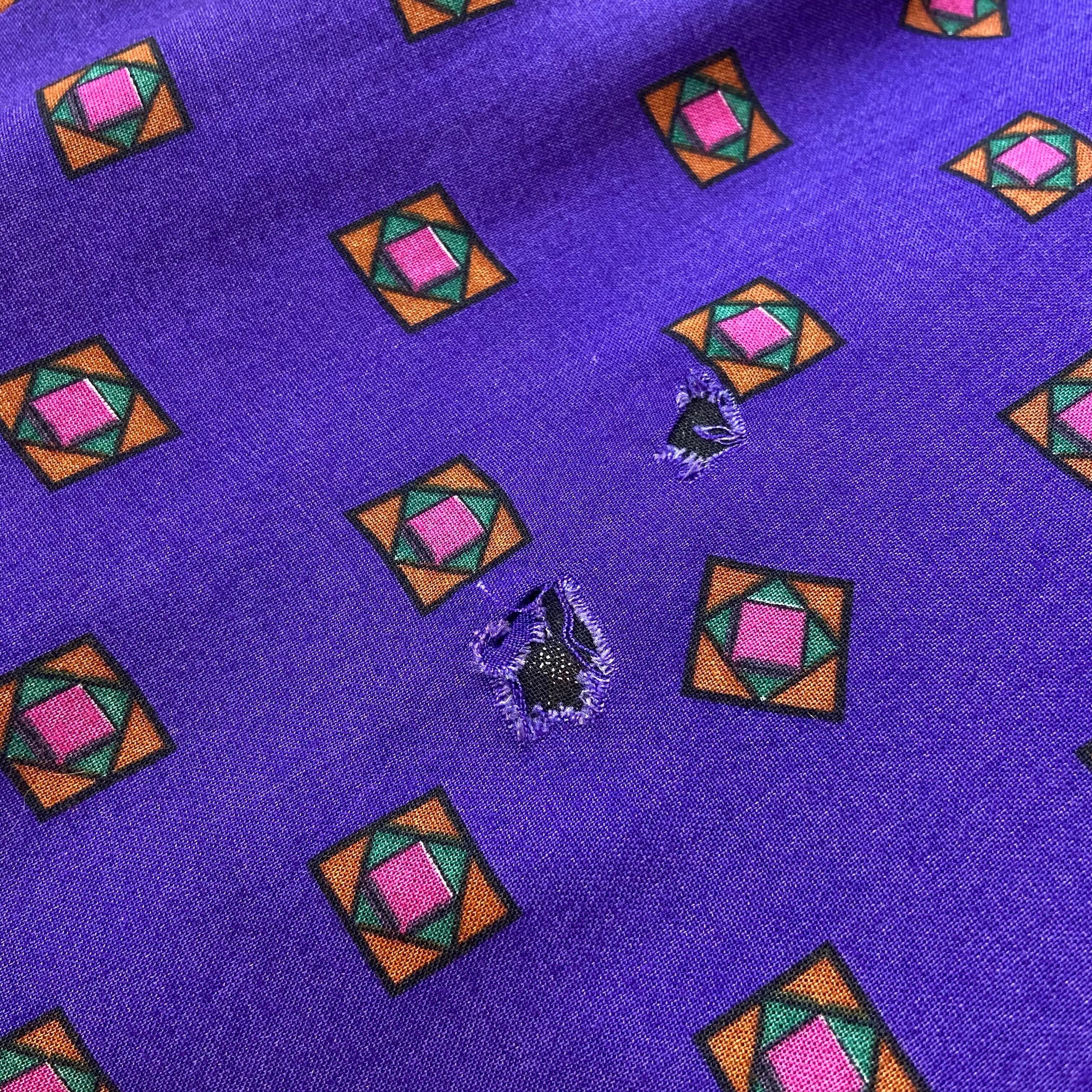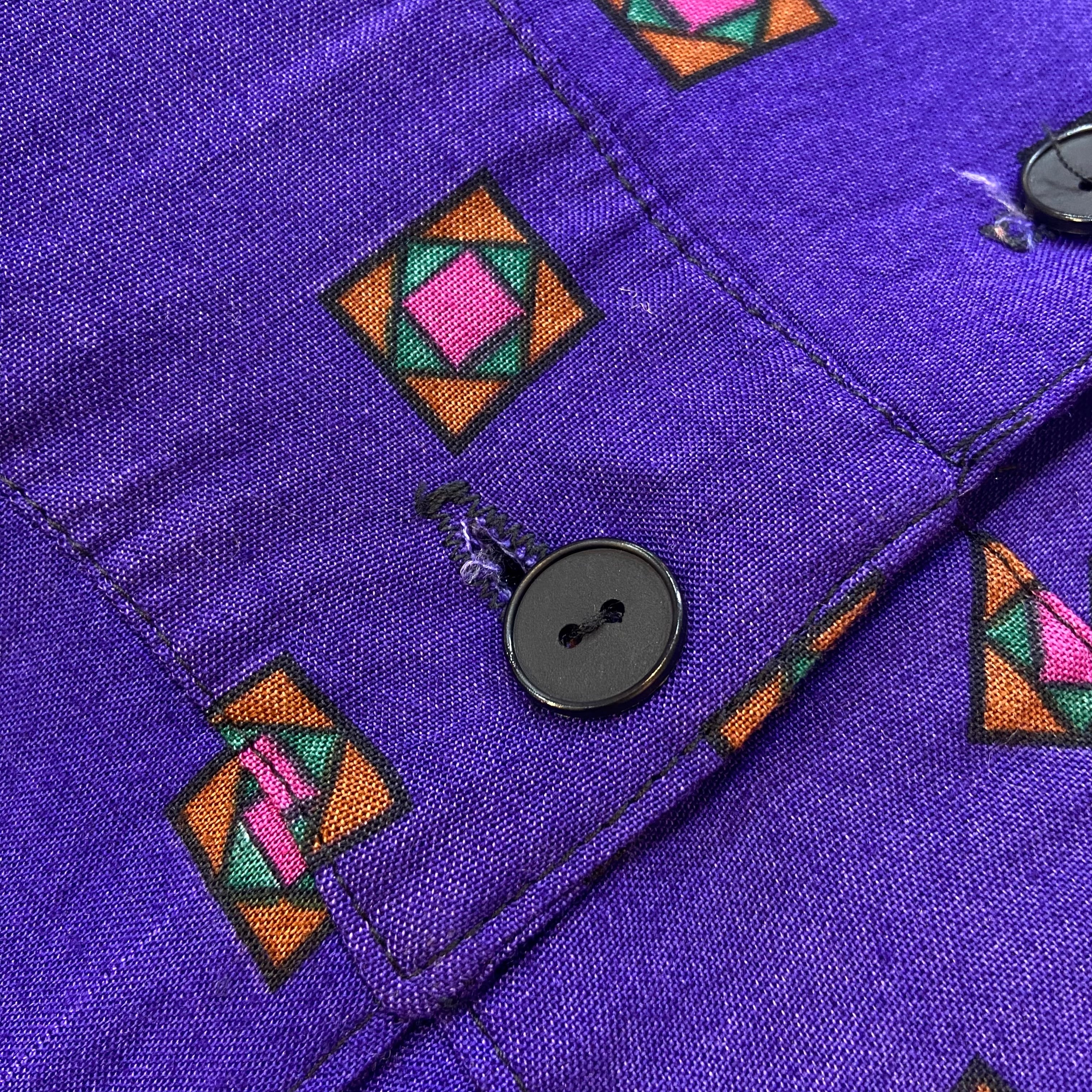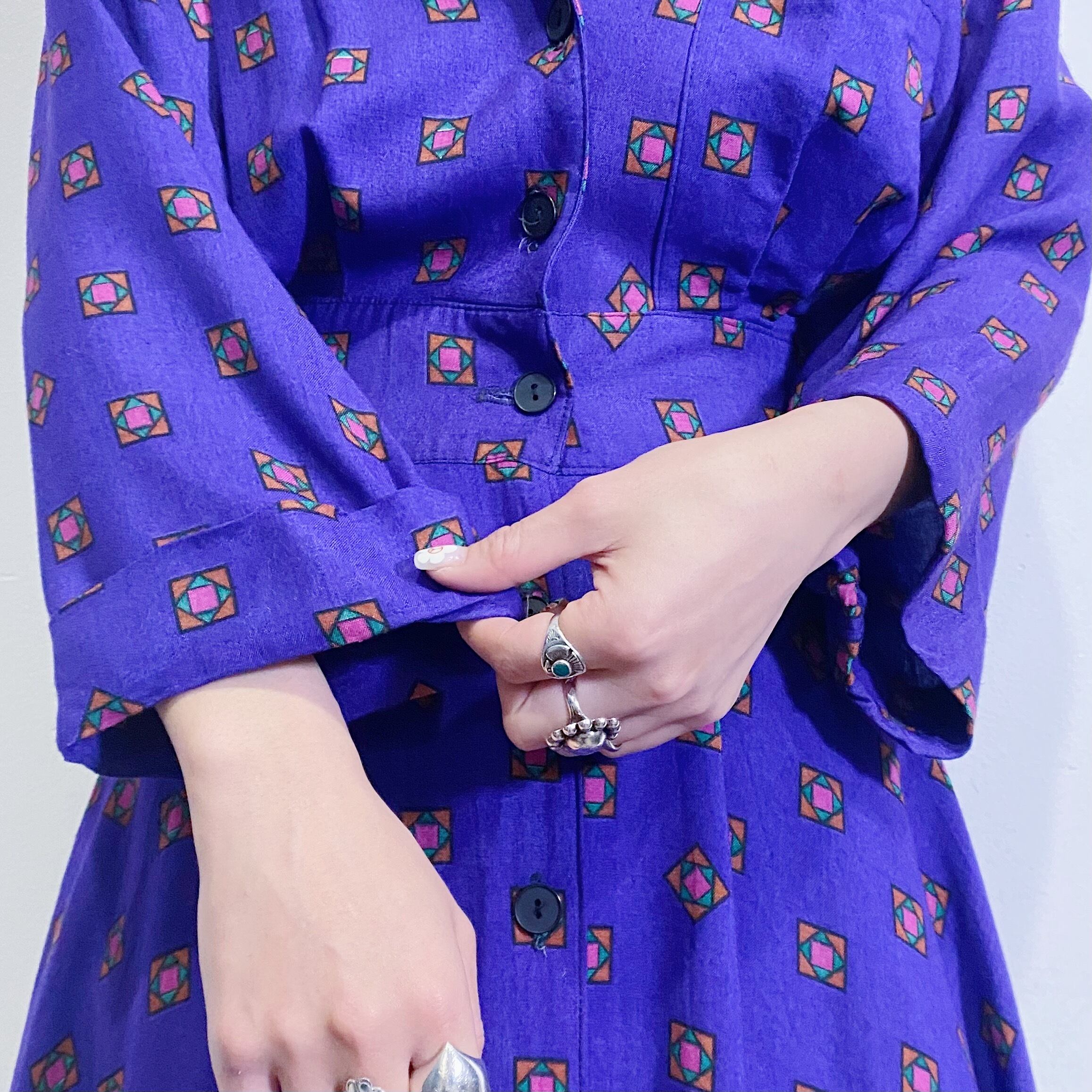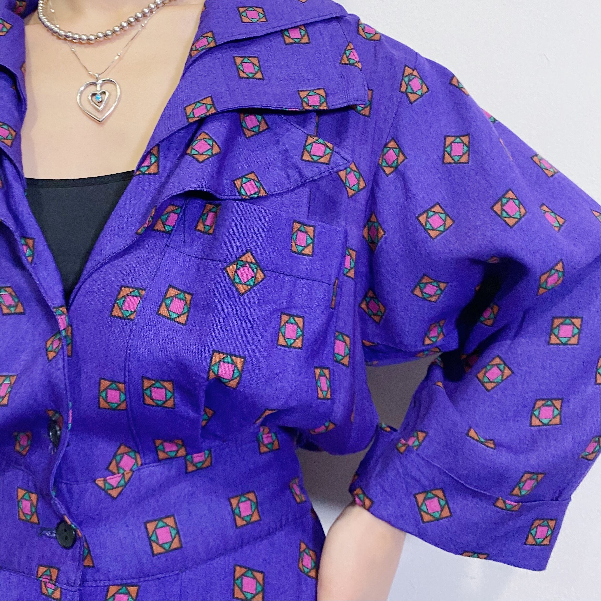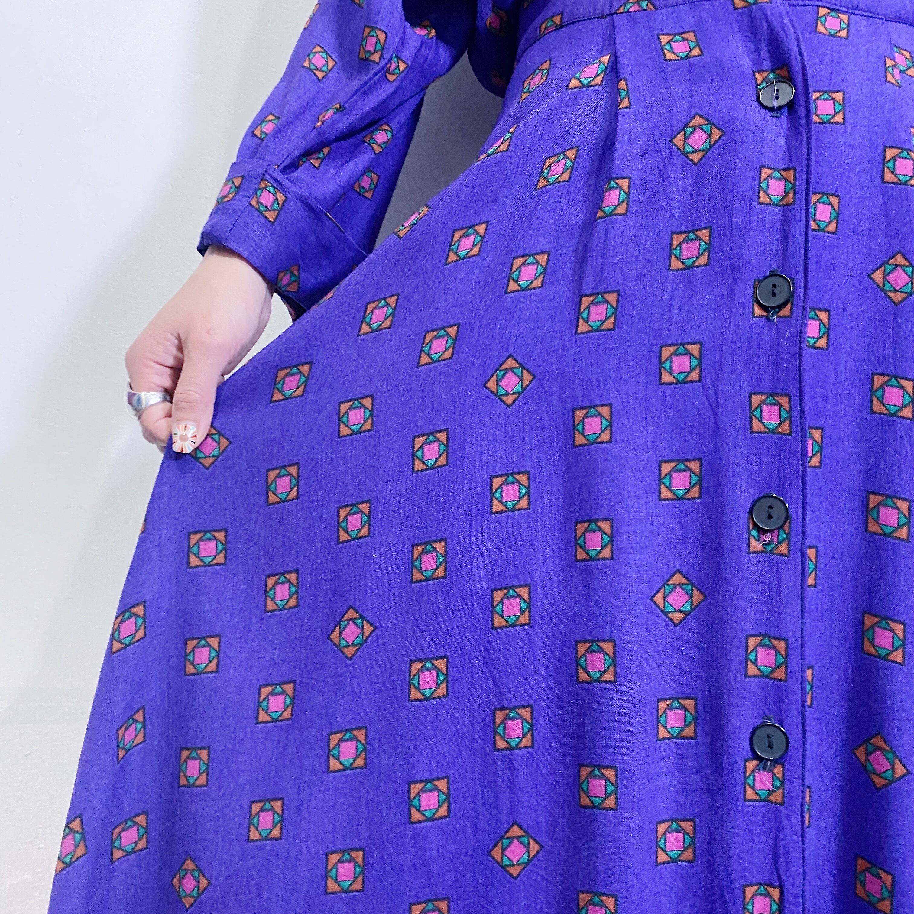 パープルカラーにオレンジとグリーンの幾何学柄が可愛い、80年代のワンピースです。