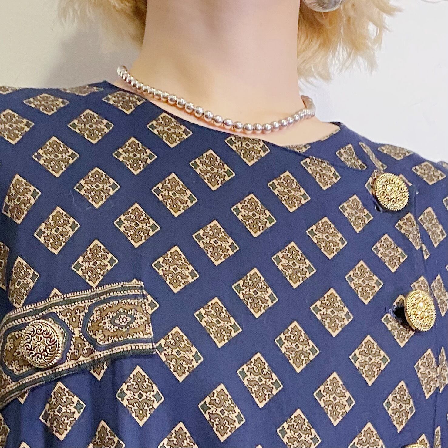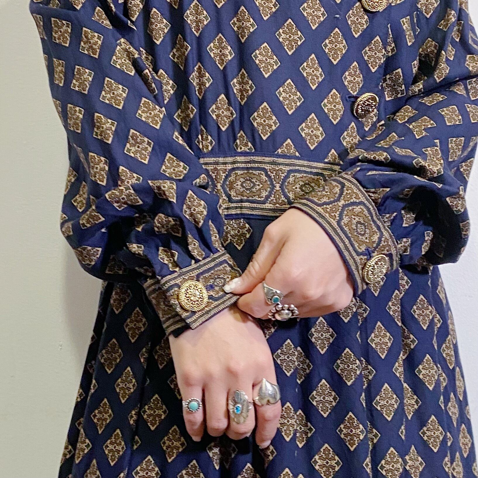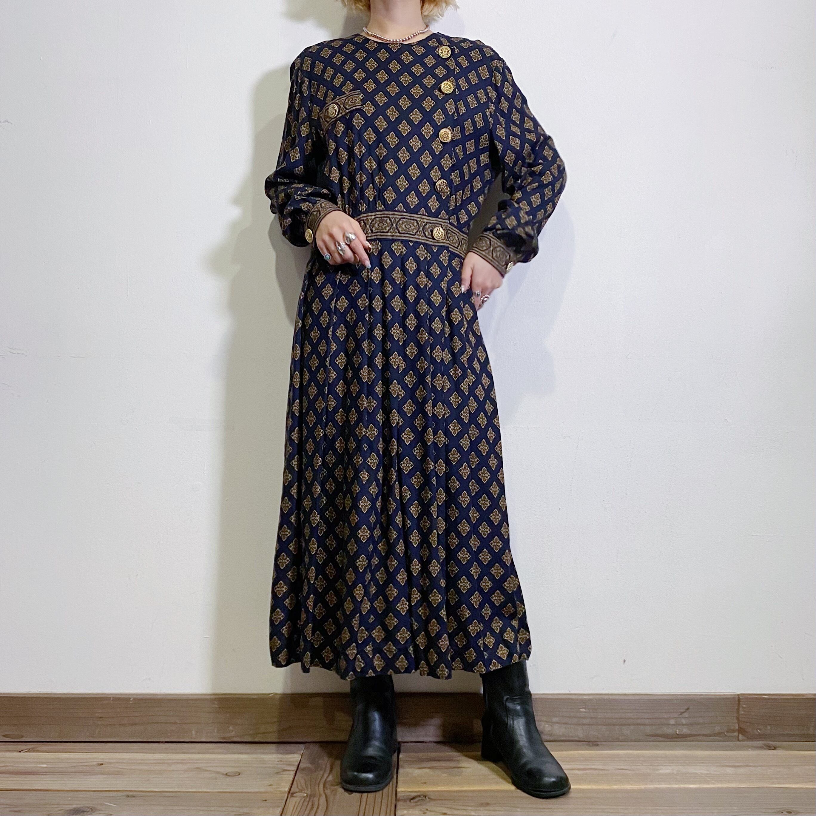 ネイビーベースにクラシカルな雰囲気の柄のが可愛い、80年代ワンピースです。