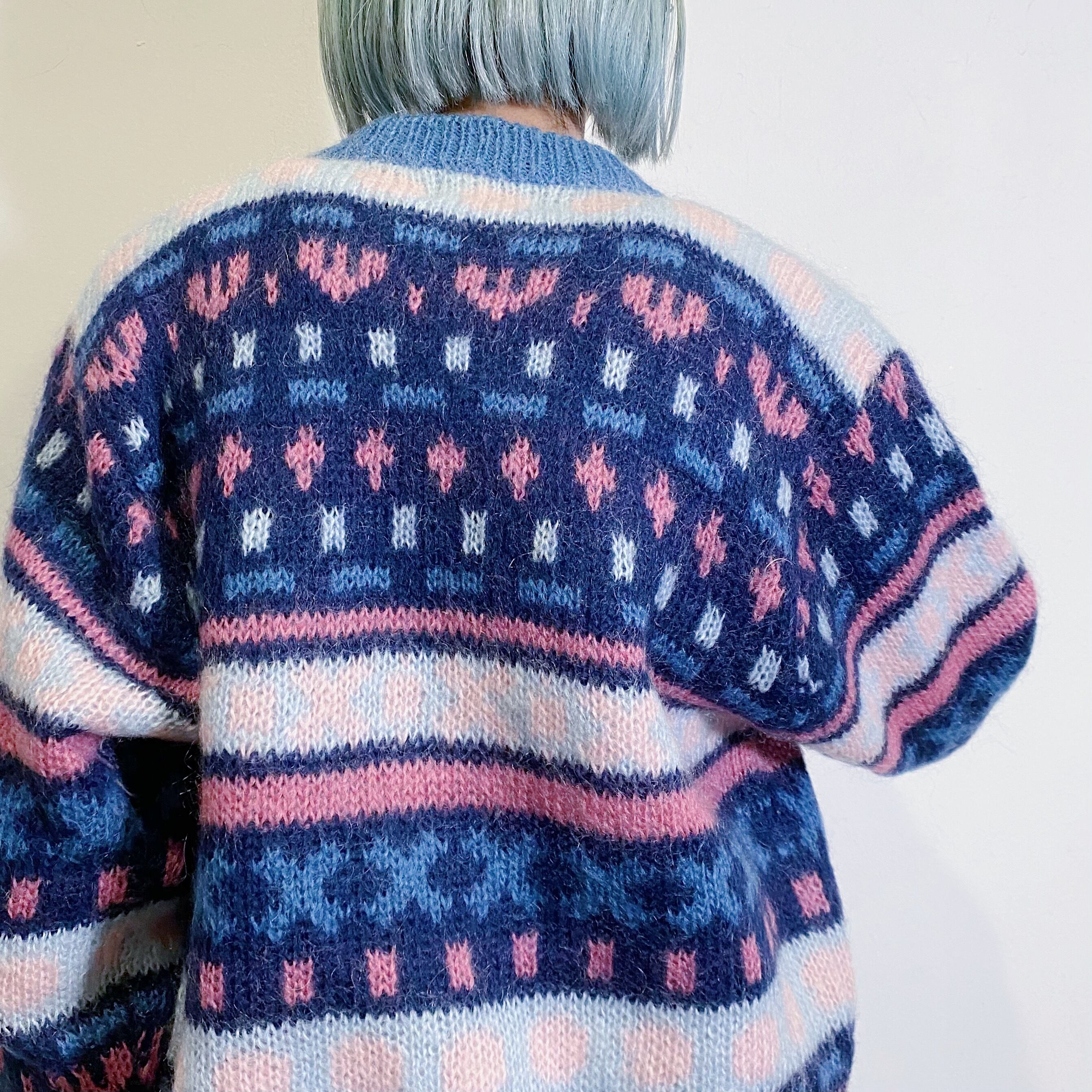 サックスブルーとピンクの色合いが可愛い、80年代のカーディガンです。