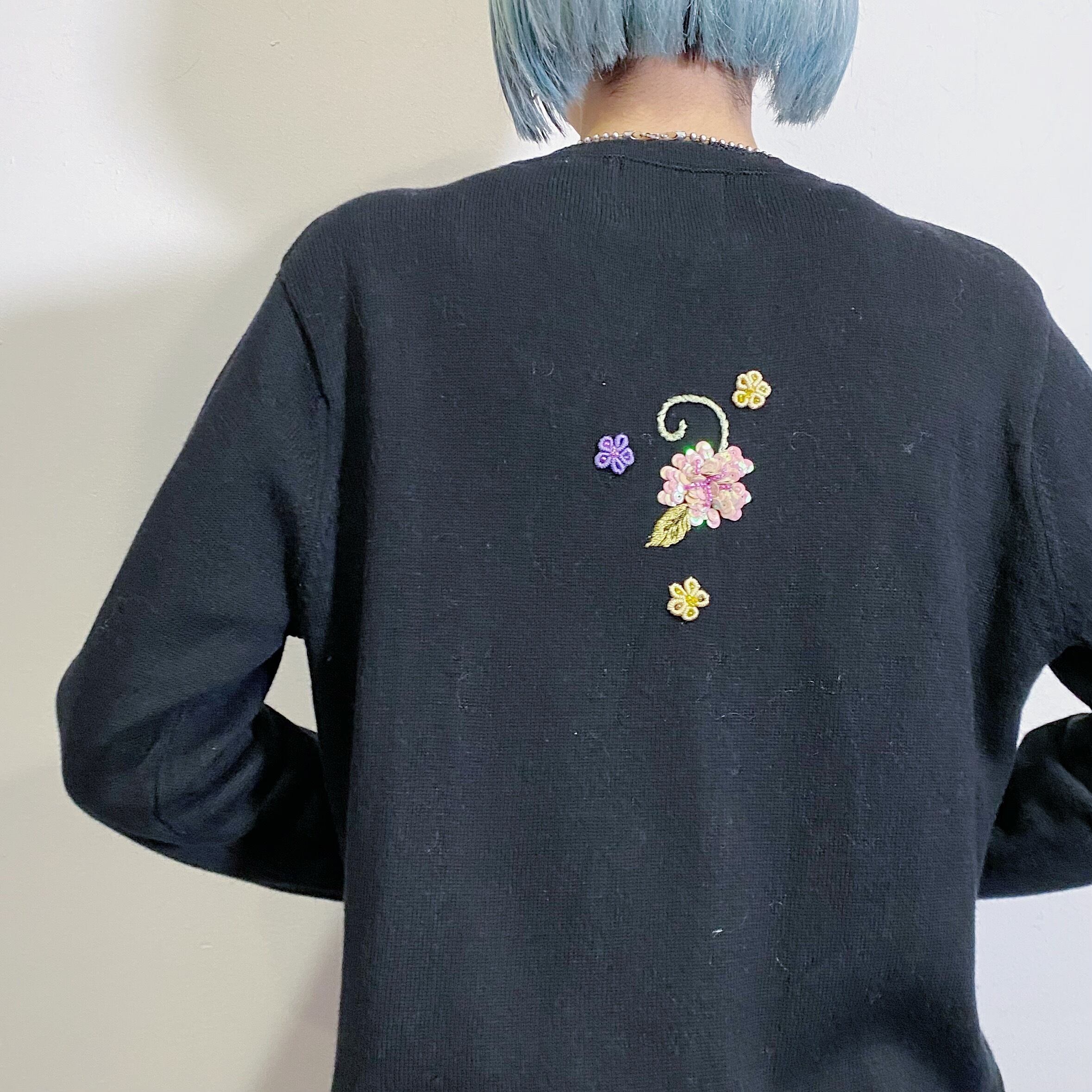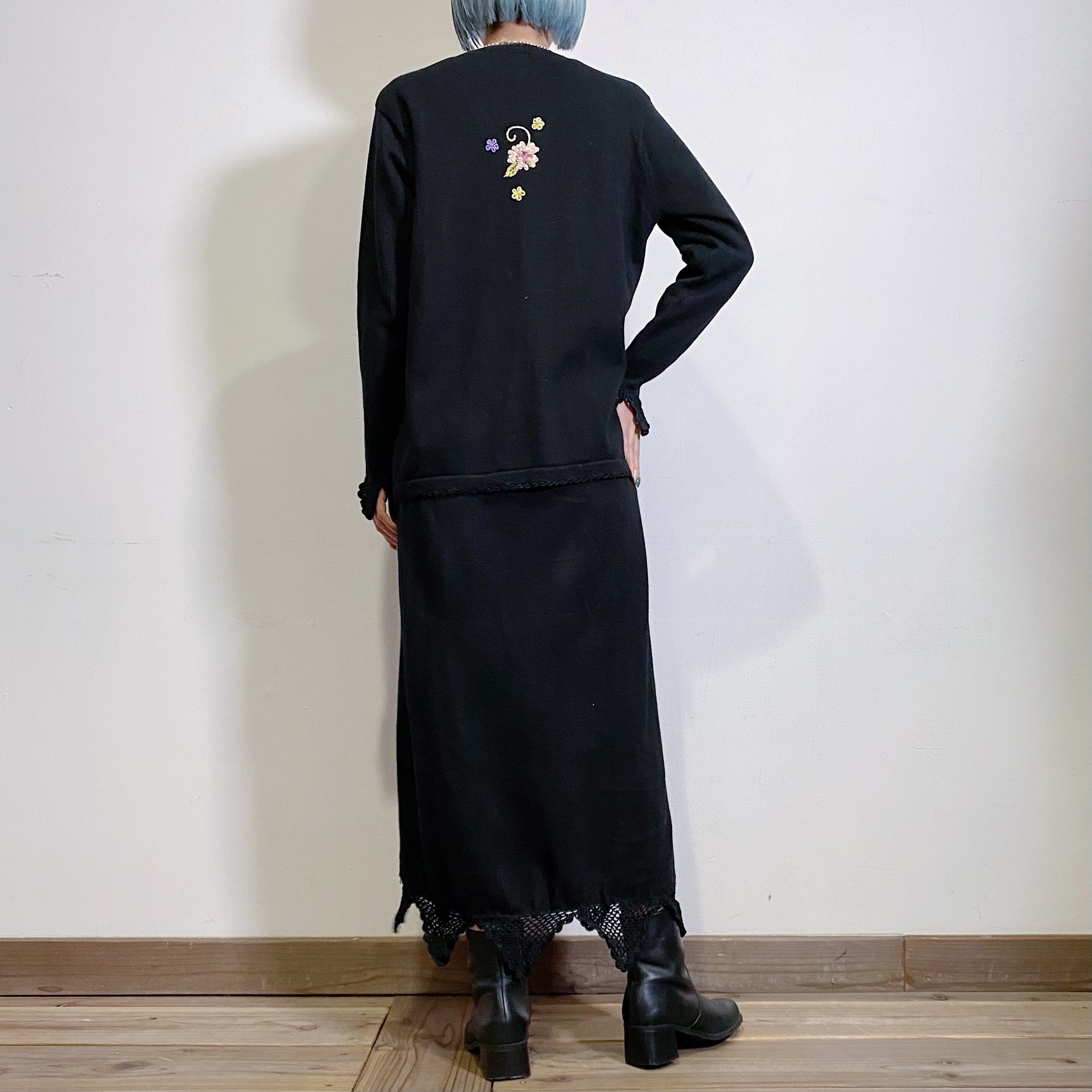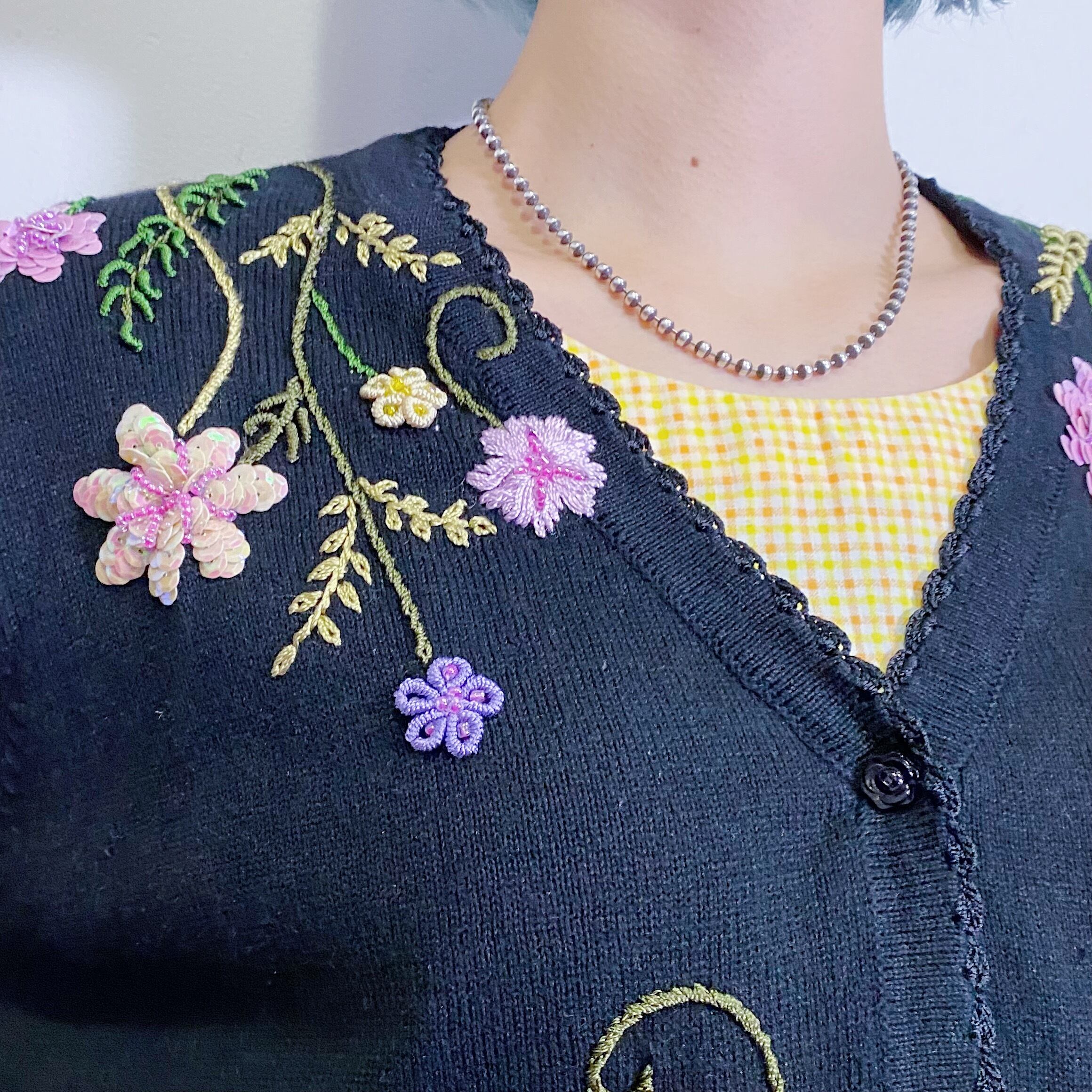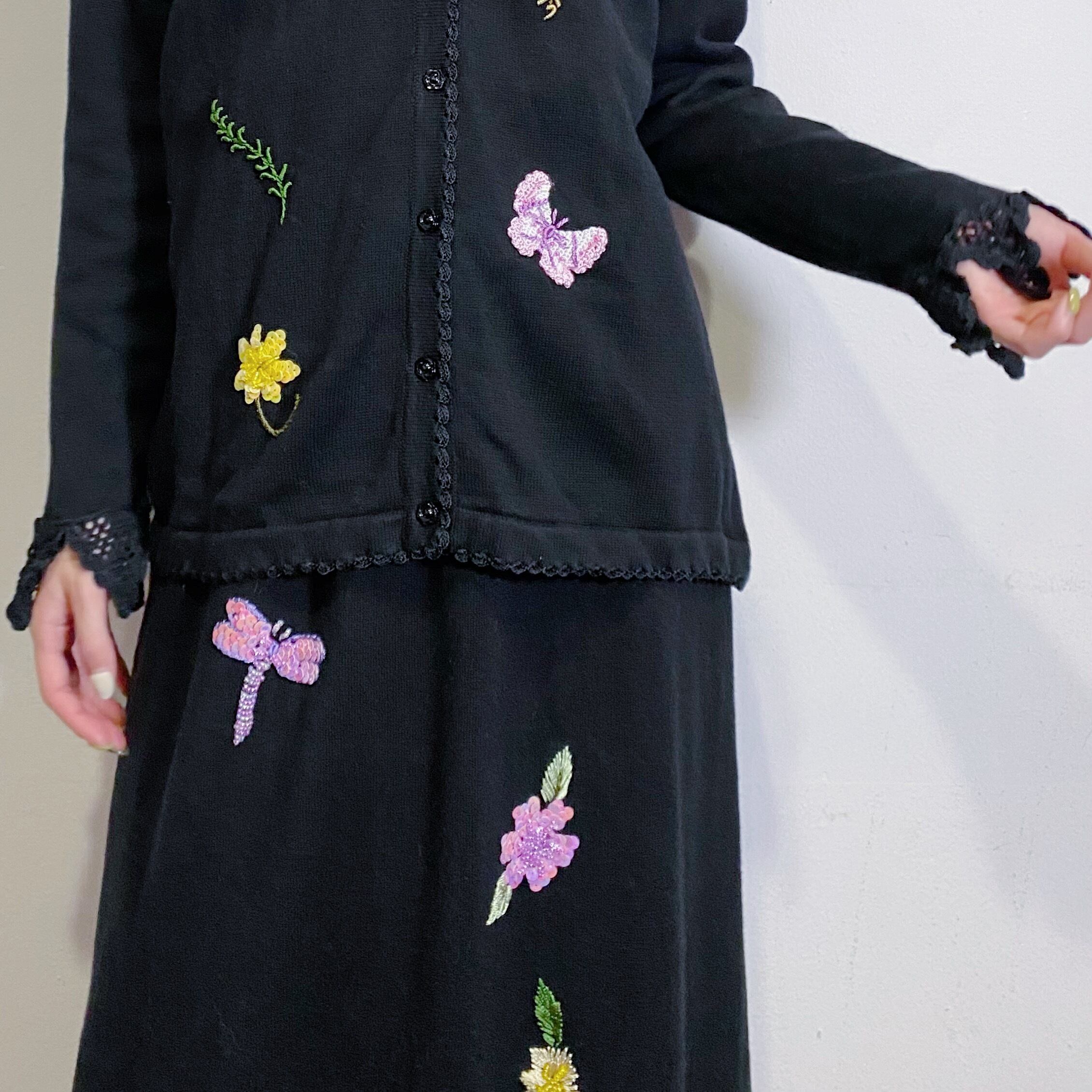 刺繍とビーズで施されたお花や蝶々のモチーフが可愛い、コットンニットのセットアップです。