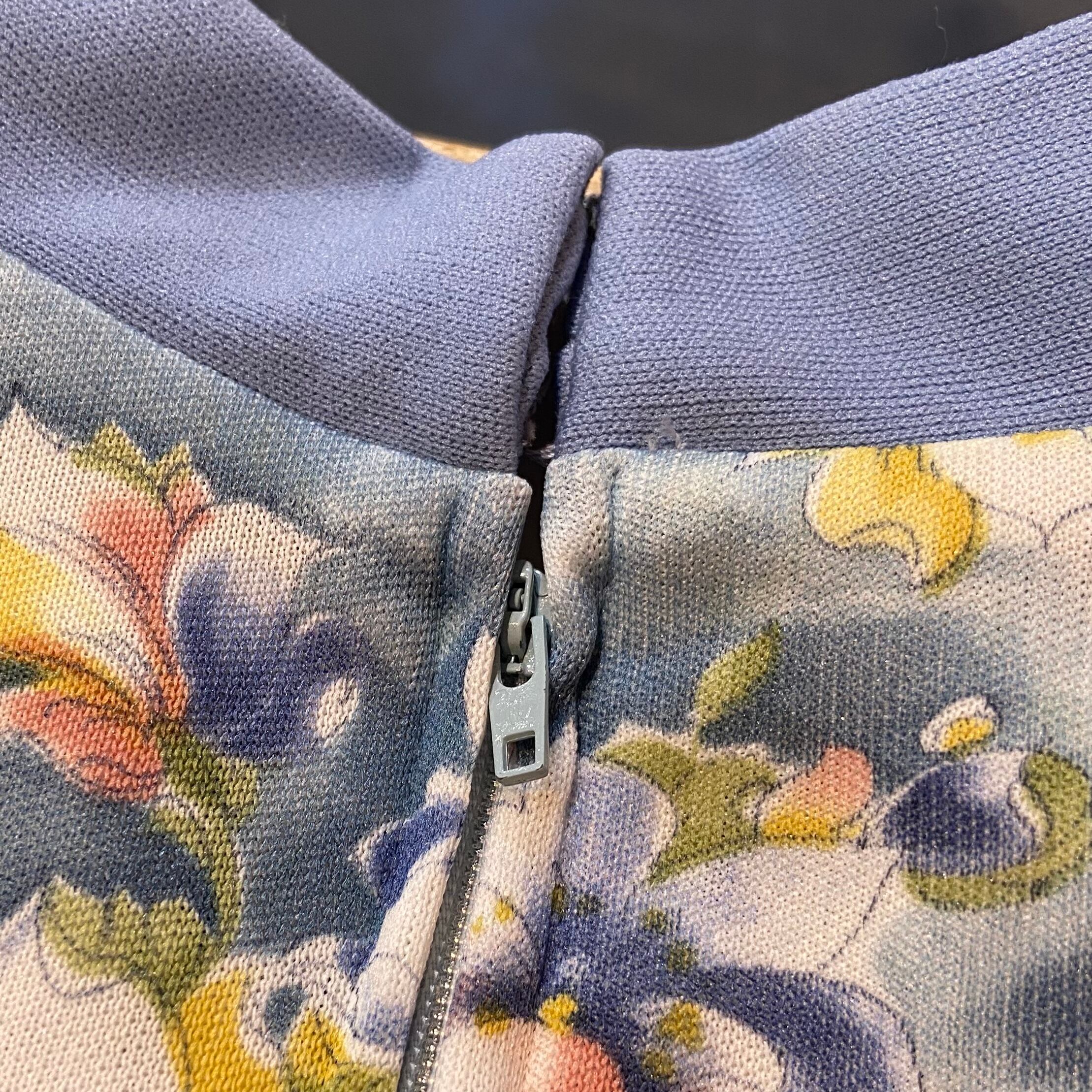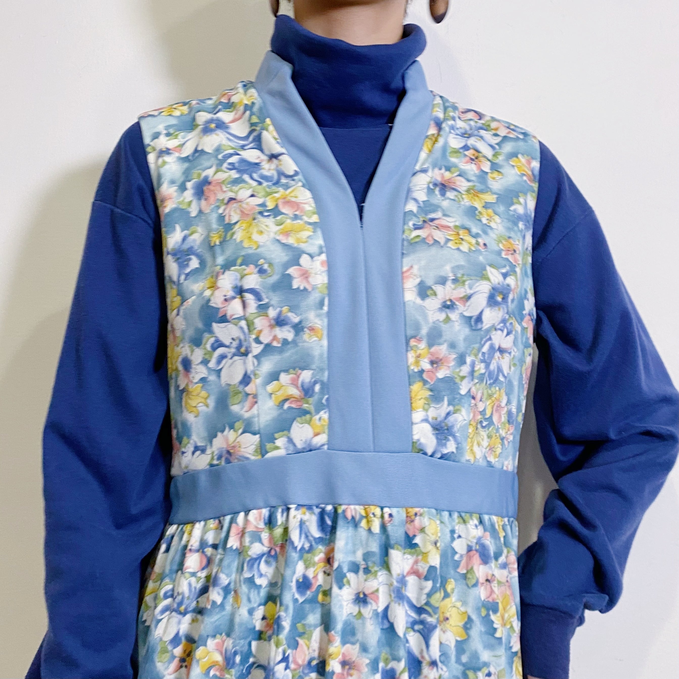 サックスブルーやイエロー・ピンクなどの淡い色合いの花柄が可愛い、70年代のロングワンピースです。