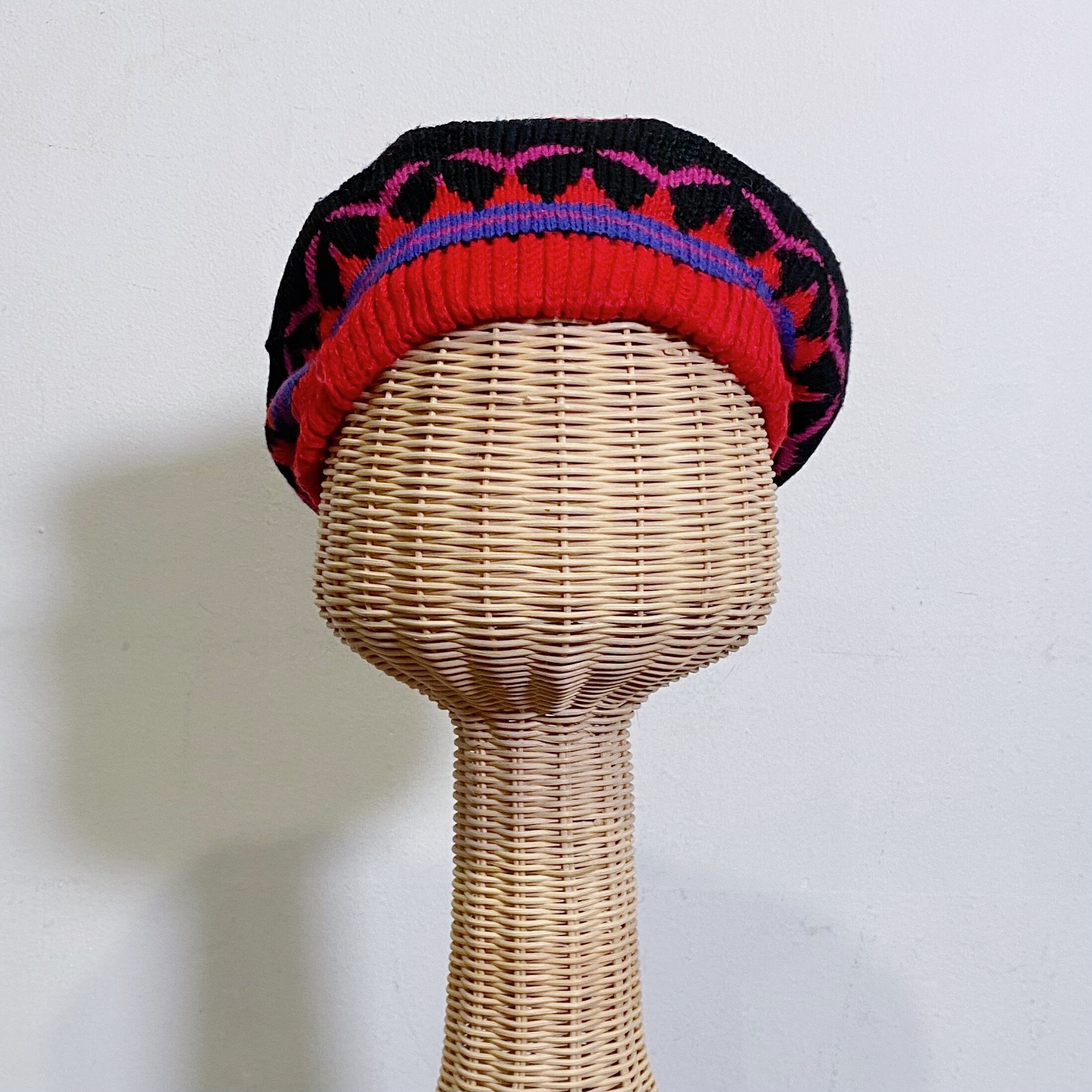 レッドベースに黒や紫、ピンクの組み合わせが可愛い、80年代のニットベレーです。