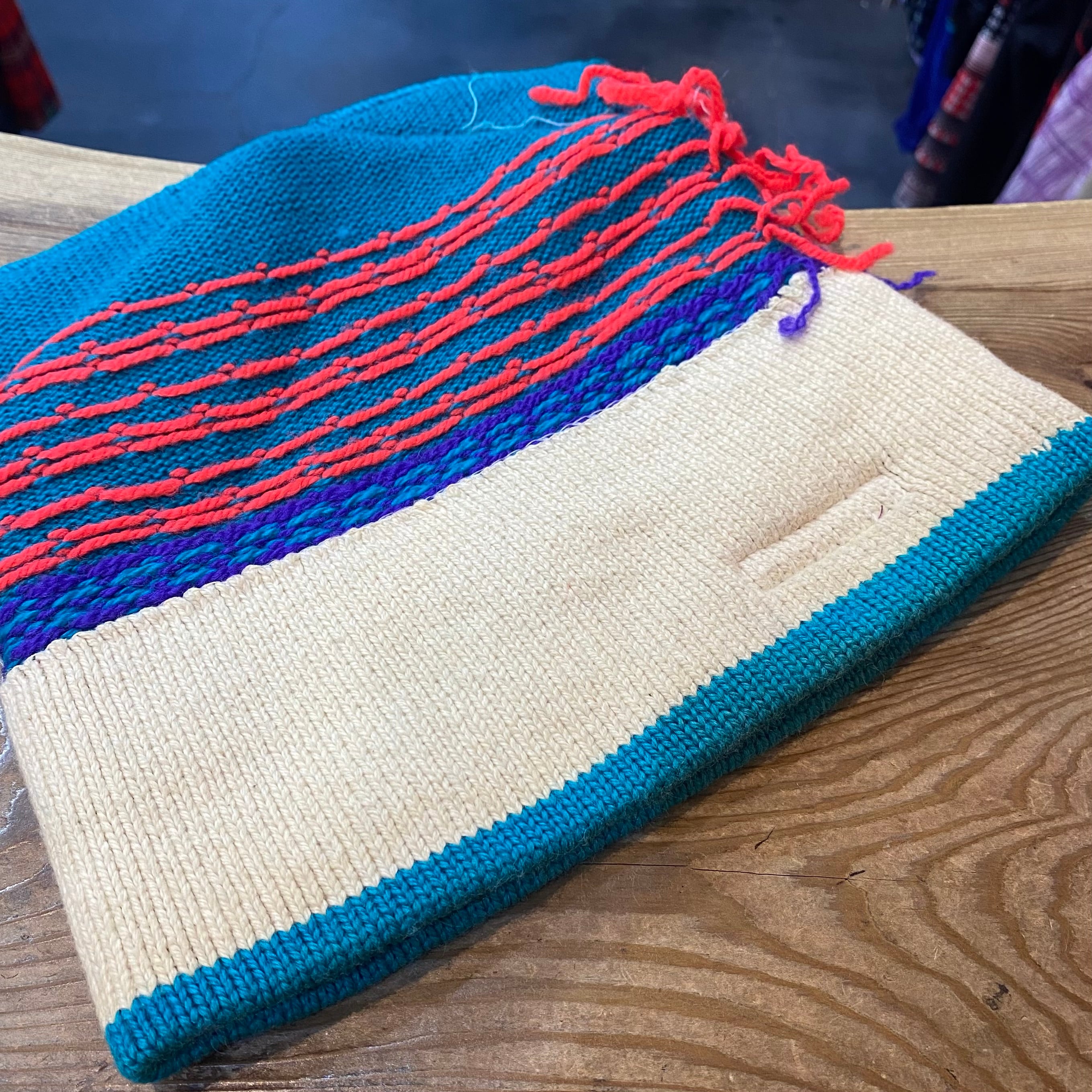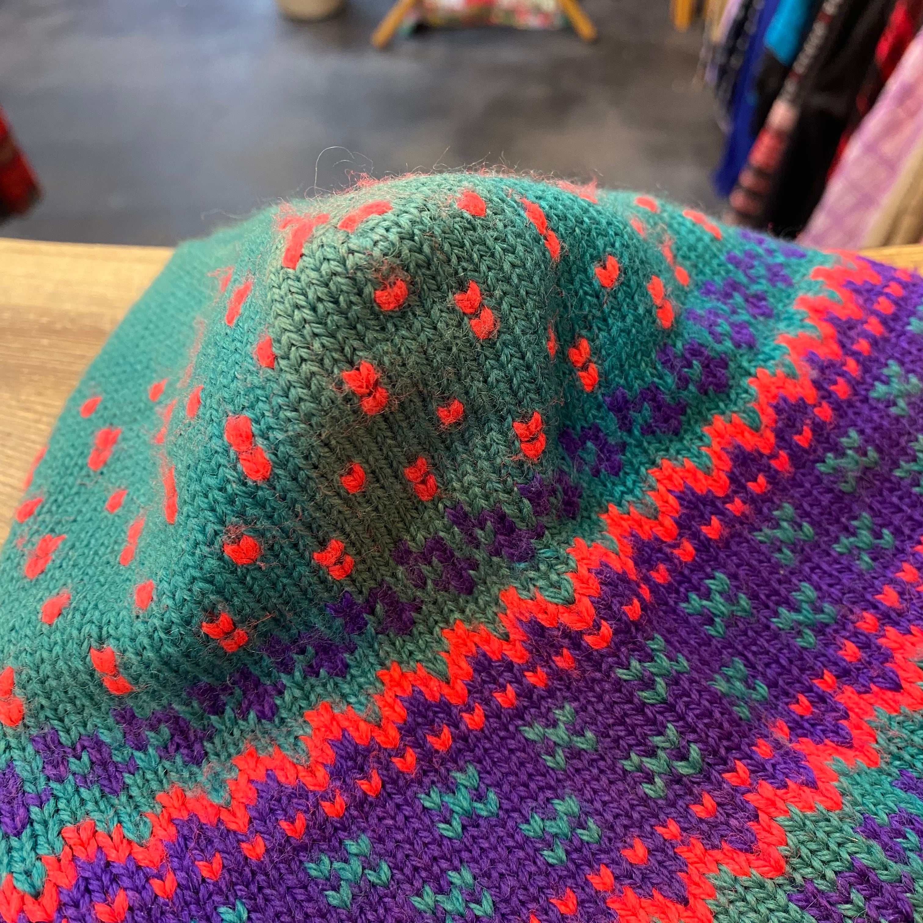 グリーンベースにパープルやピンクの組み合わせが可愛い、80年代のコロンビアのニット帽です。