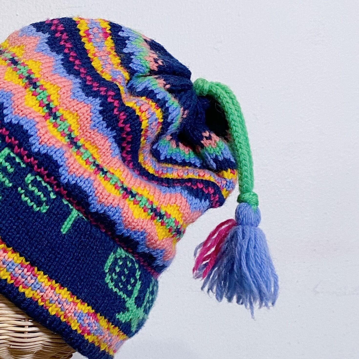 ネイビーとイエローの色合いにフリンジが垂れ下がったデザインが可愛い、ヴィンテージニットキャップです。