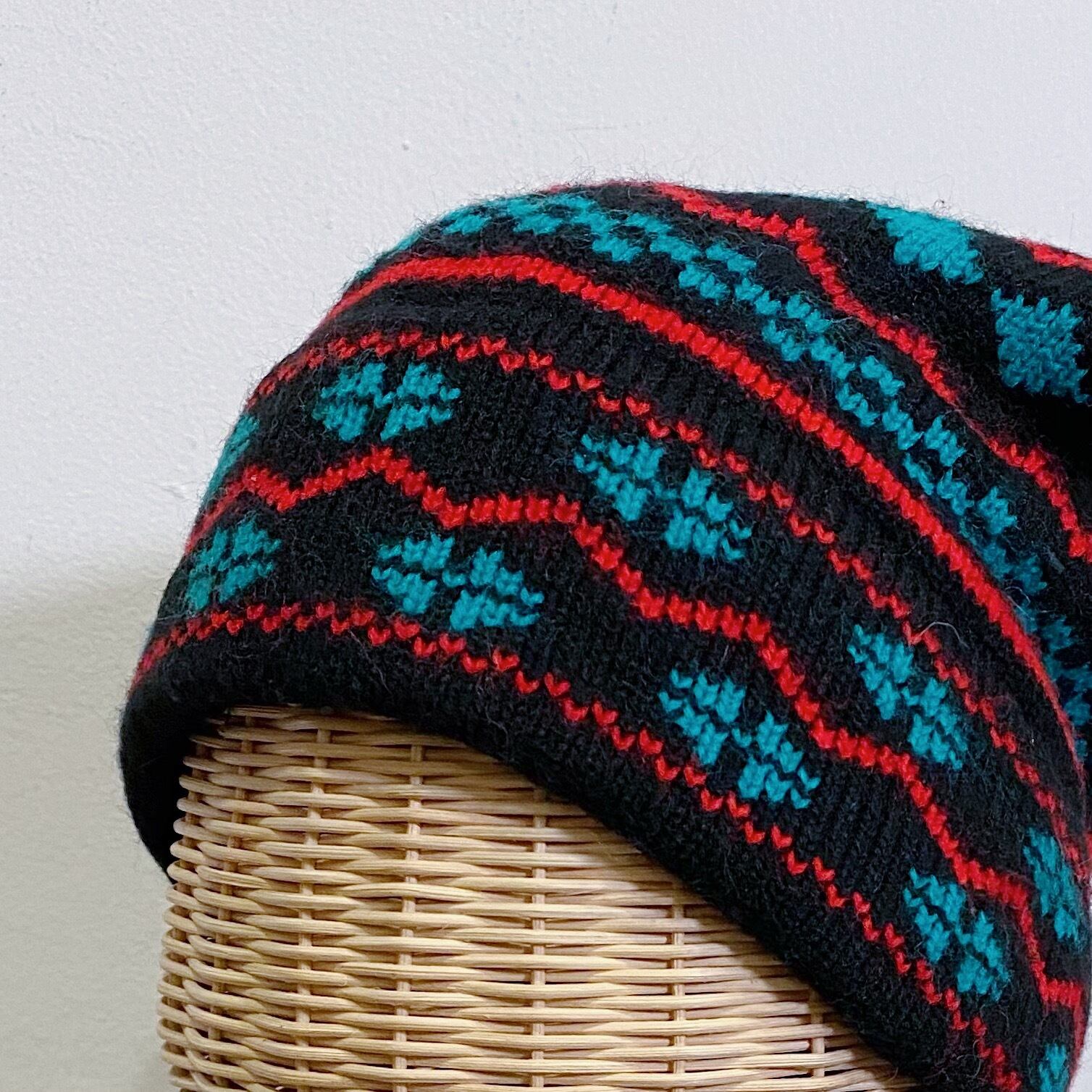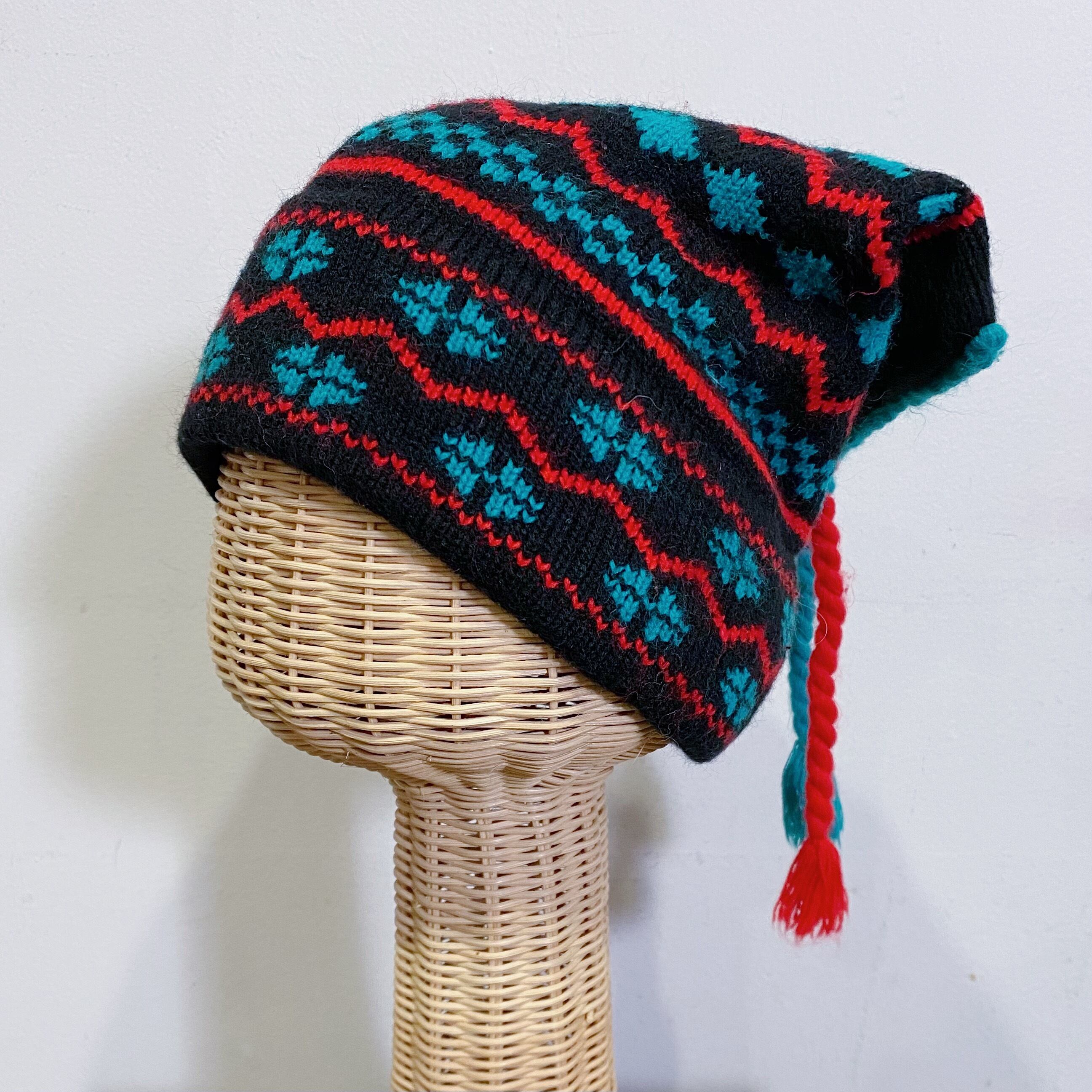 ユニークな三角形に赤と緑のロープが可愛い、80年代のニット帽です。