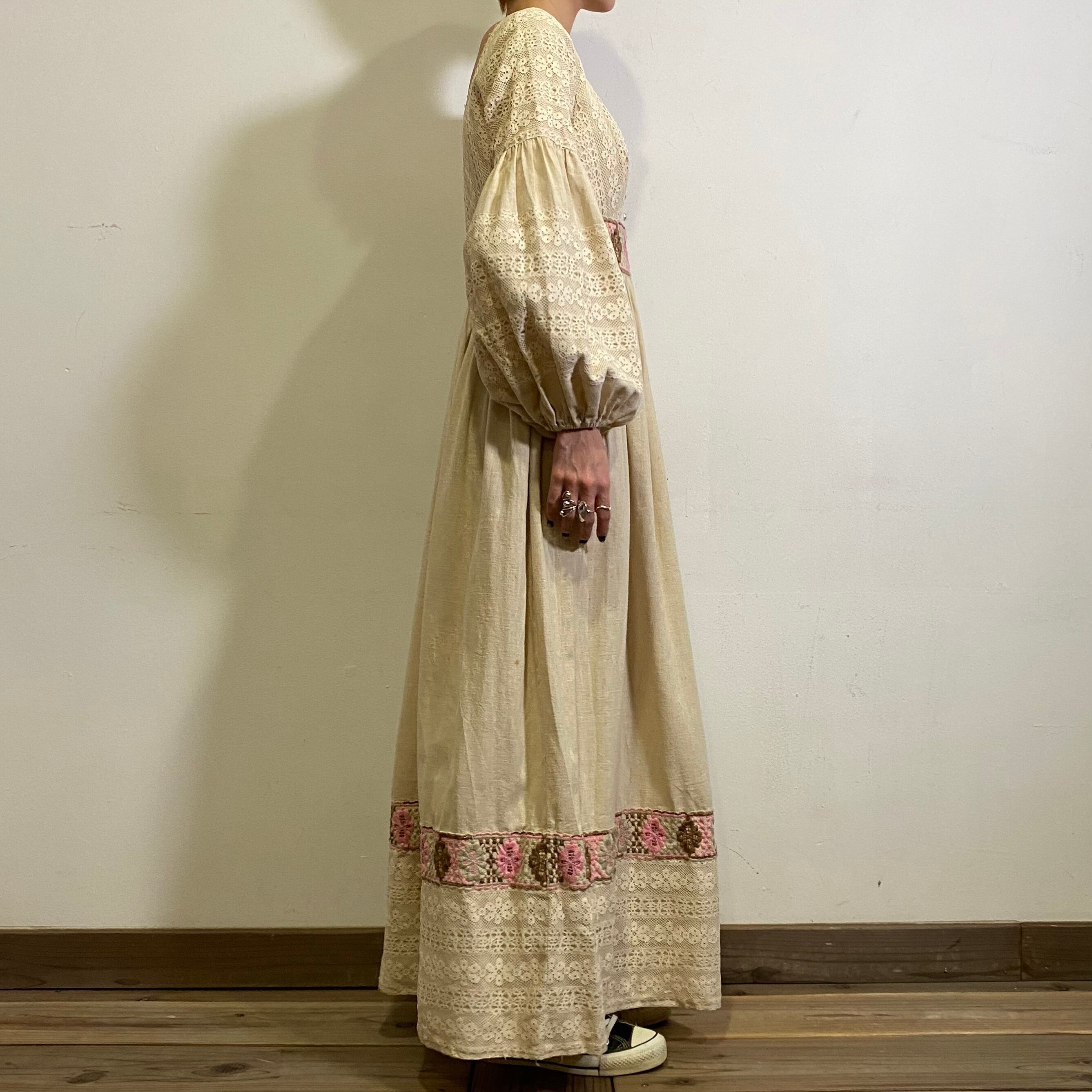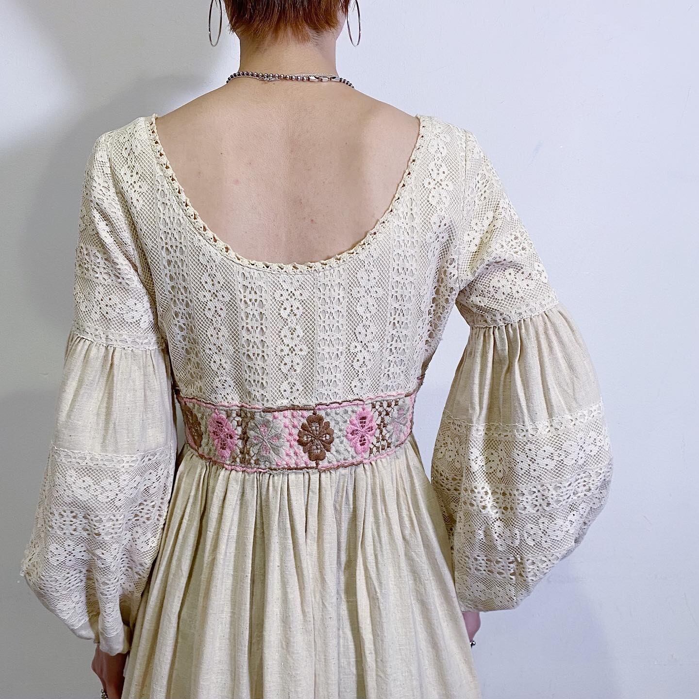 レースとお花の刺繍がスペシャルな、黒タグGUNNEのようなデザインが可愛い70年代のワンピースです。