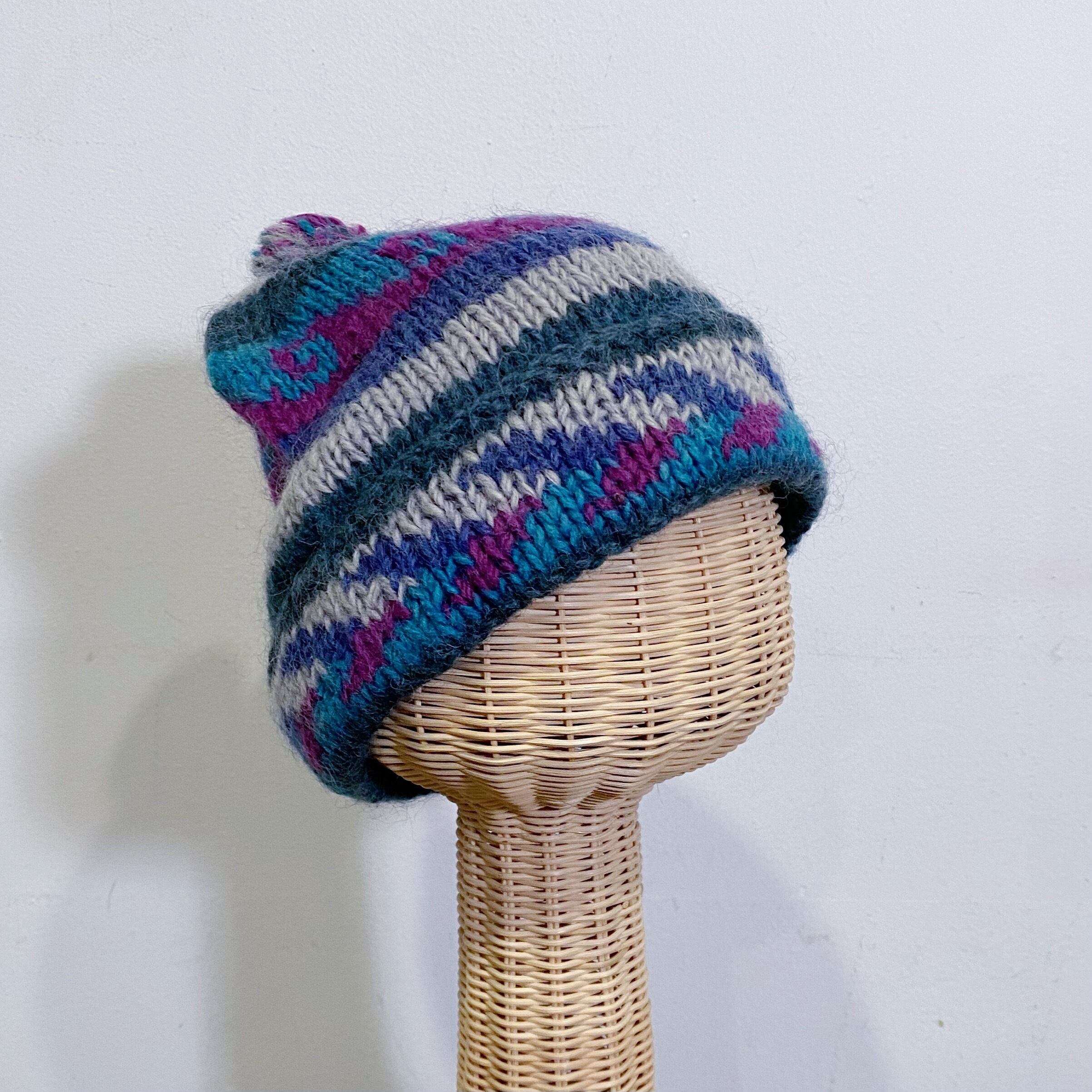 blue and purple wave motif ponpon knit cap