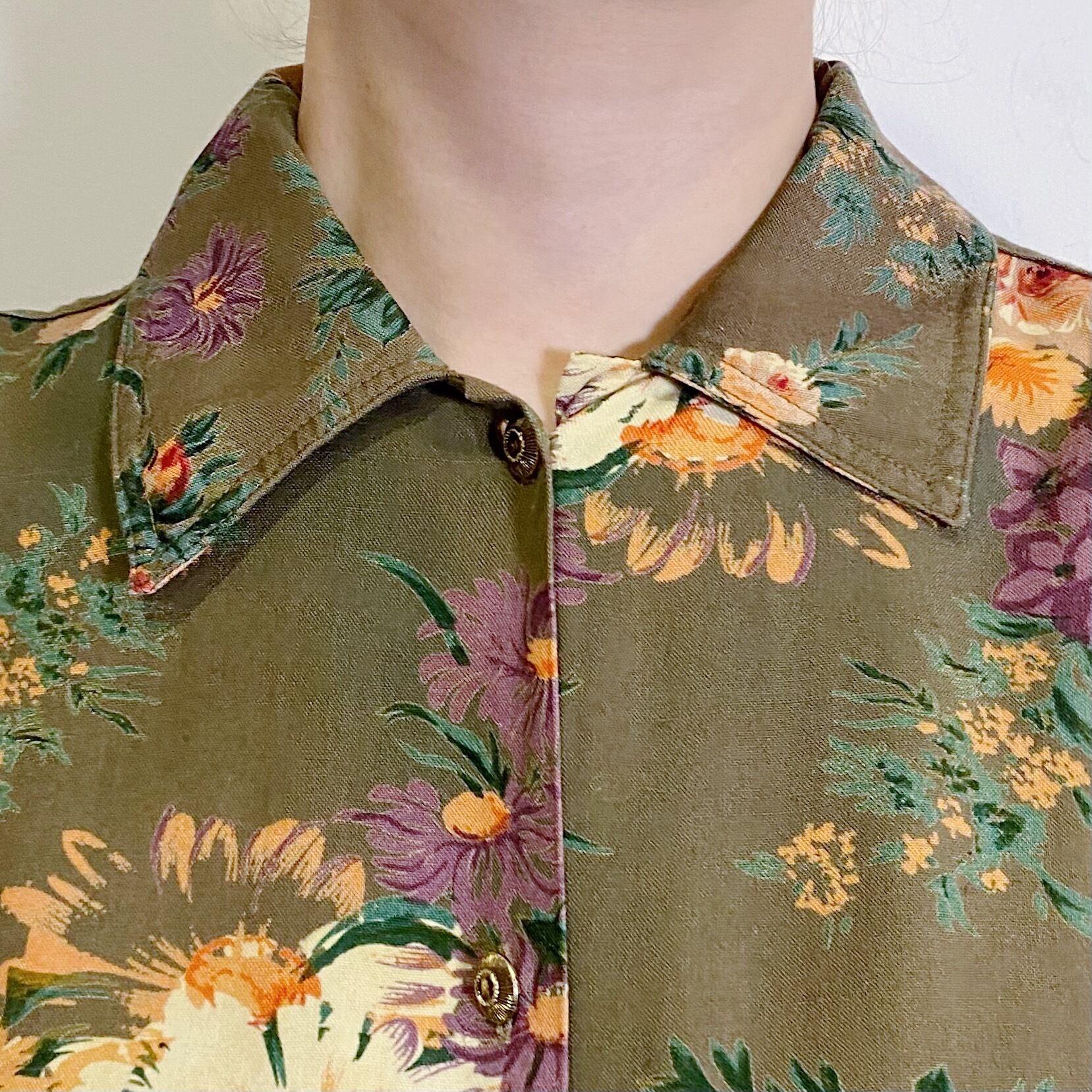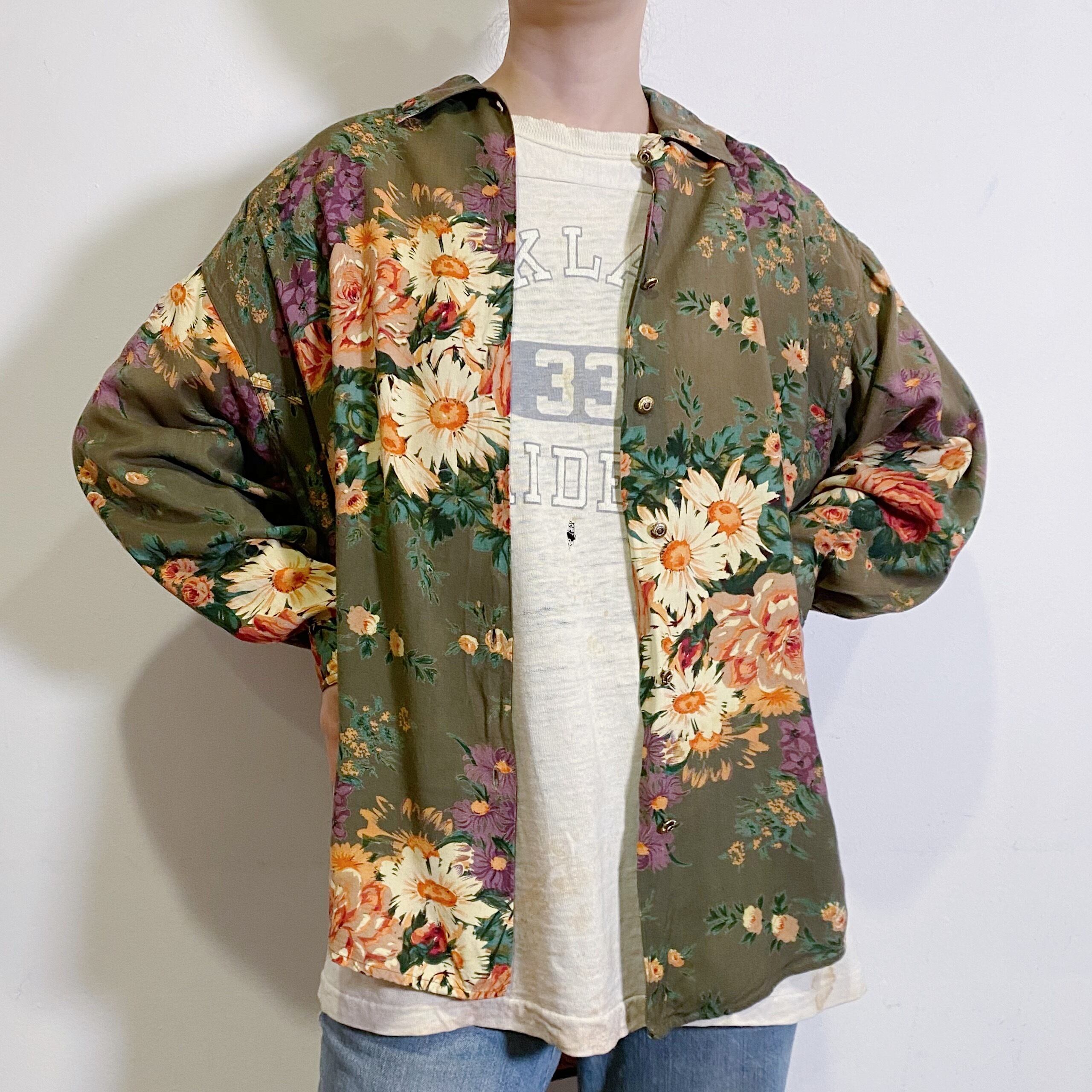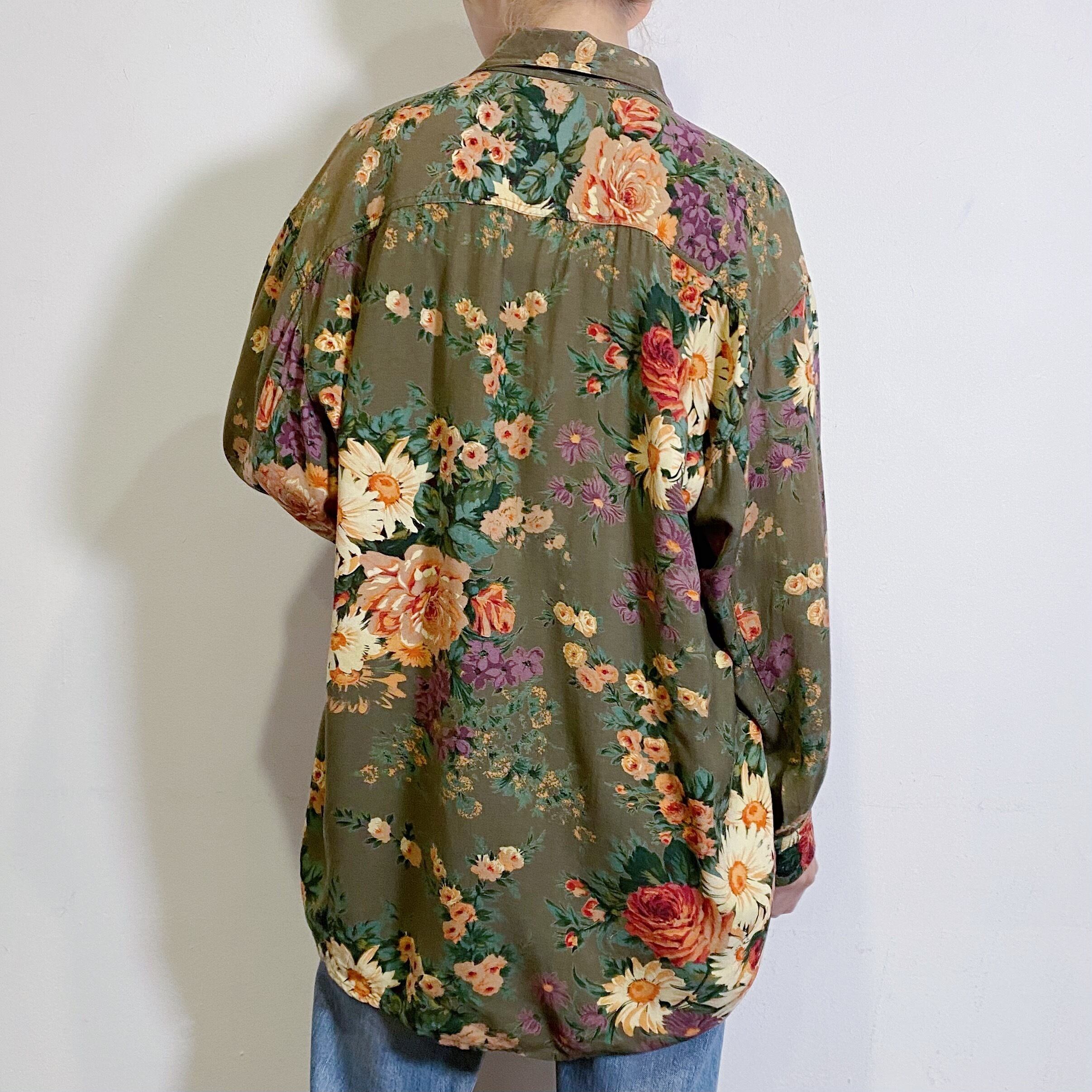 カーキの色合いに大き目の花柄が可愛い、レーヨンシャツです。