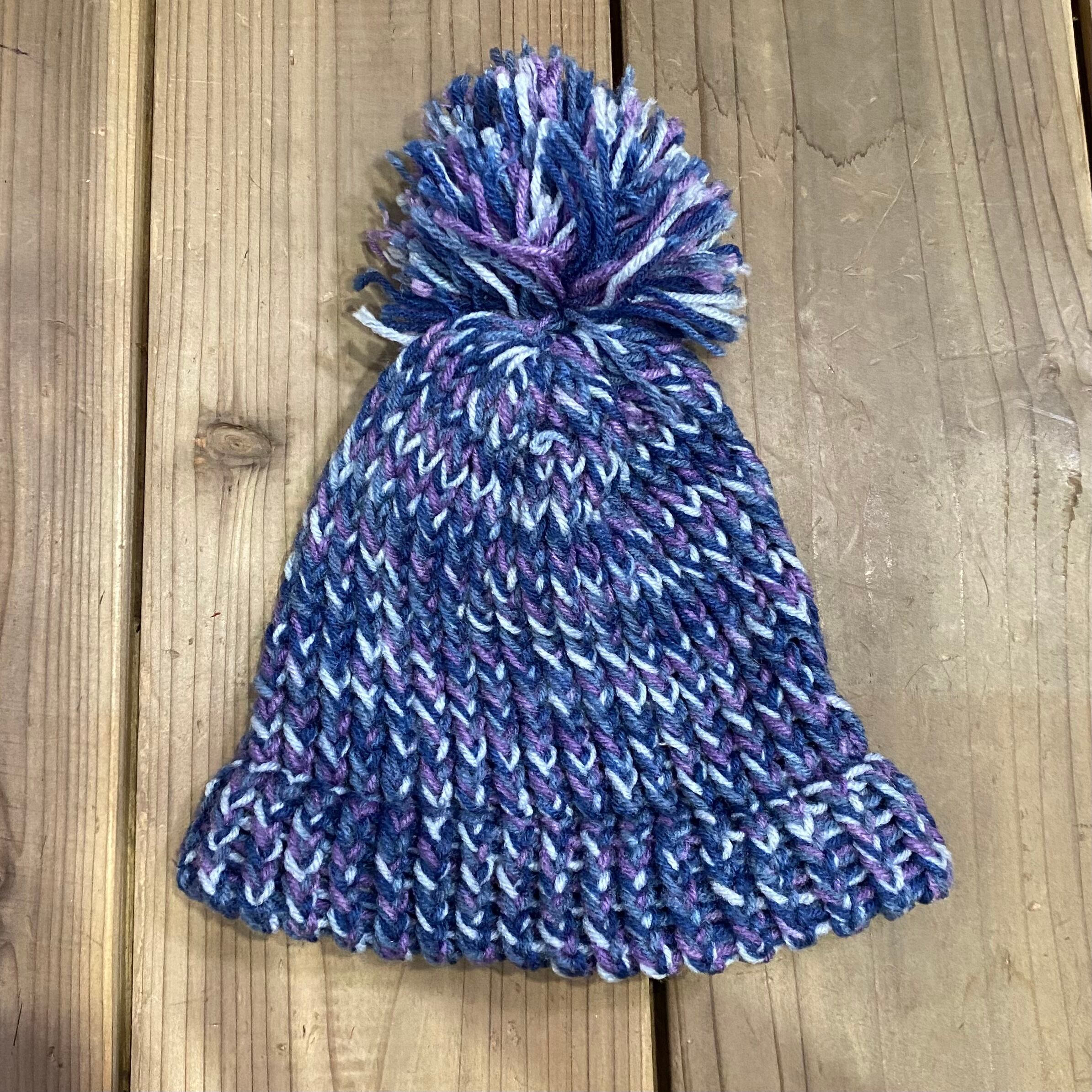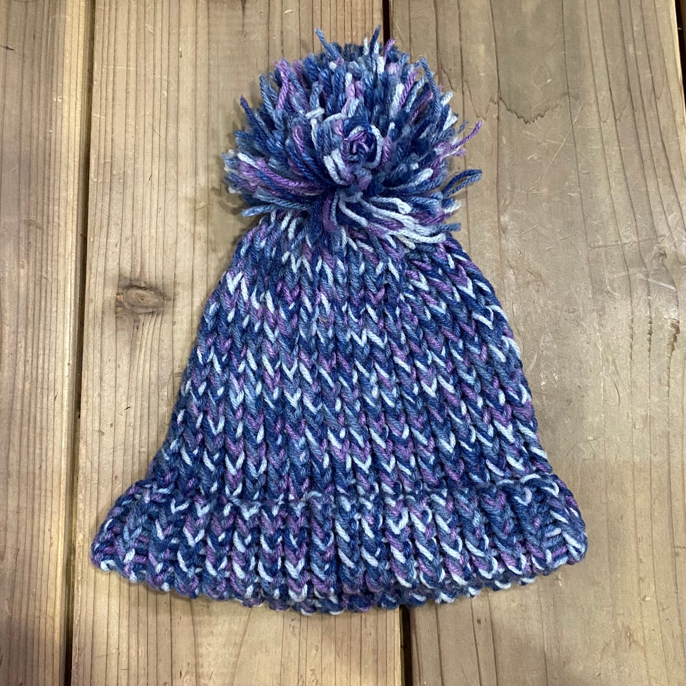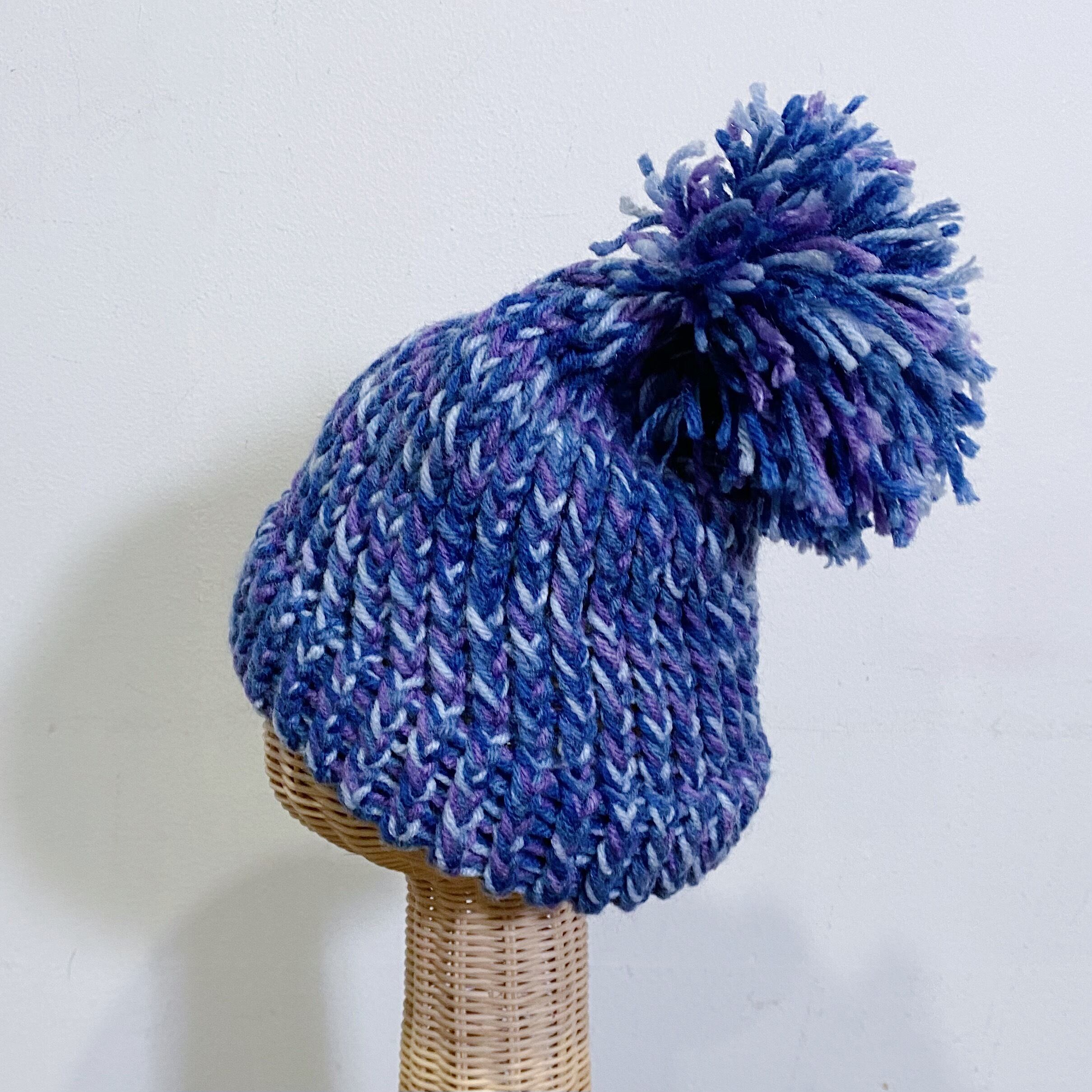 パープルにいろんなブルーのミックスカラー編みが可愛い、ニットキャップです。