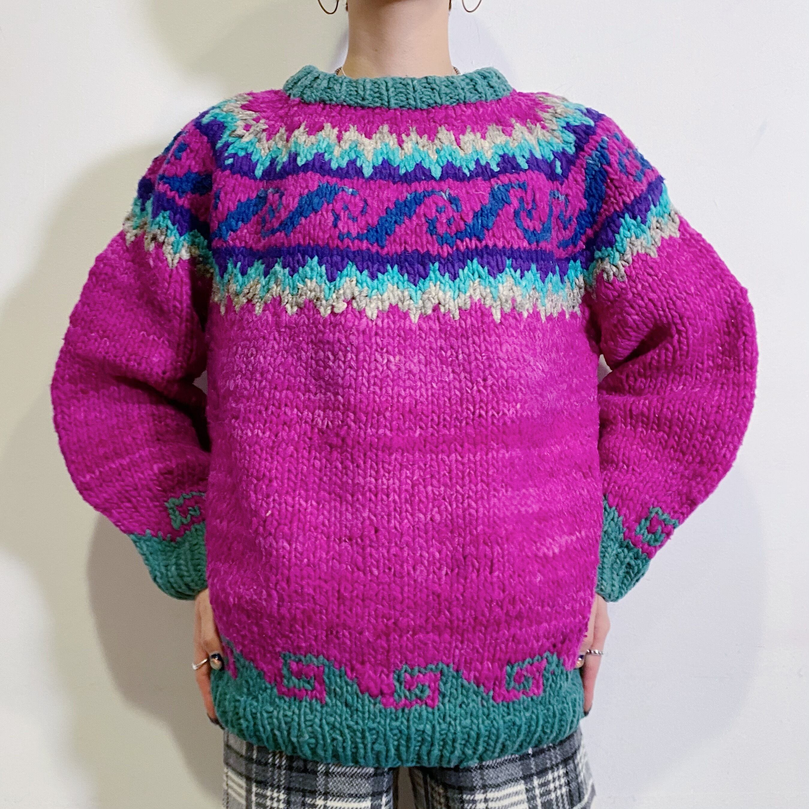 ノルディックニットのような模様の入り方ですが、鮮やかな色合いや波モチーフが可愛く、ほっこりせずに着ていただけますよ。