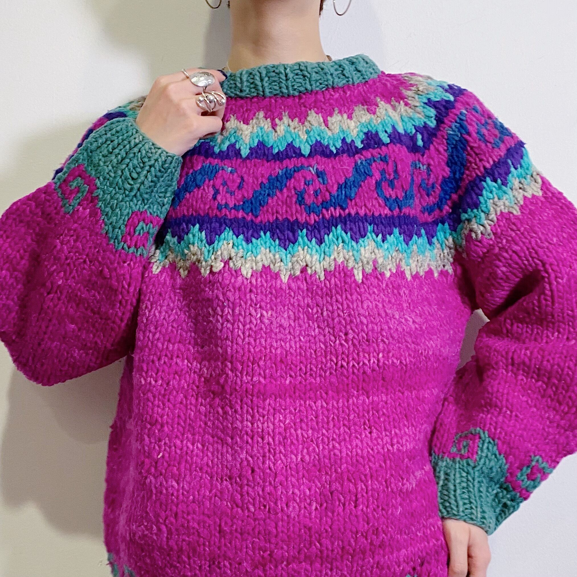 パープルとピンクの中間のような色合いが可愛いセーターです。