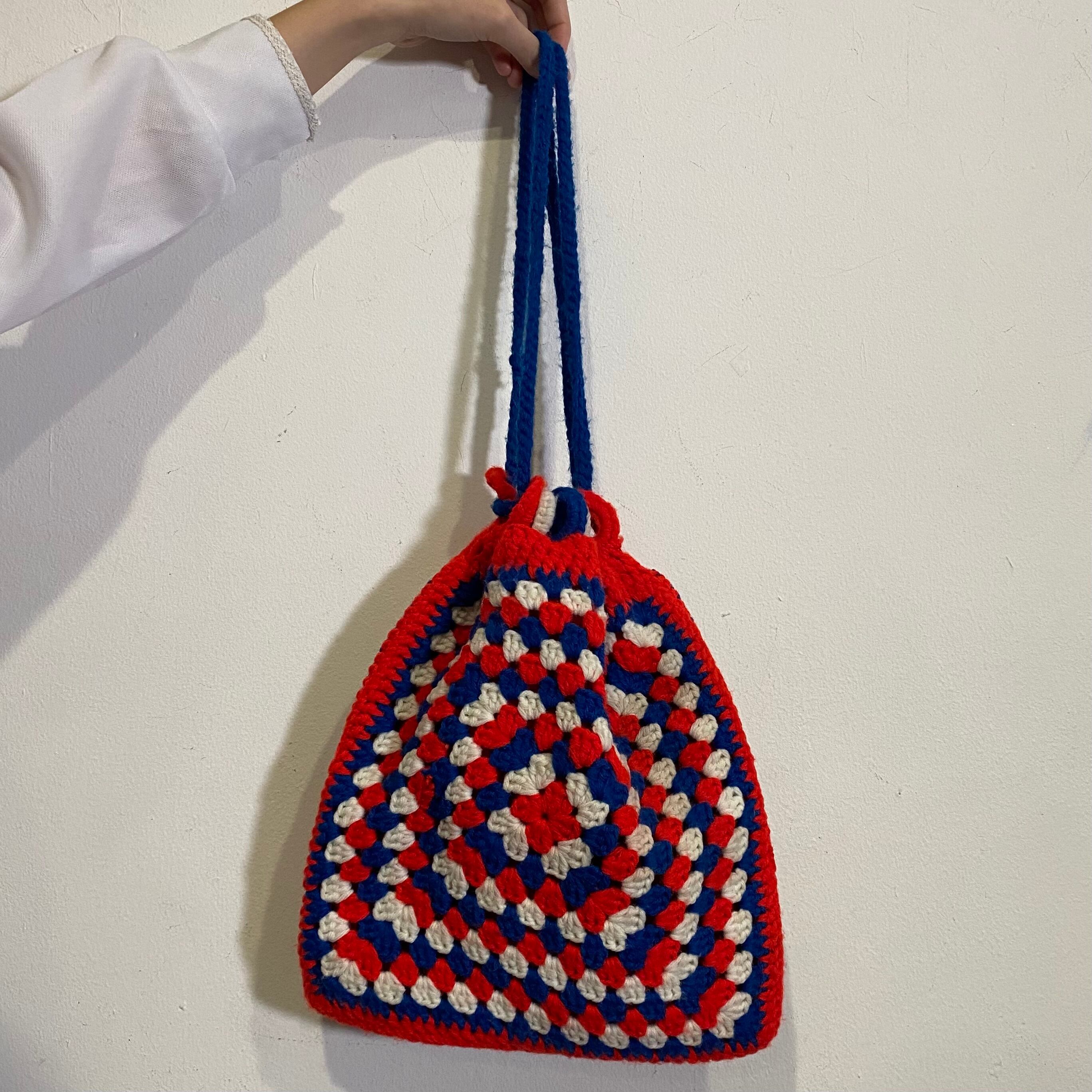 トリコロールカラーが可愛い、70年代のグラニースクエアの巾着バックです。