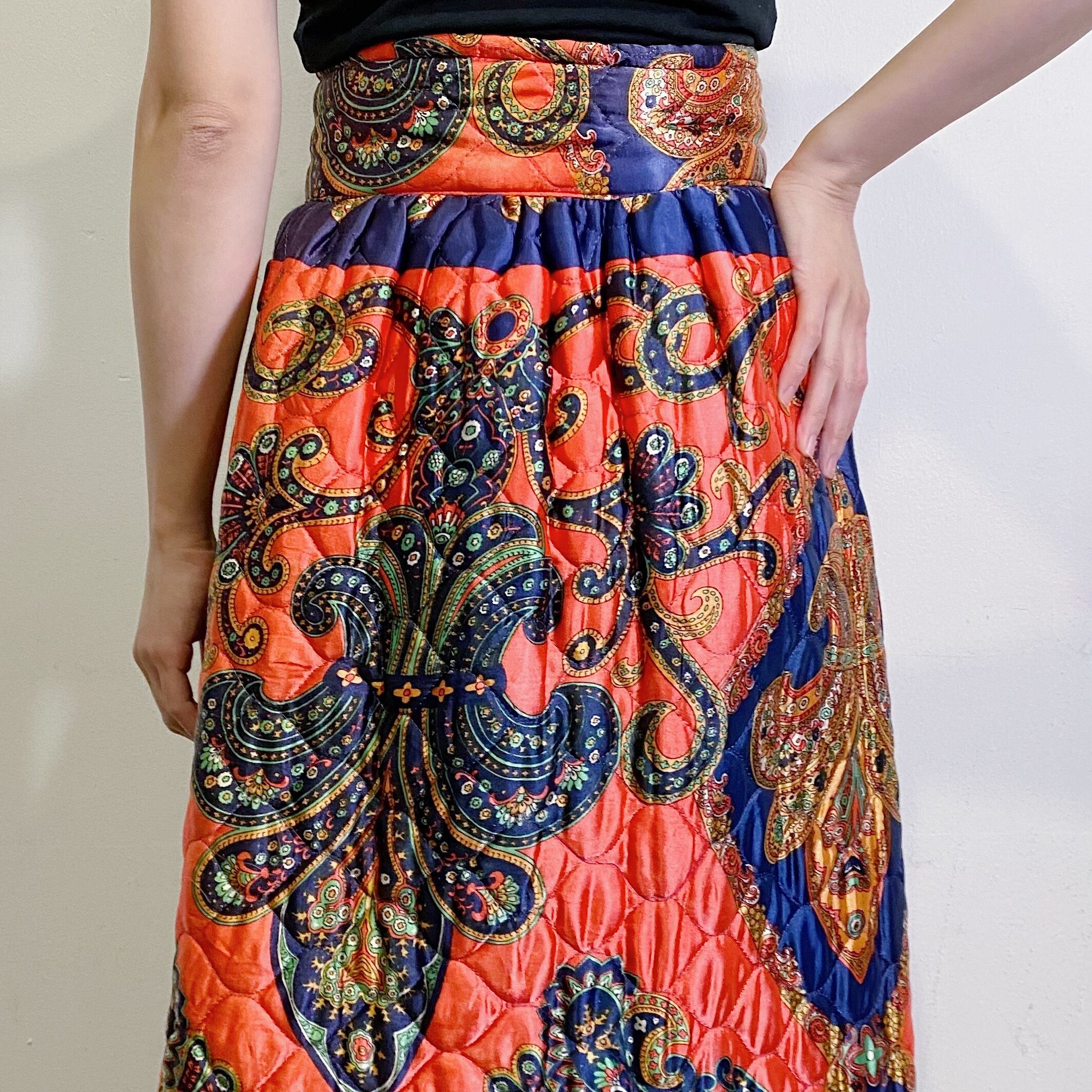 大柄のサイケなテキスタイルが可愛い、60〜70年代のキルティングスカートです。