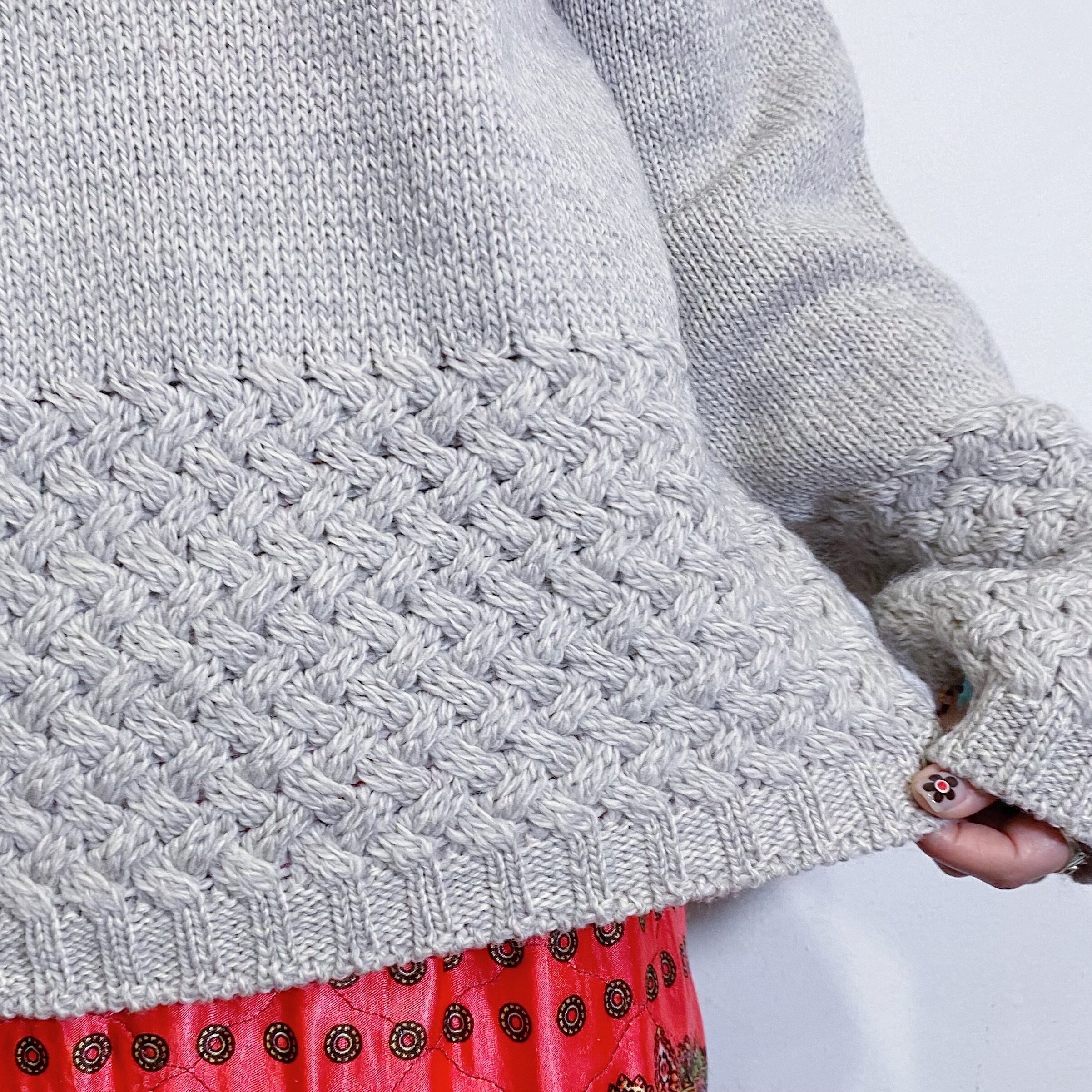 一見シンプルなデザインですが、首元や袖口、ウエスト周りの編み模様が切り替わっているのがポイント。