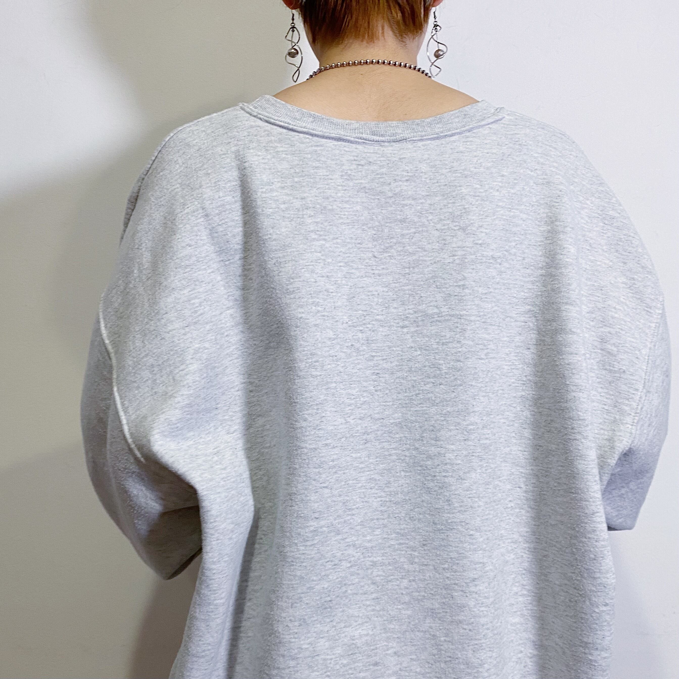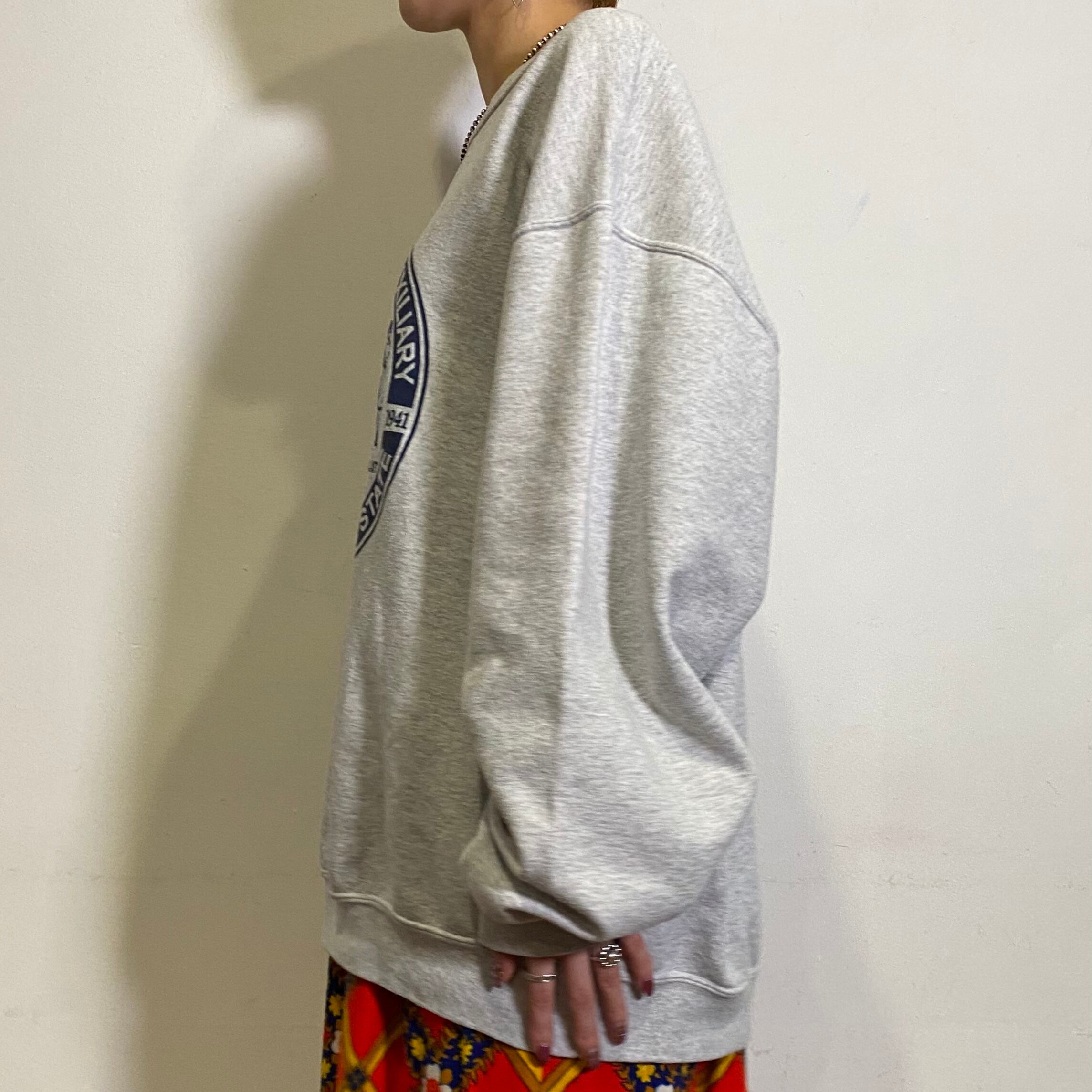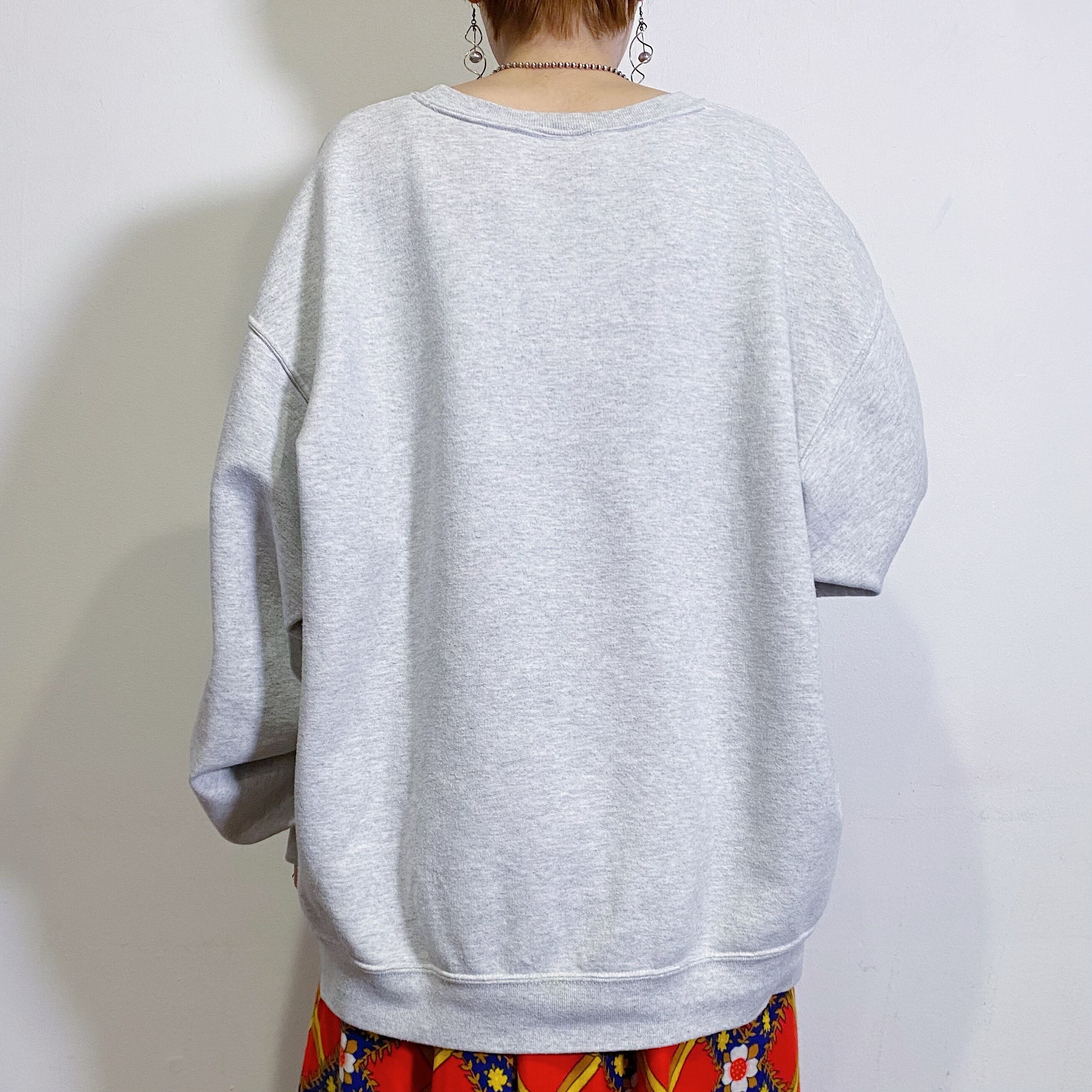 杢グレーカラーにネイビーのなんだかゆるいプリントで、使い勝手のいいスウェットです。