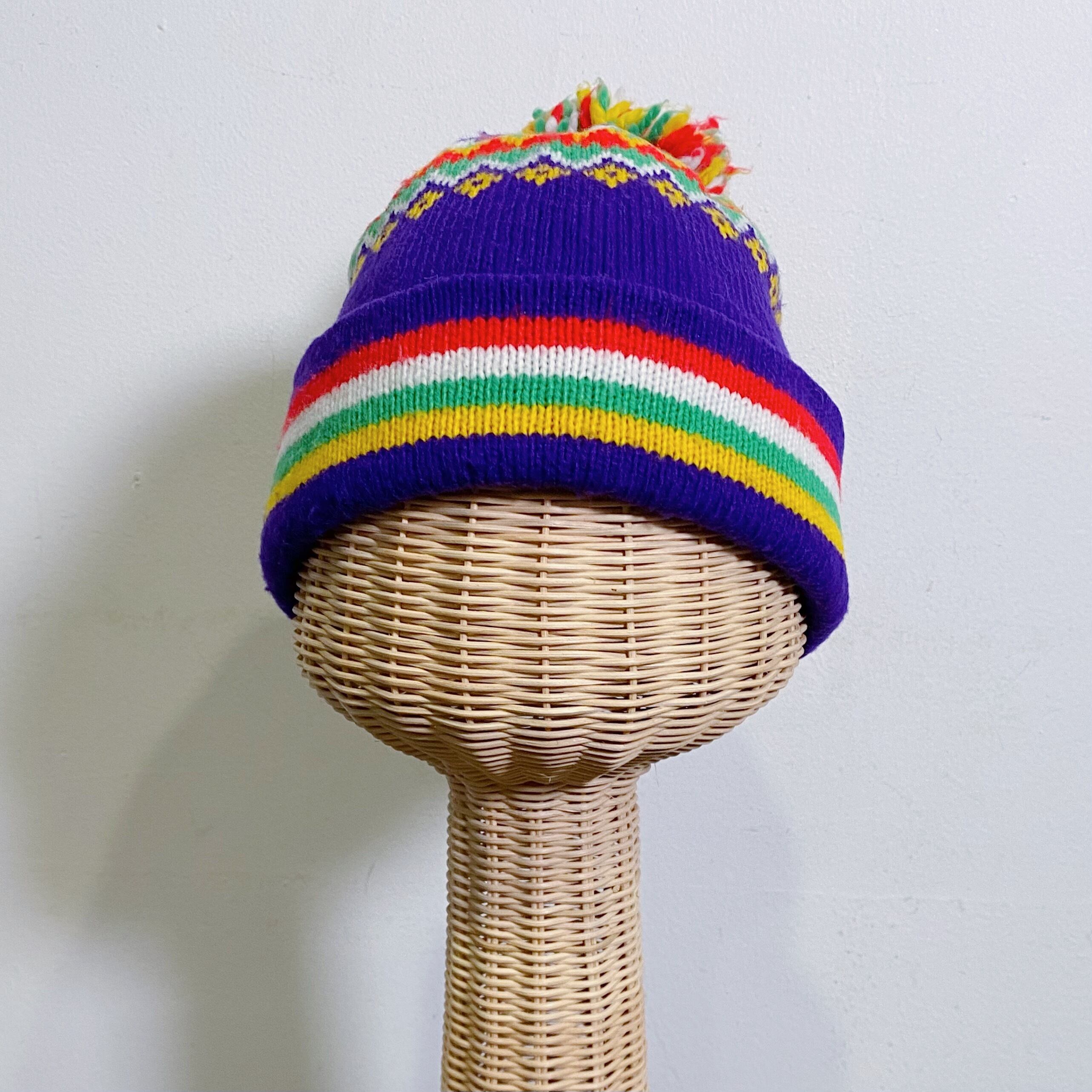 紫ベースに赤や黄、緑の組み合わせが可愛い、70~80年代のニット帽です。