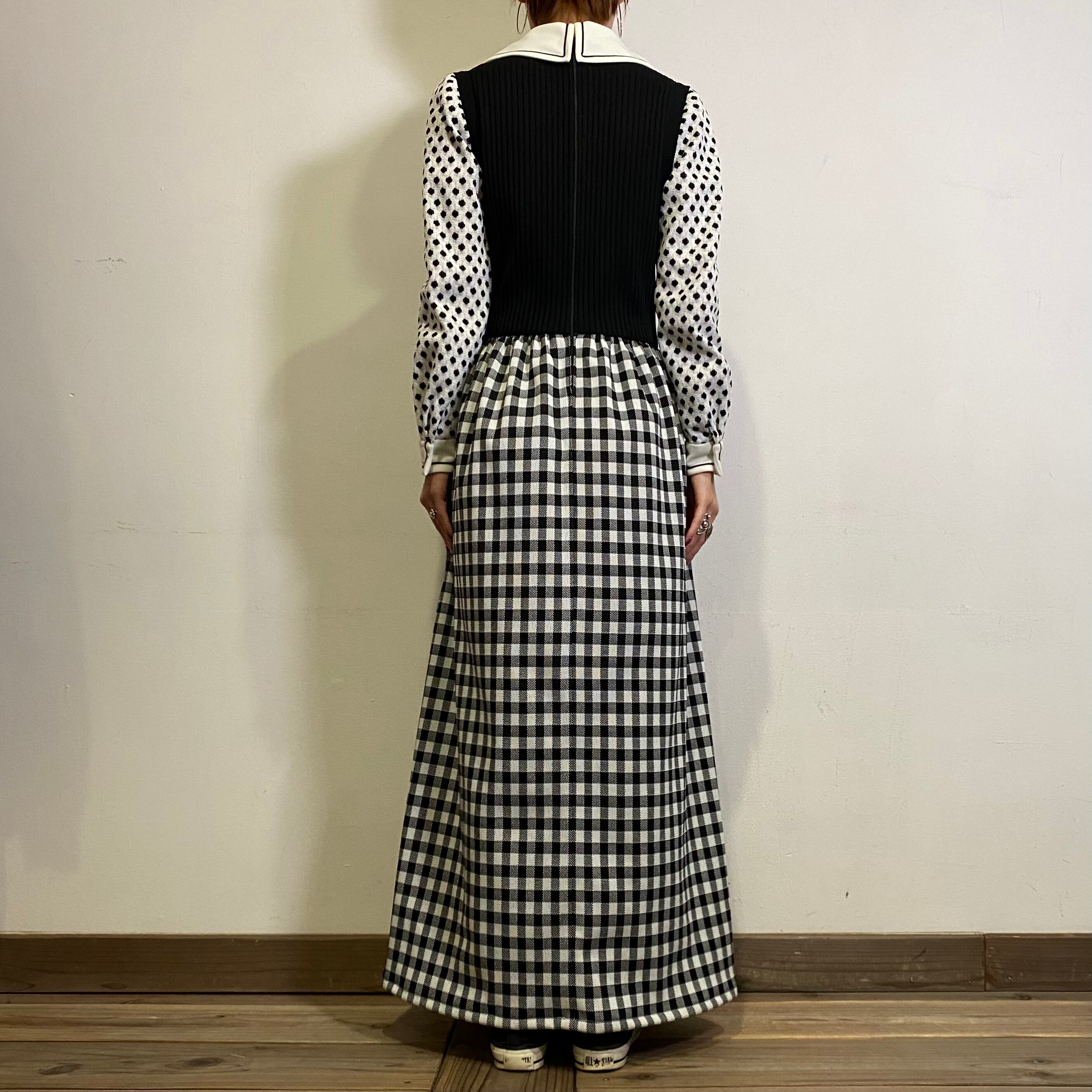 ドットとギンガムチェックの組み合わせが可愛い、70年代のロングワンピースです。