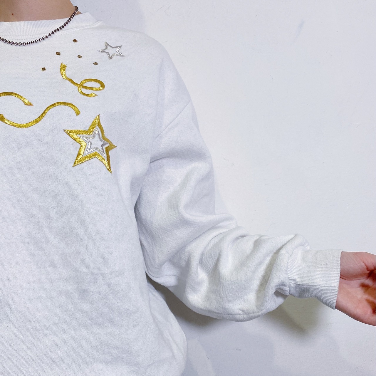 シルバーとゴールドの糸で刺繍された流れ星のモチーフが可愛い、80年代のスウェットです。
