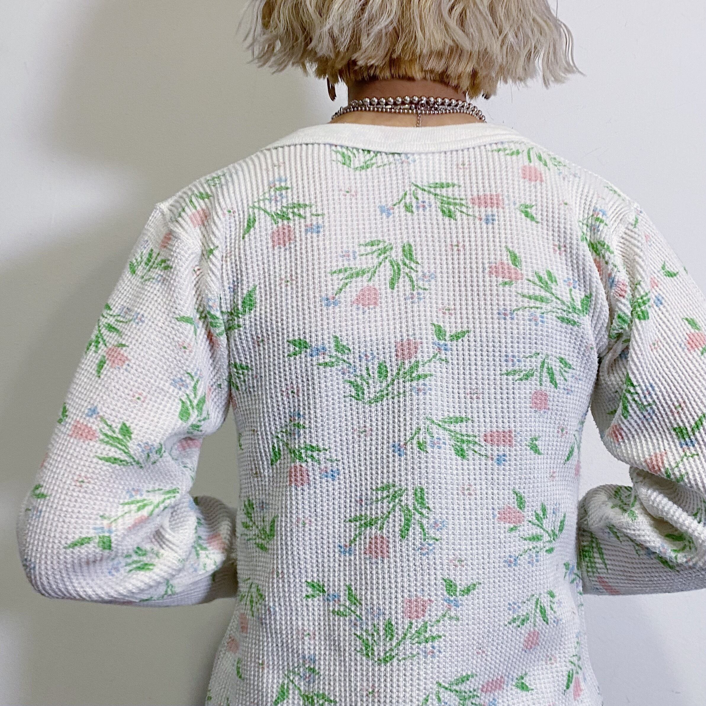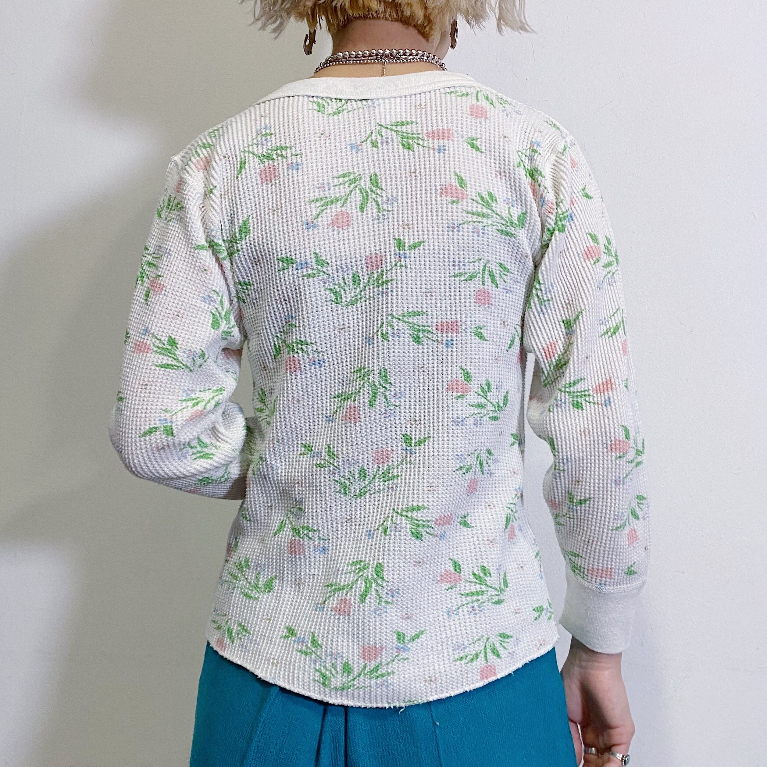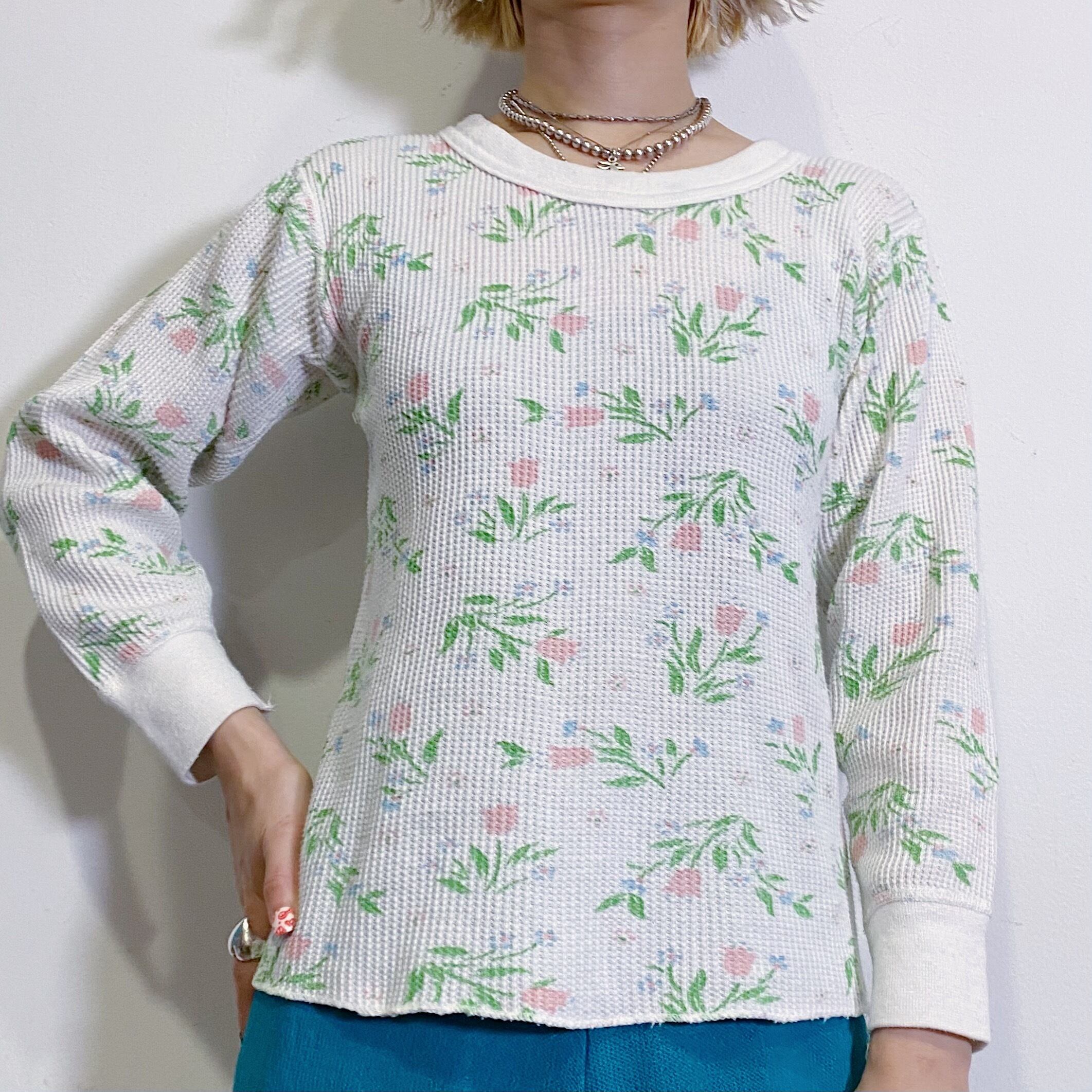 ホワイトカラーにピンクのチューリップ柄がかわいい、サーマルトップスです。