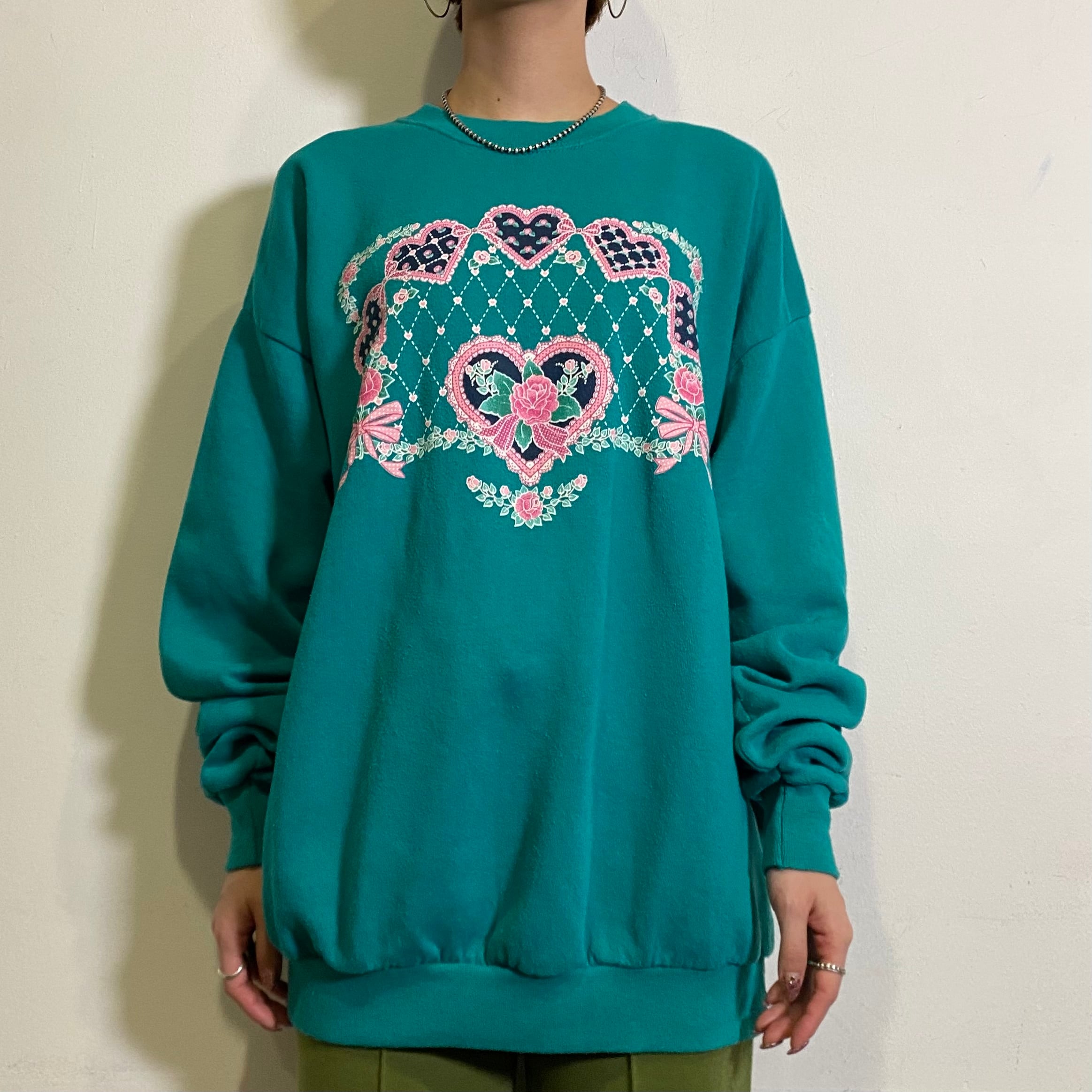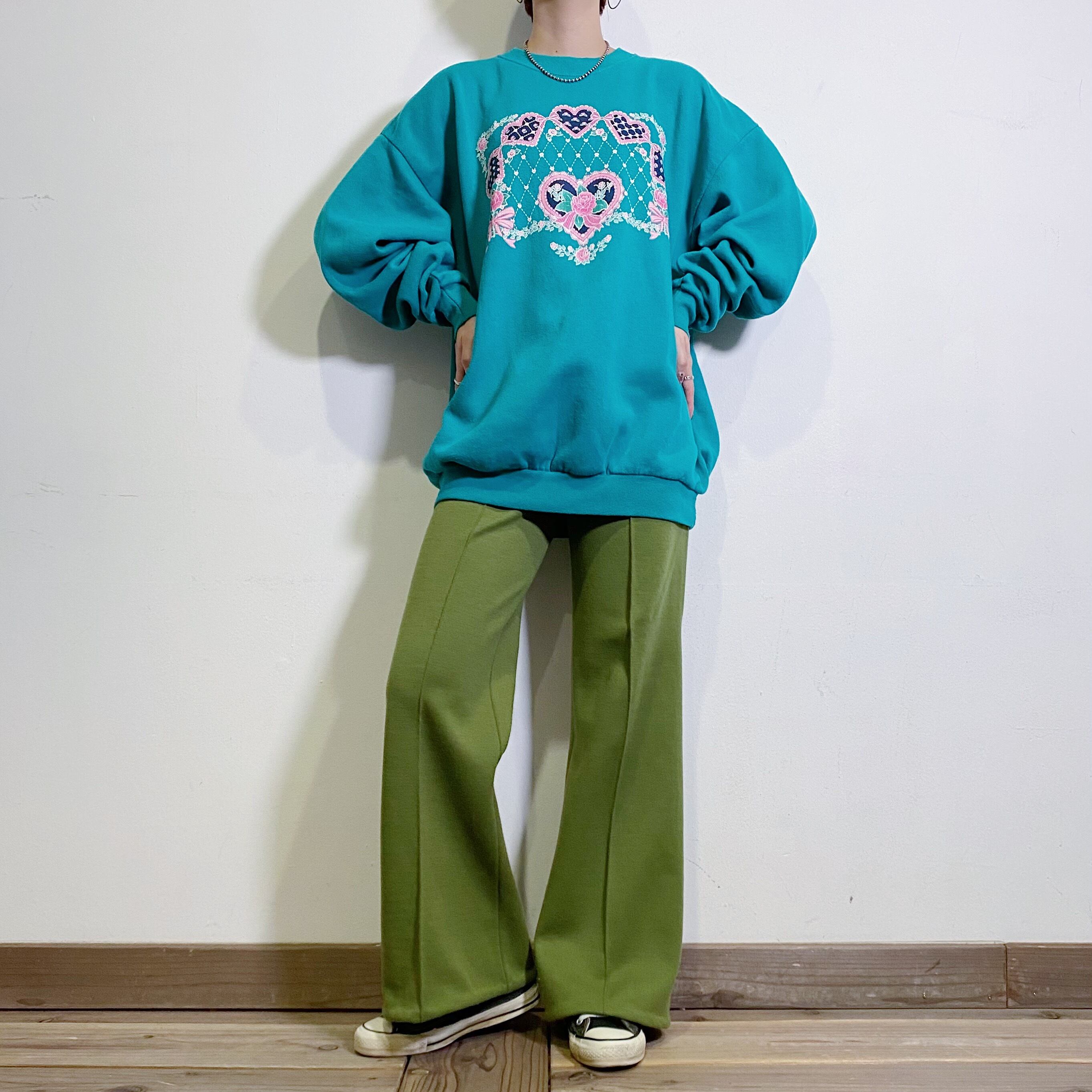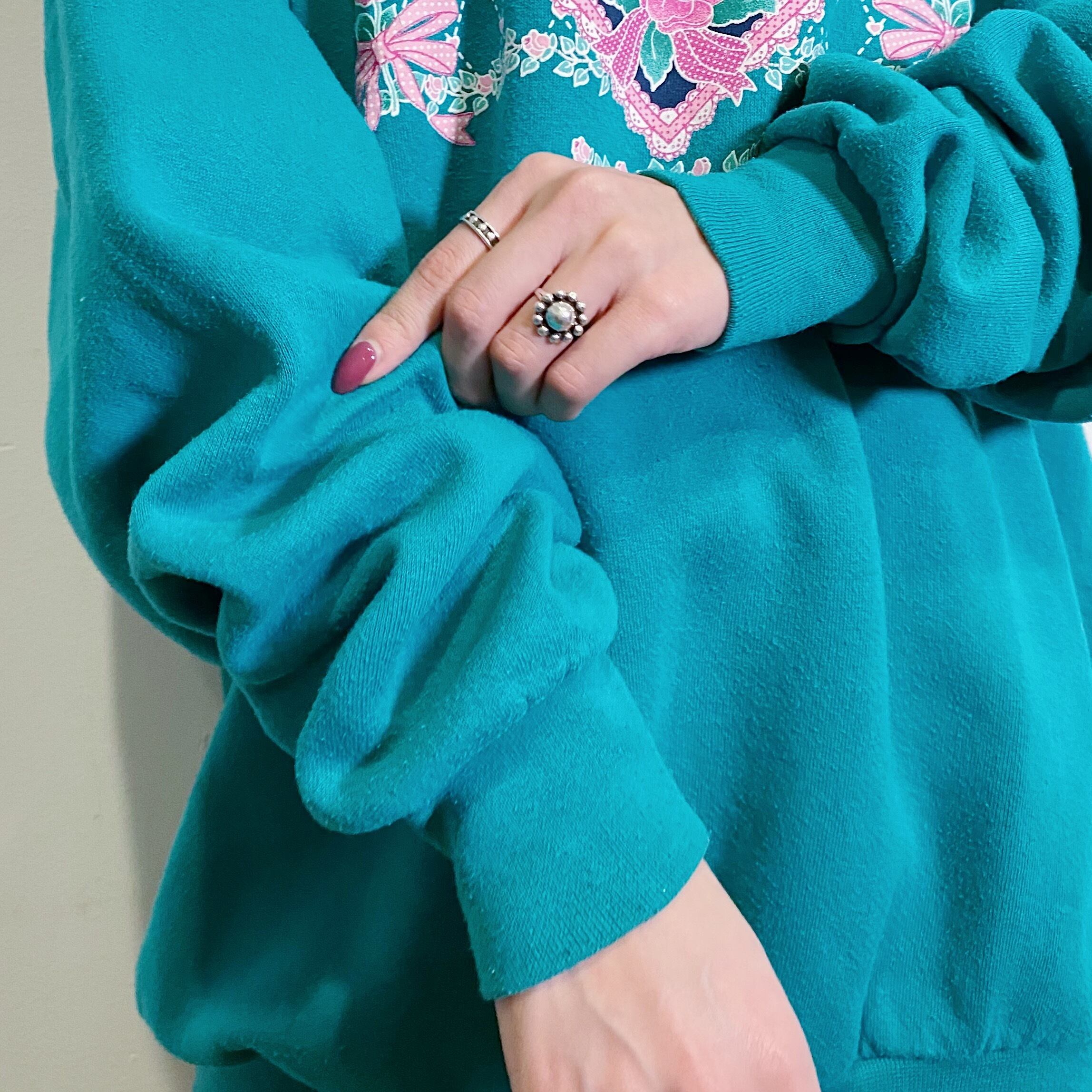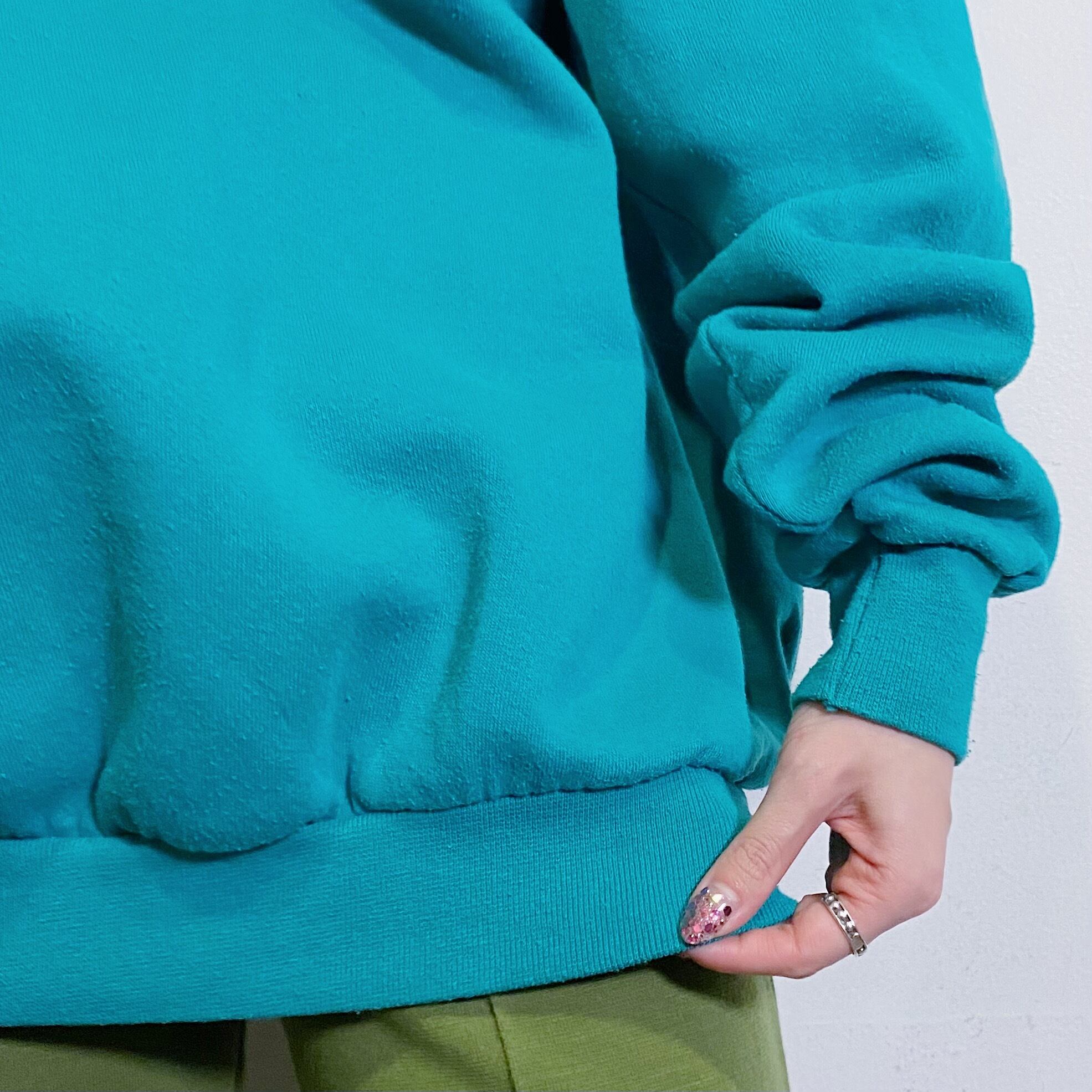 ブルーとグリーン中間のような絶妙な色合いが可愛い、80年代のスウェットです。