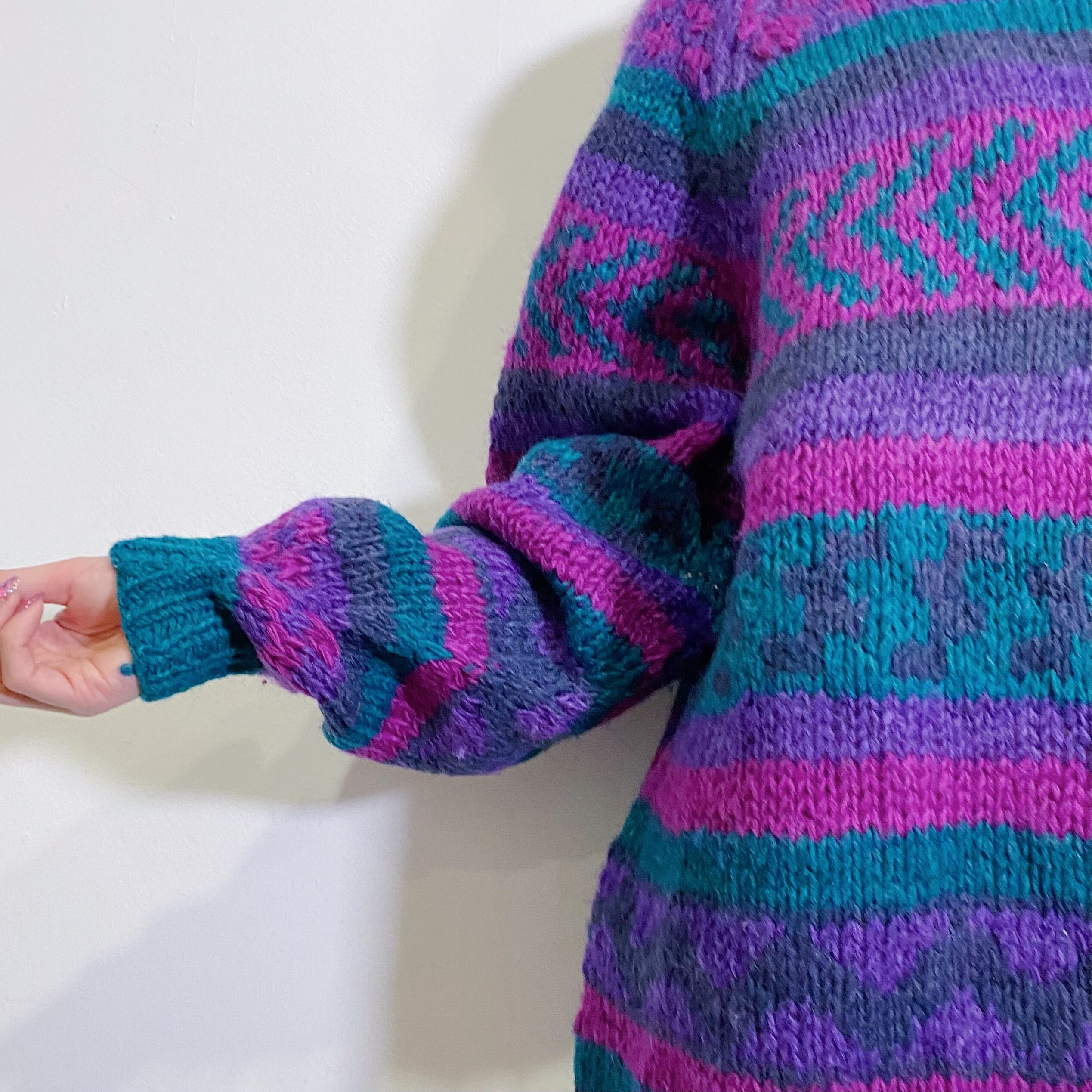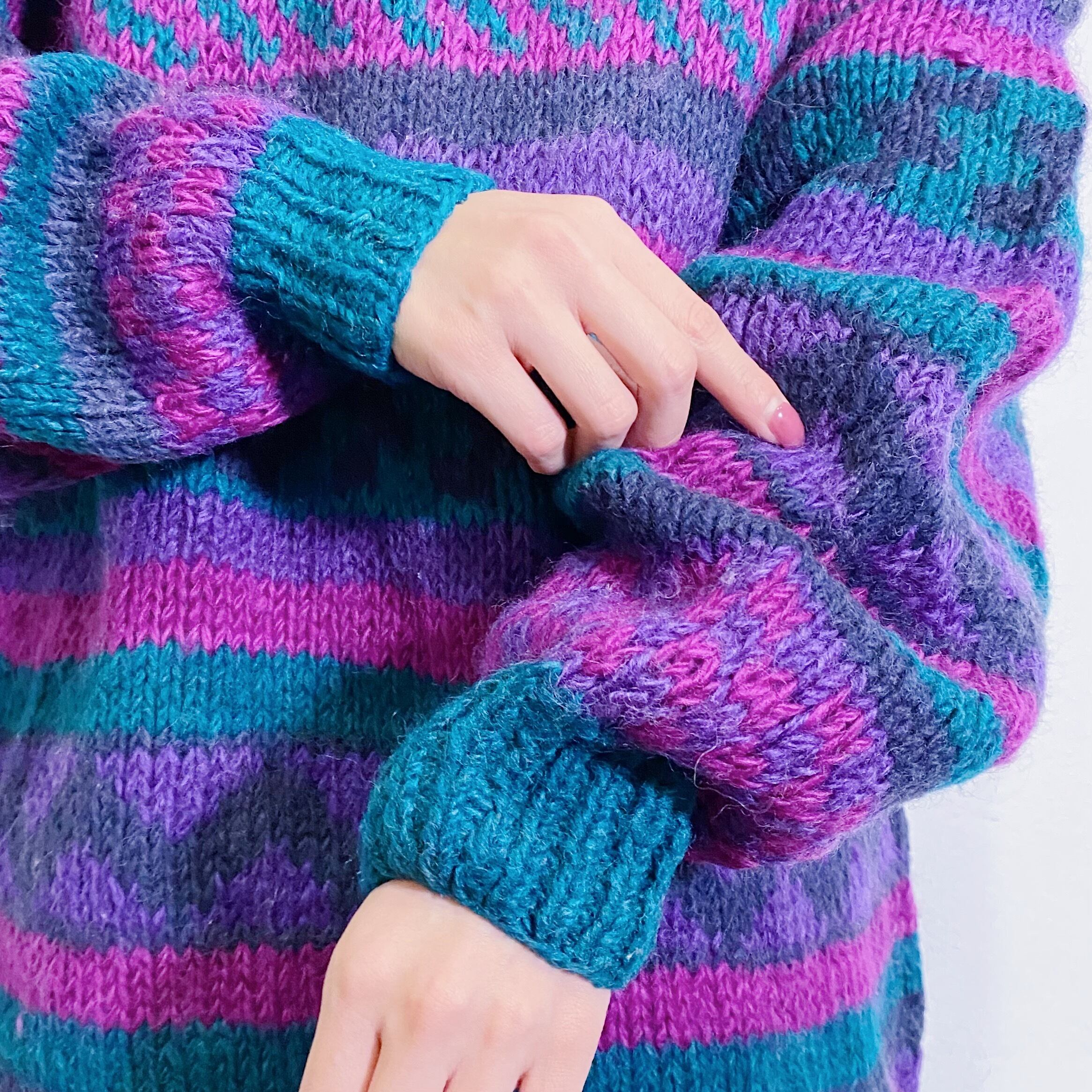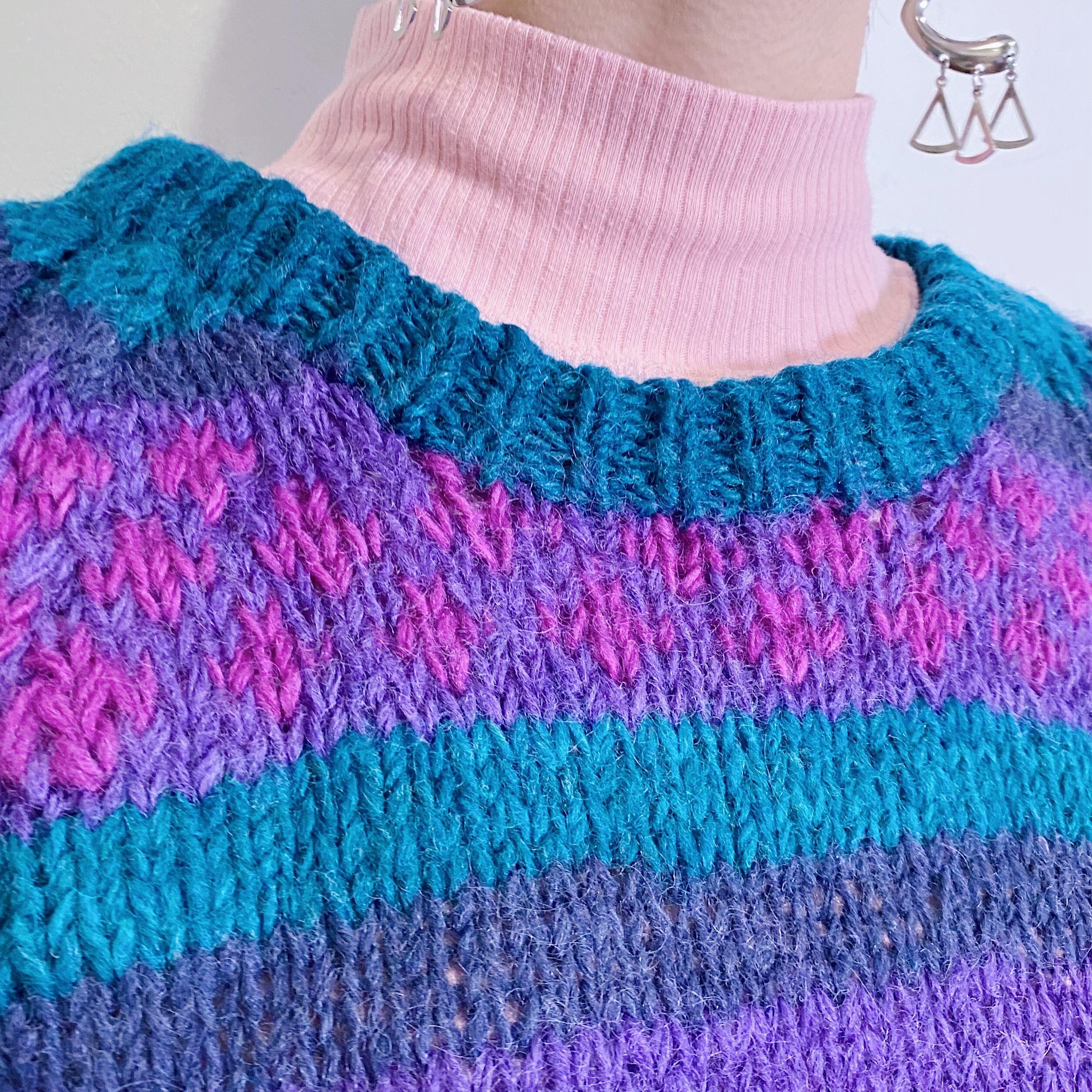 パープル・グリーン・マゼンタカラーのボーダー編みが可愛い、80年代のニットセーターです。