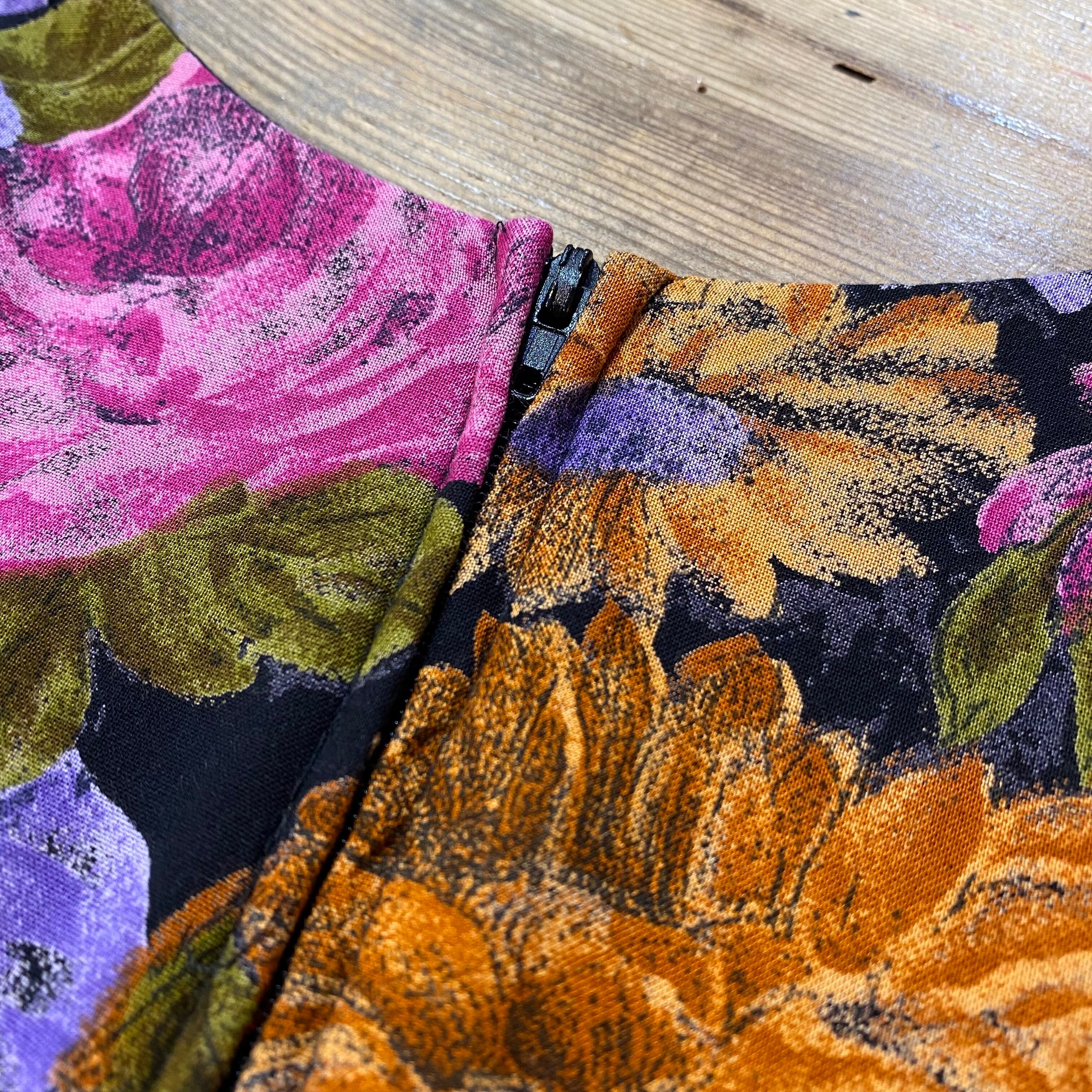 ピンクやオレンジ、パープルの花柄が可愛い、80年代のジャンパーワンピースです。