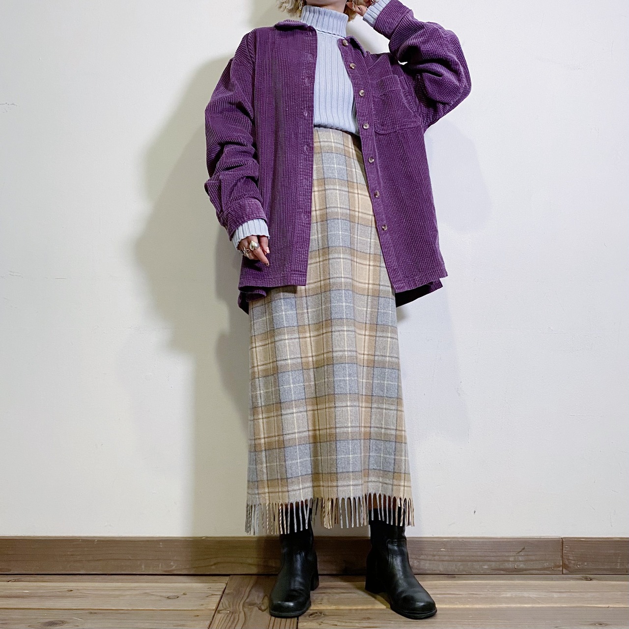 無地なので、柄物アイテムとも相性良く着られるのが嬉しいですね。