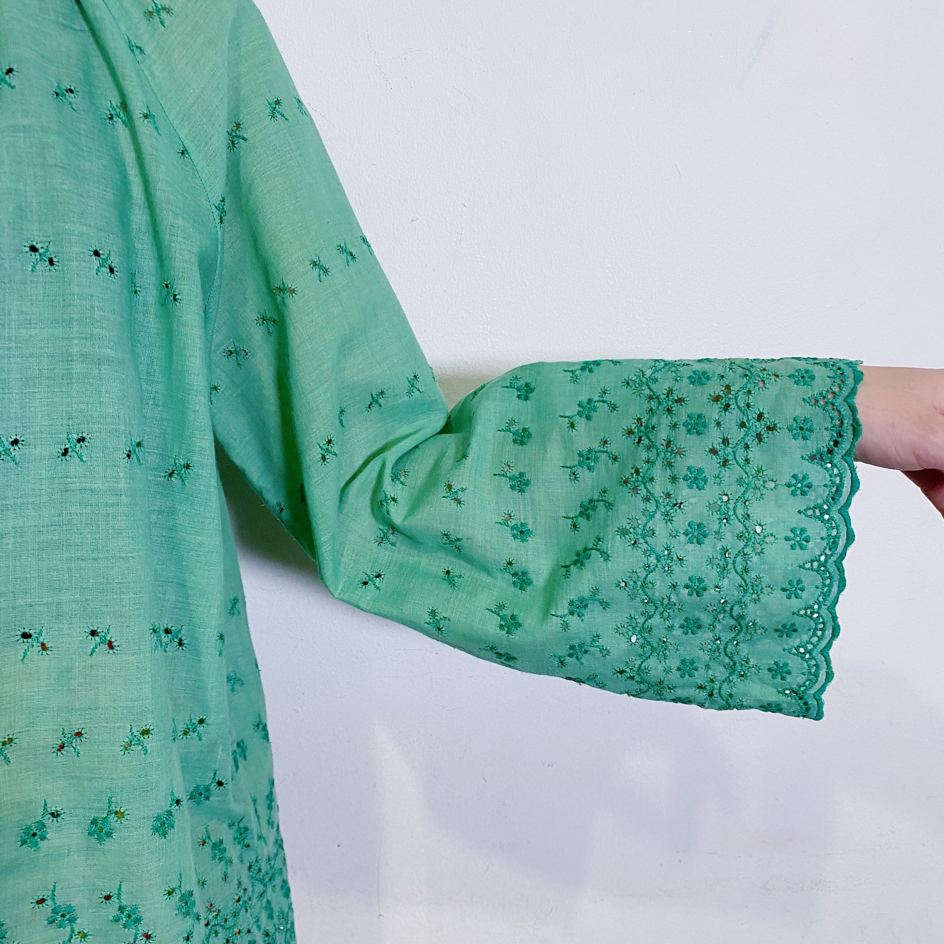 袖口や裾のスカラップ、細やかなカットワークなどデザイン性のある一枚。
