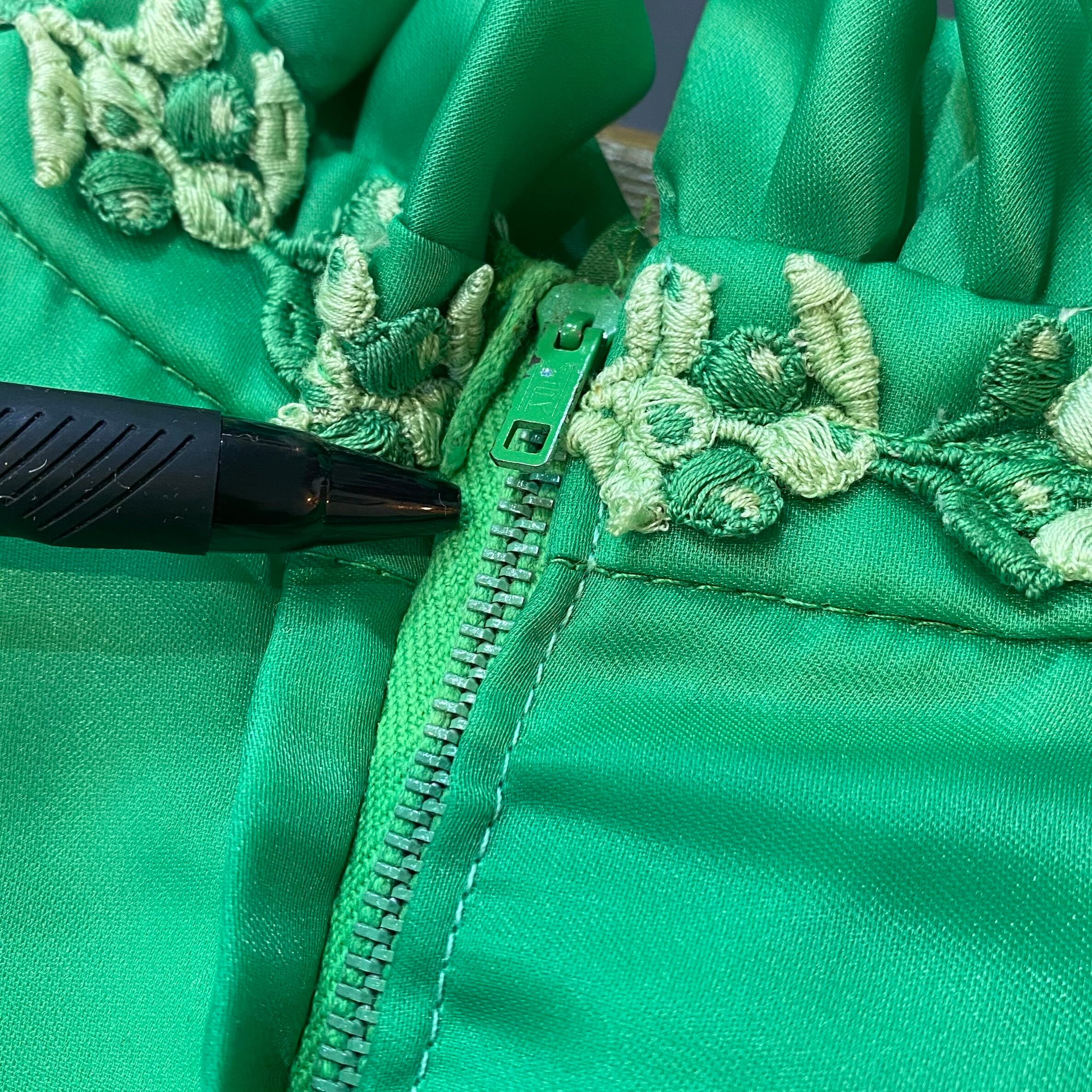 パッと目を惹くグリーンカラーが魅力の70年代のワンピースです。