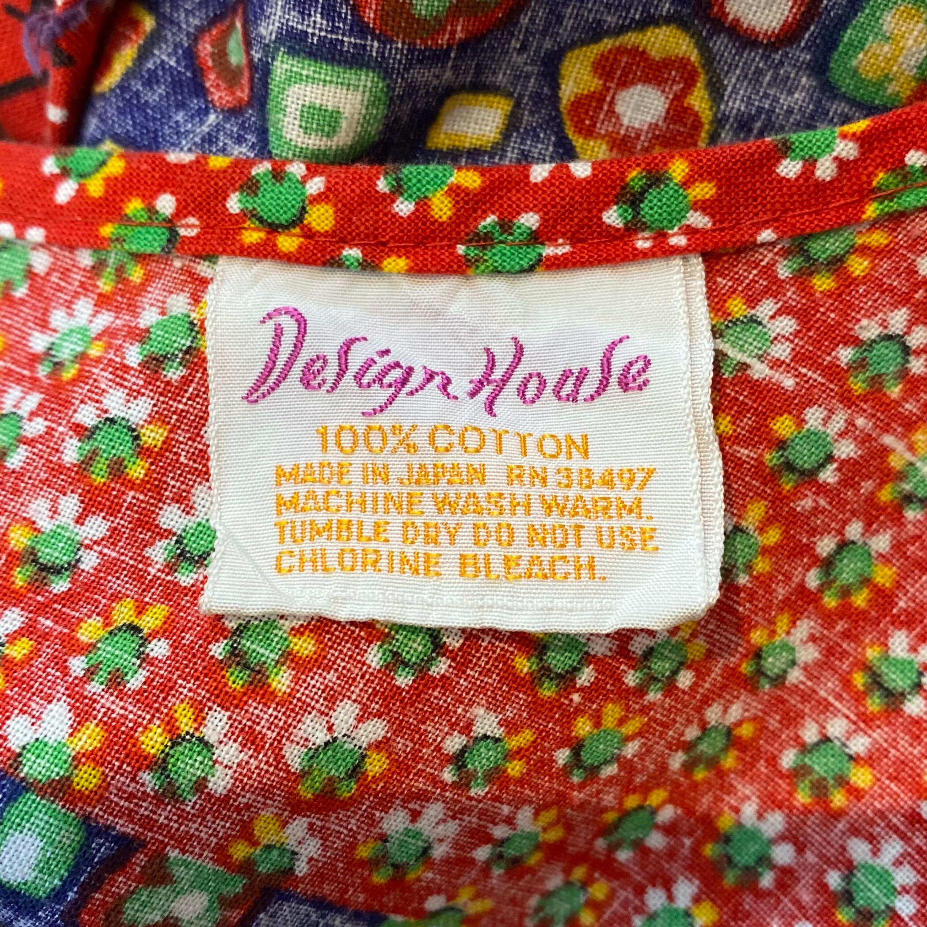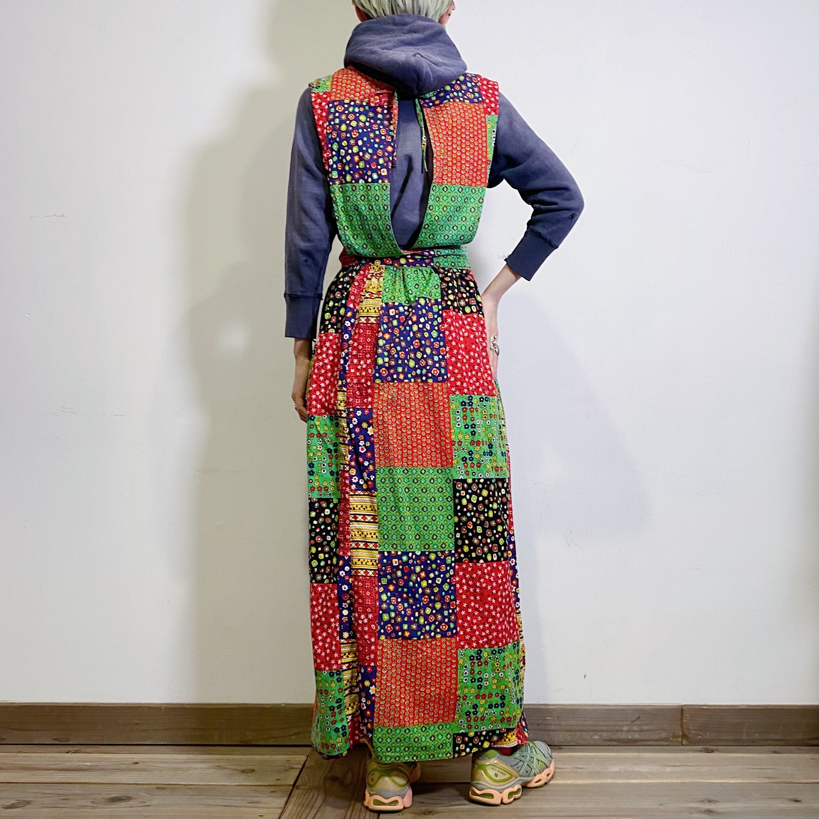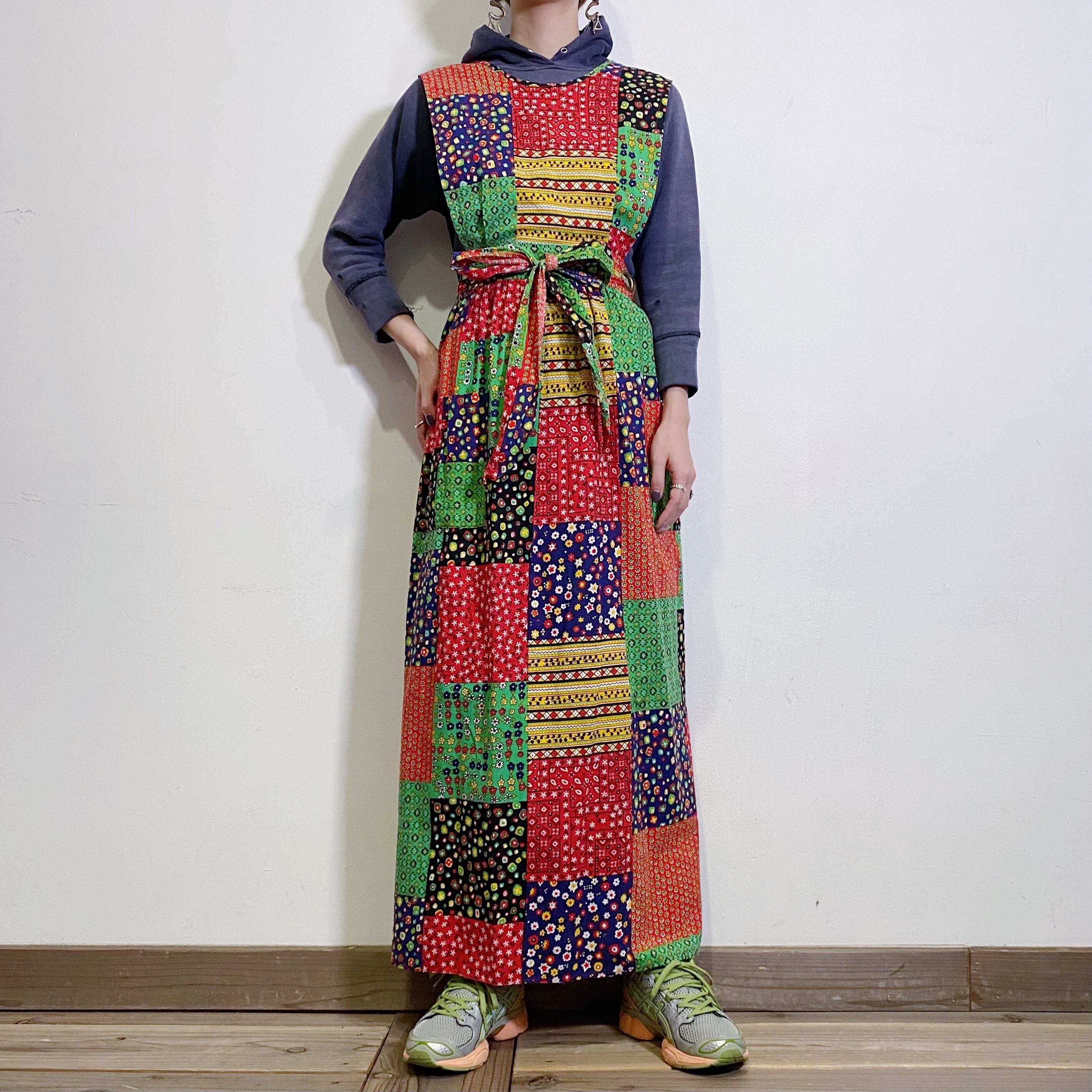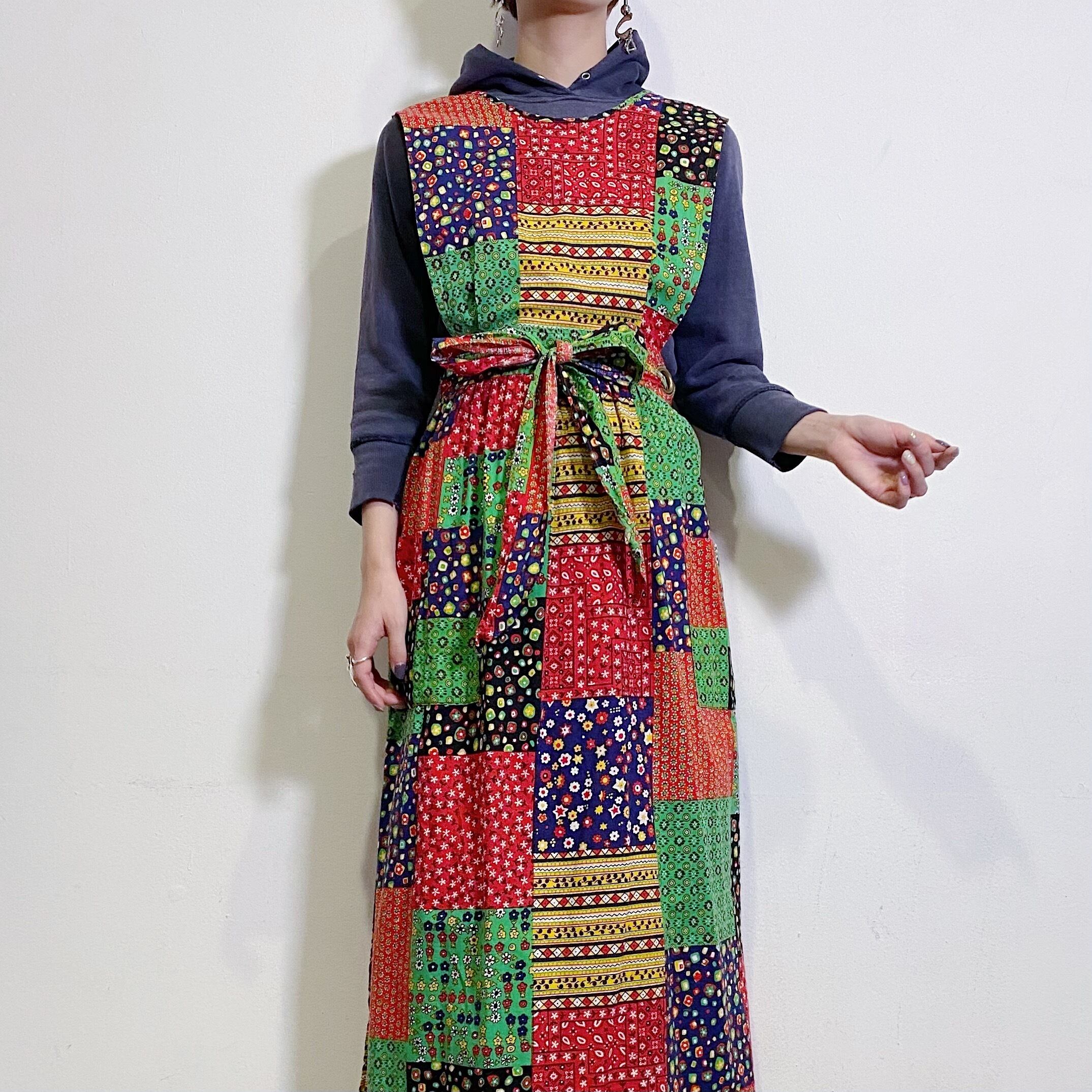パッチワークプリントが可愛い、70年代のエプロンワンピースです。
