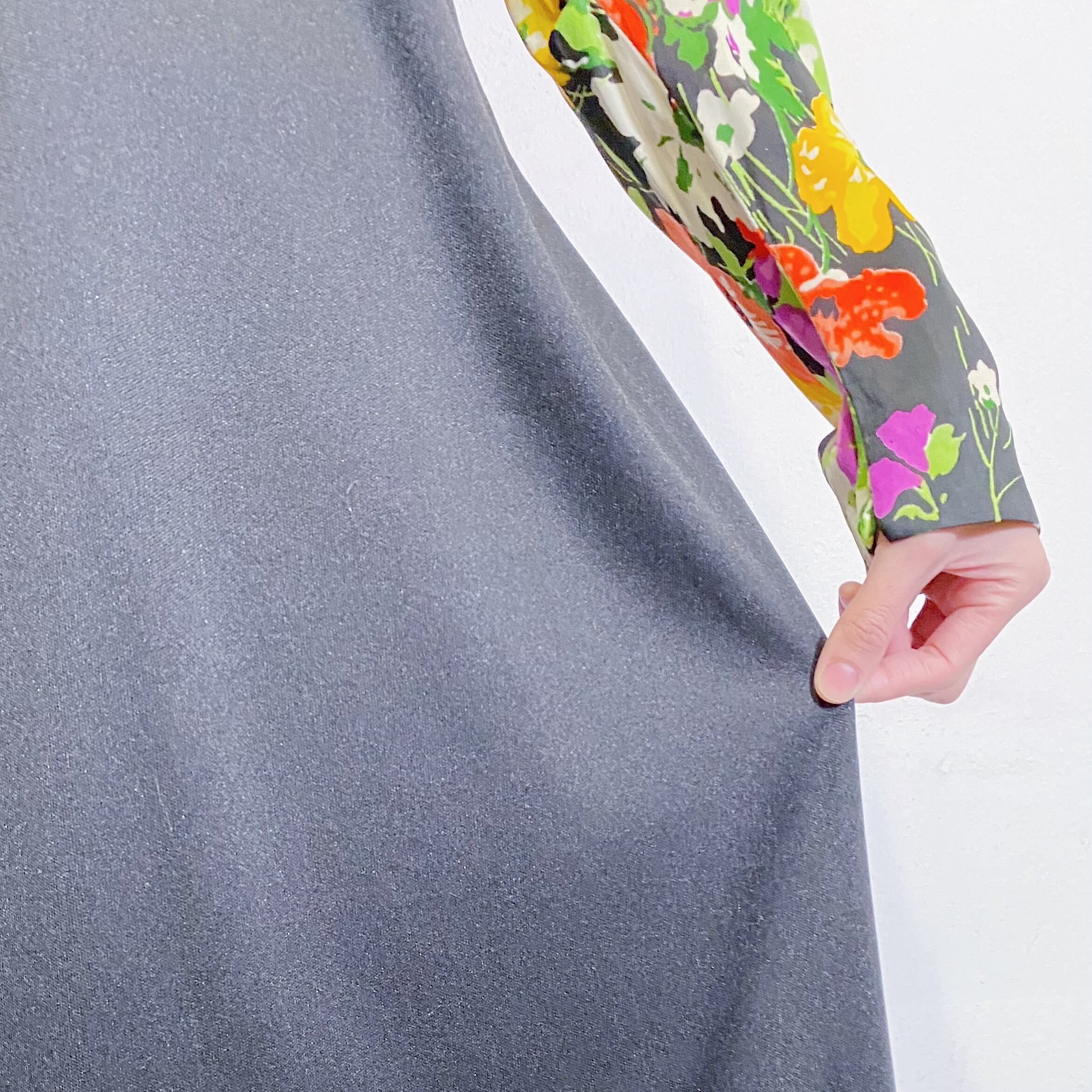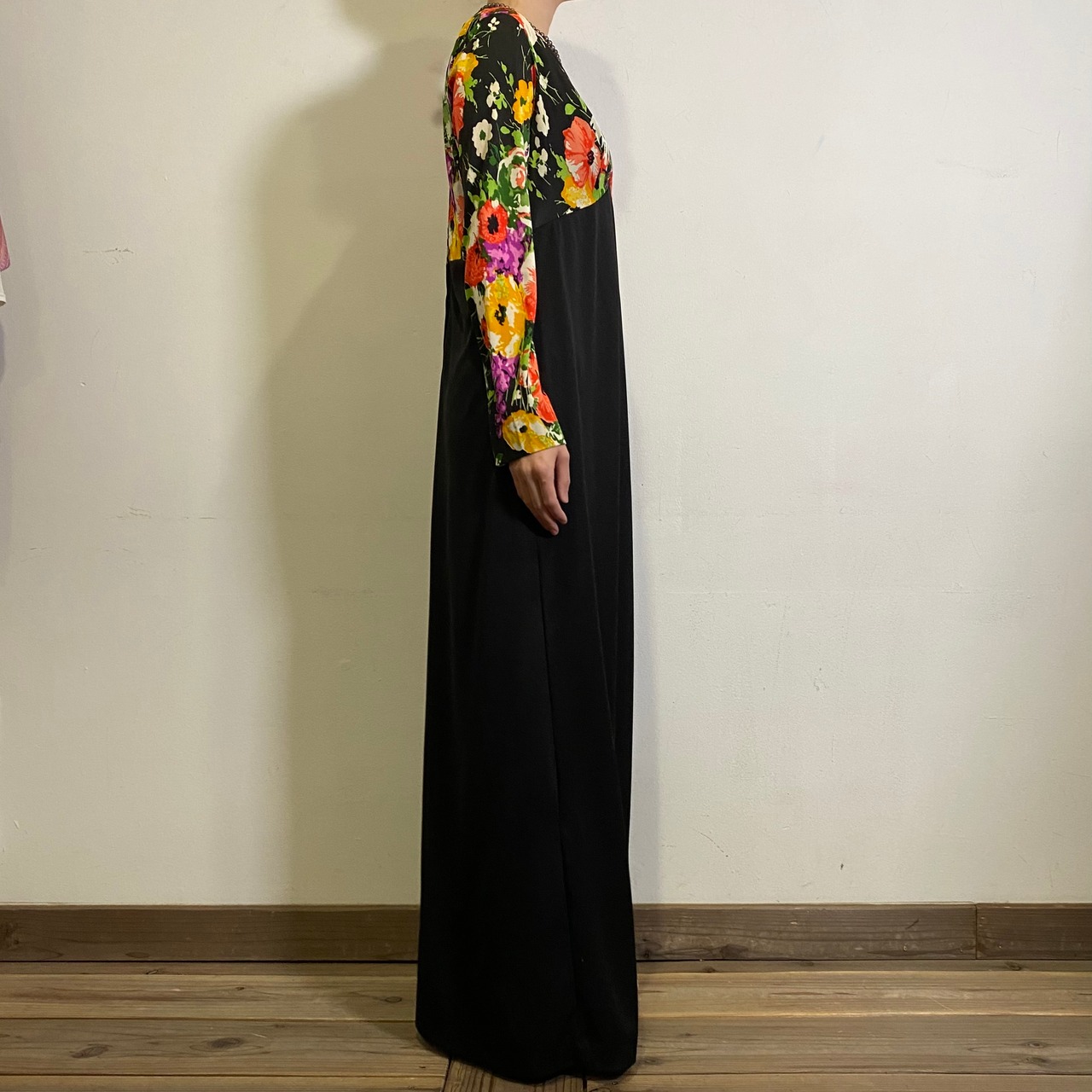 オレンジやイエローの華やかな花柄に、ブラックの切り替えが素敵な60年代頃のロングワンピースです。