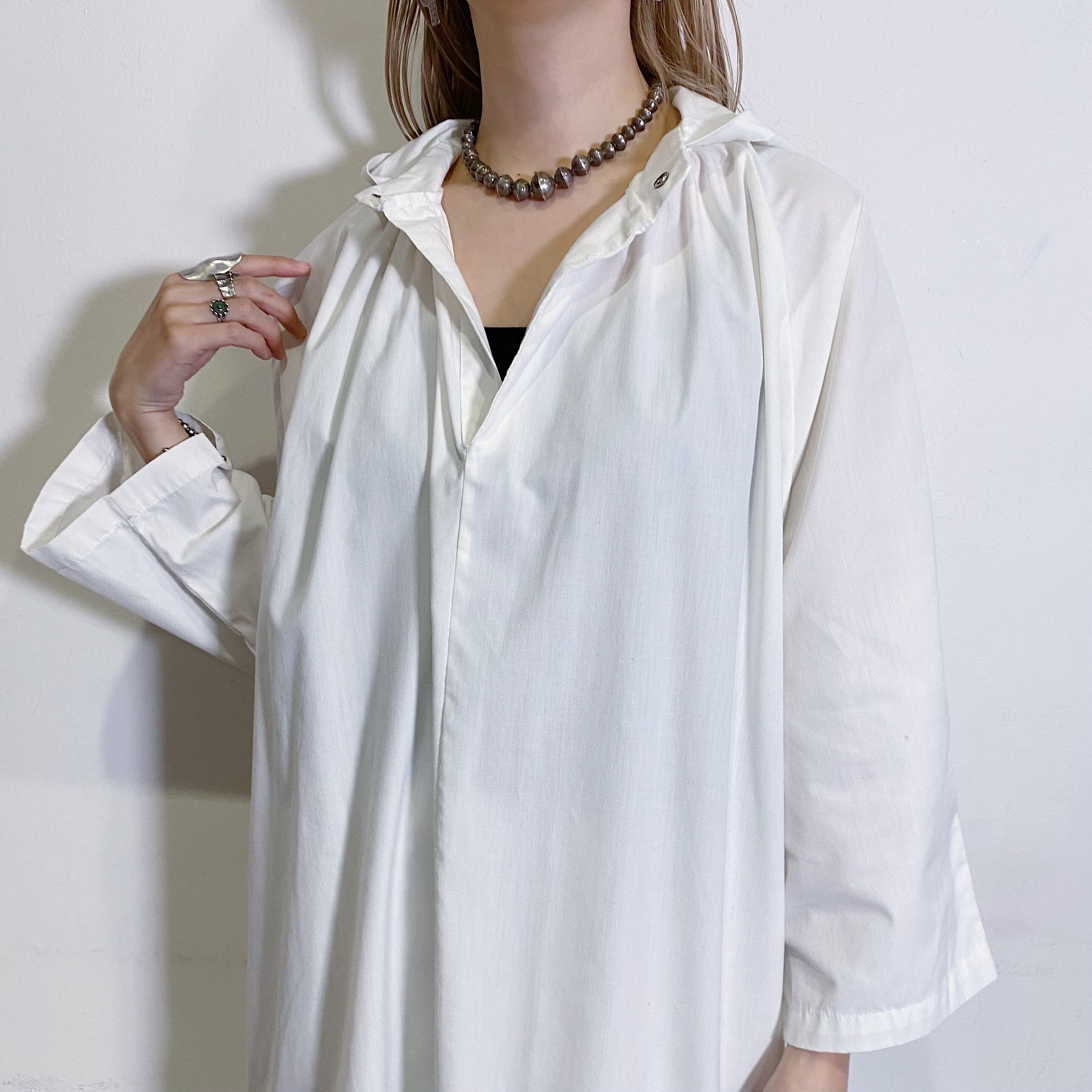 大きなフードが可愛い、白いコットン素材のスモックワンピースです。