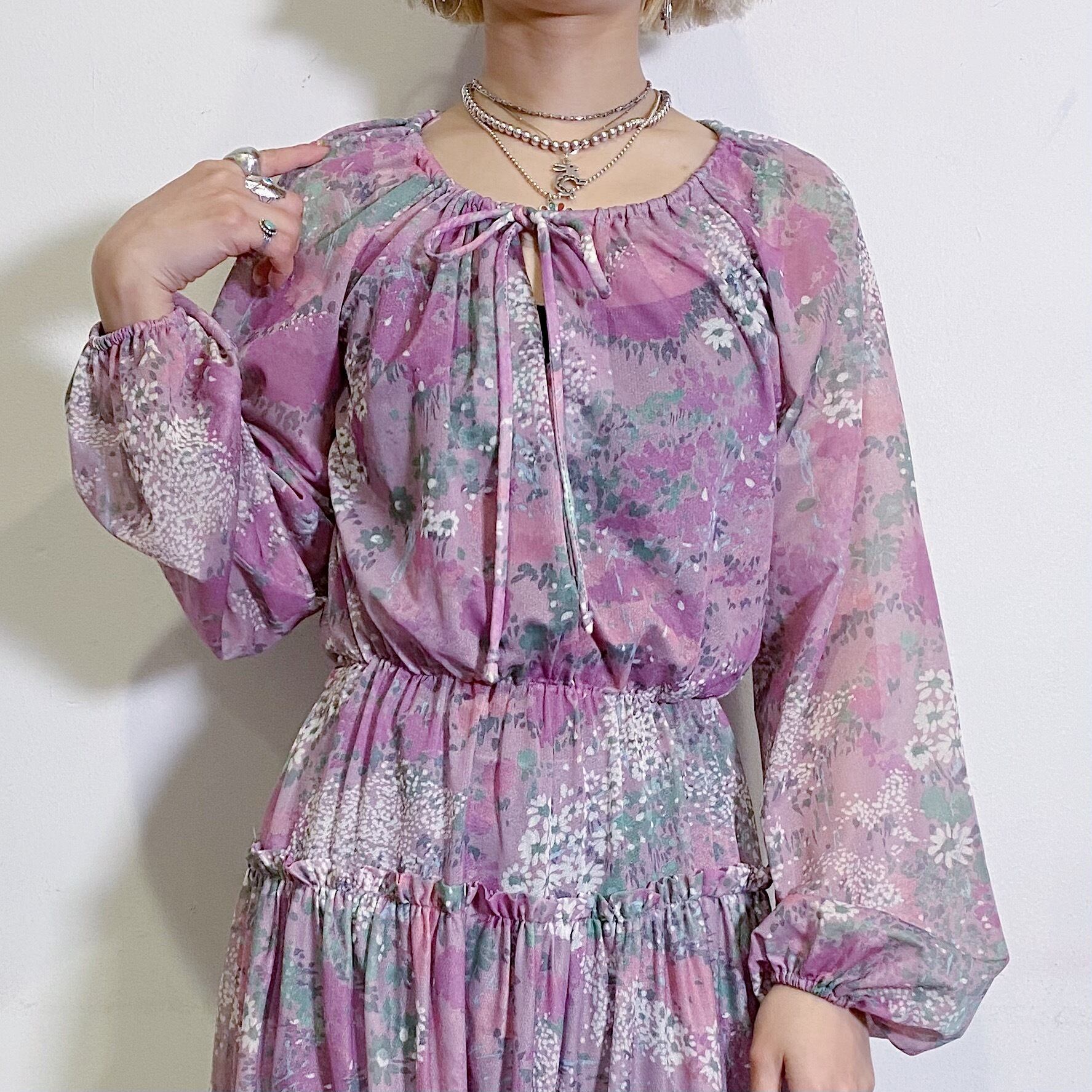 パープルベースに水彩画のような花柄が可愛い、70年代のワンピースです。