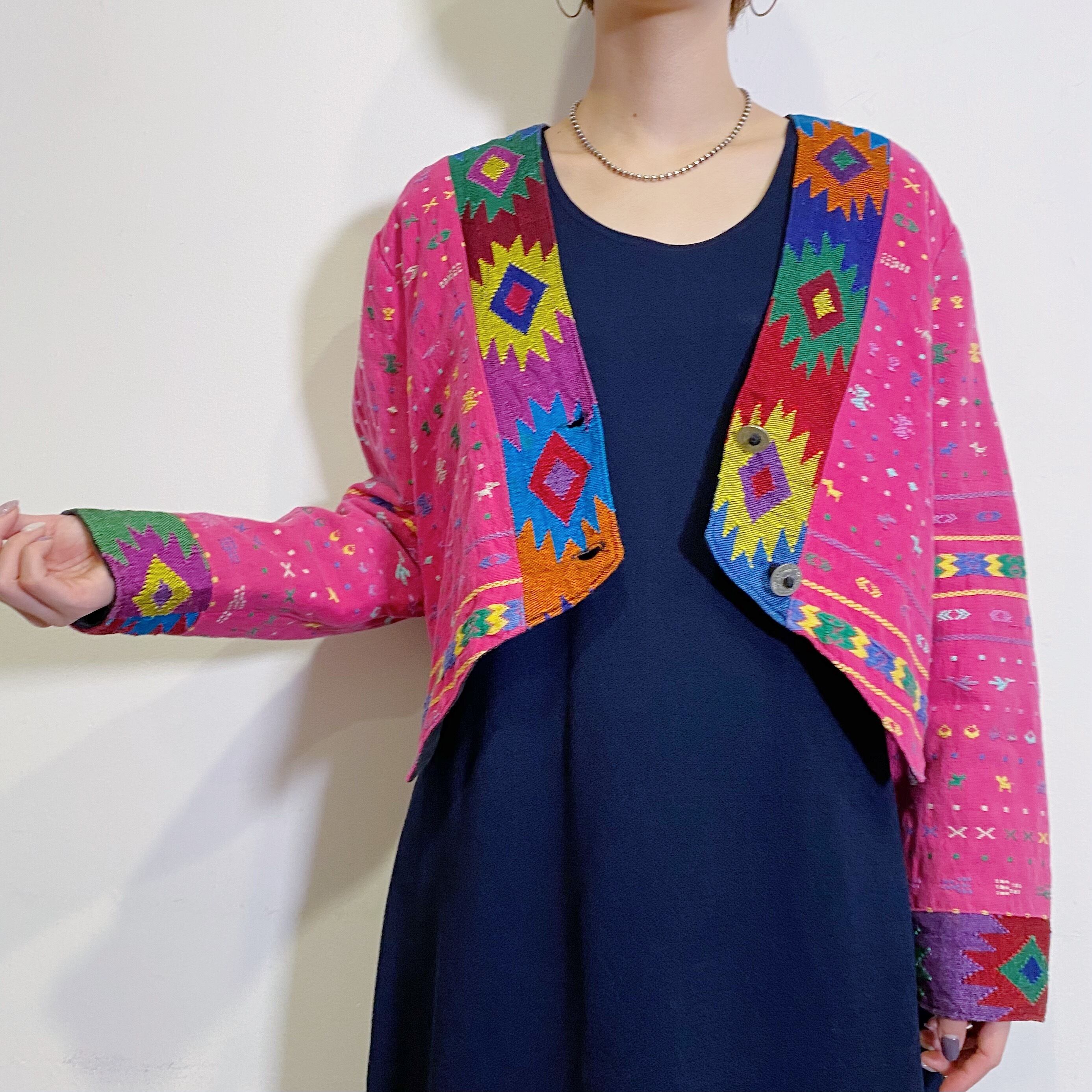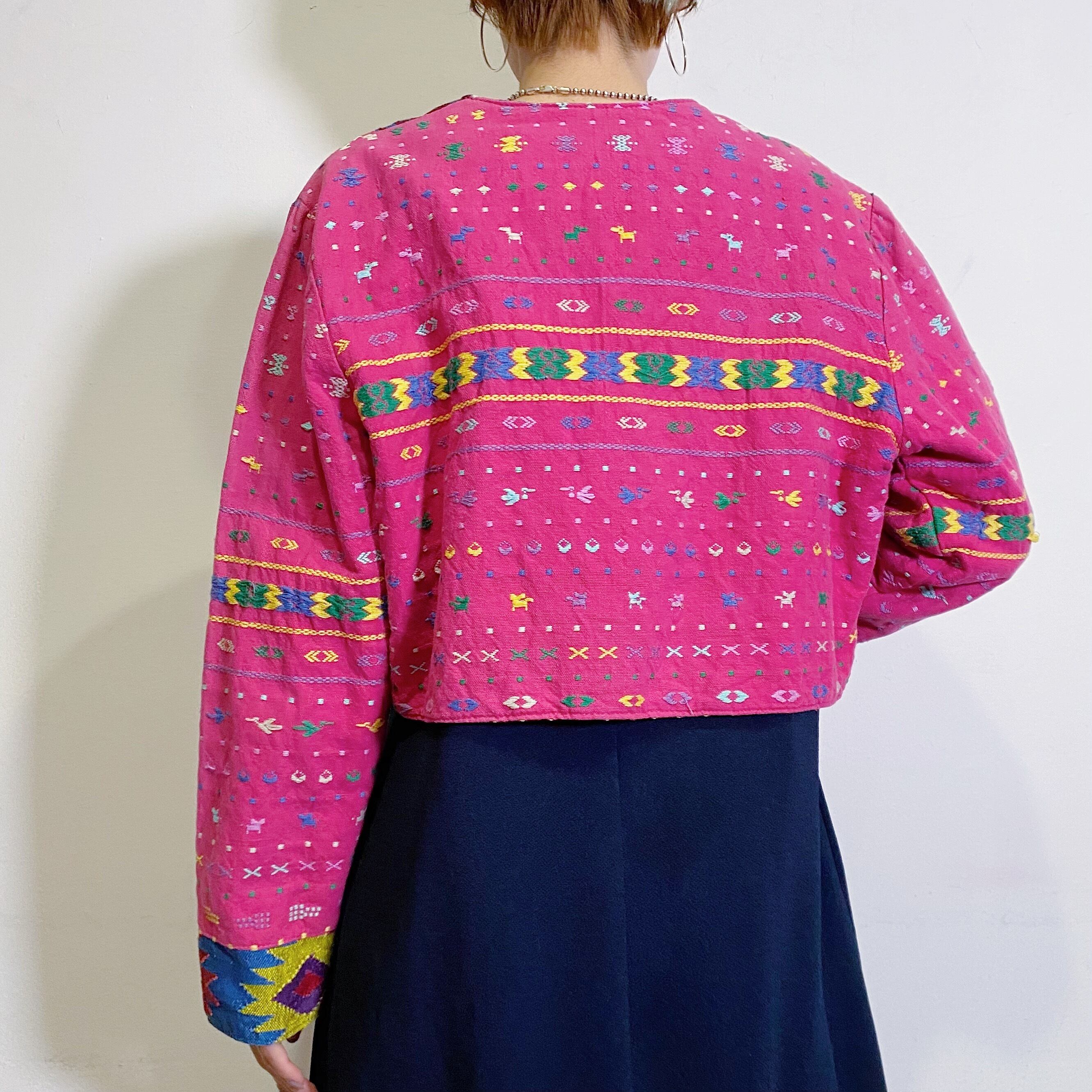 パッと目を惹くフューシャピンクに、カラフルな刺繍が可愛いジャケットです。