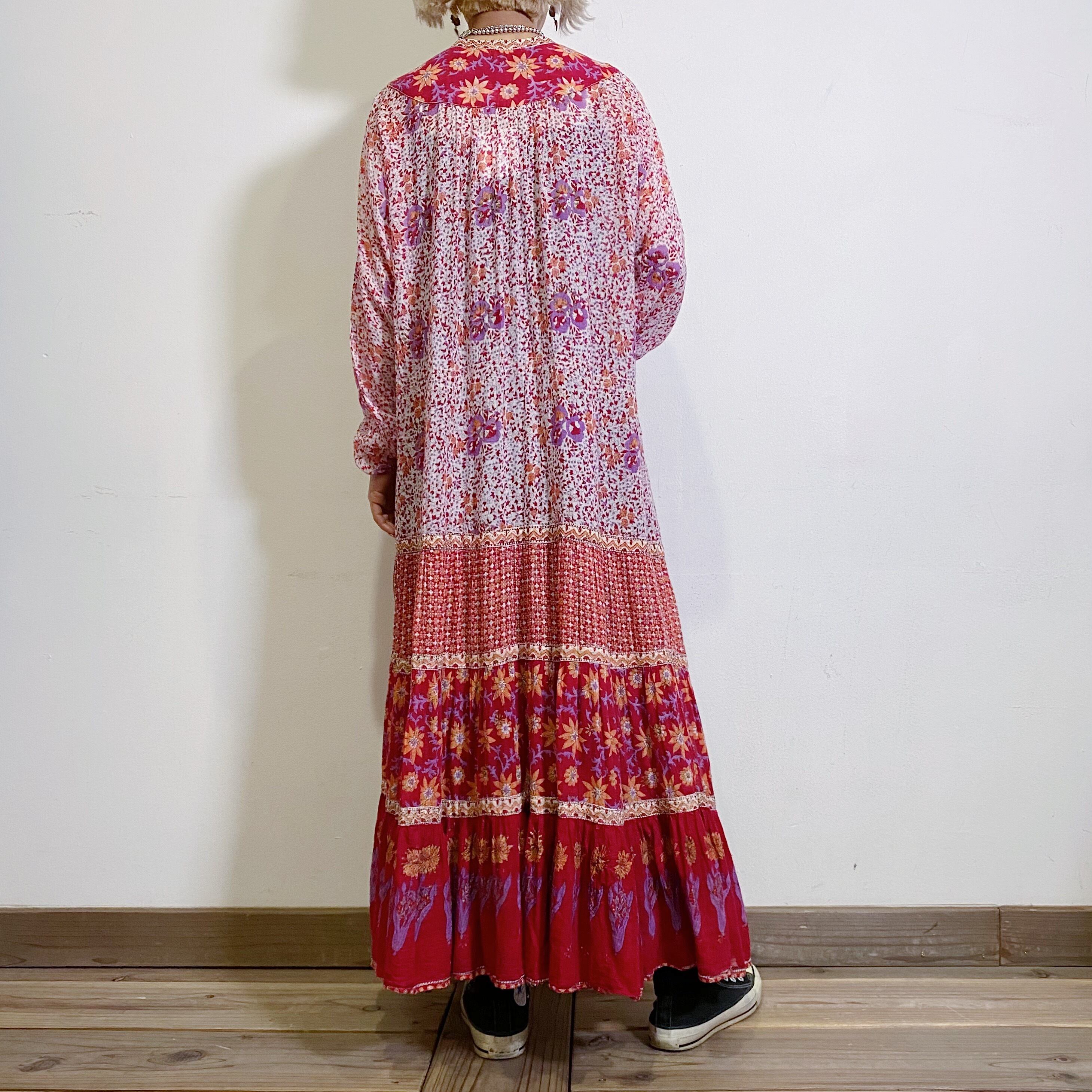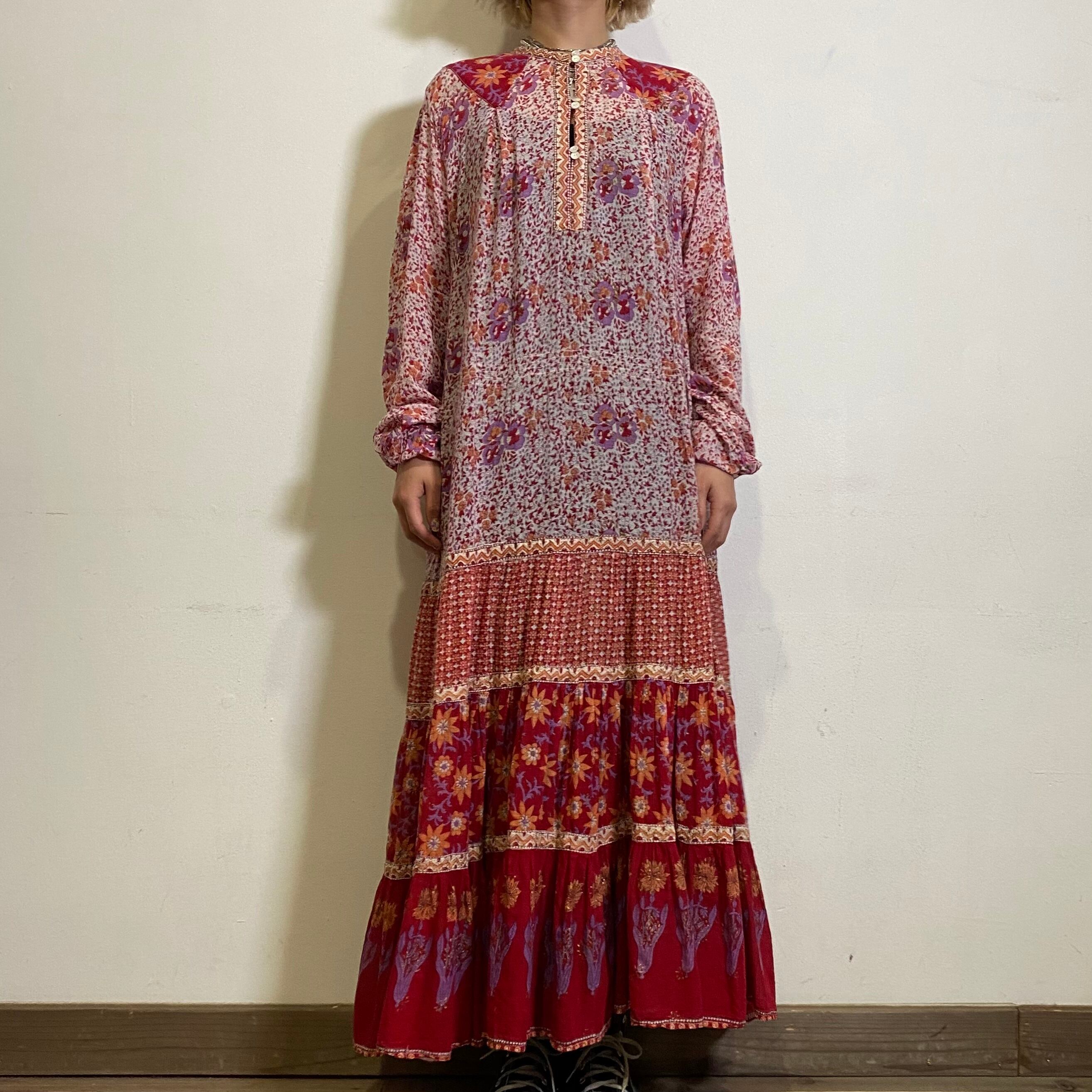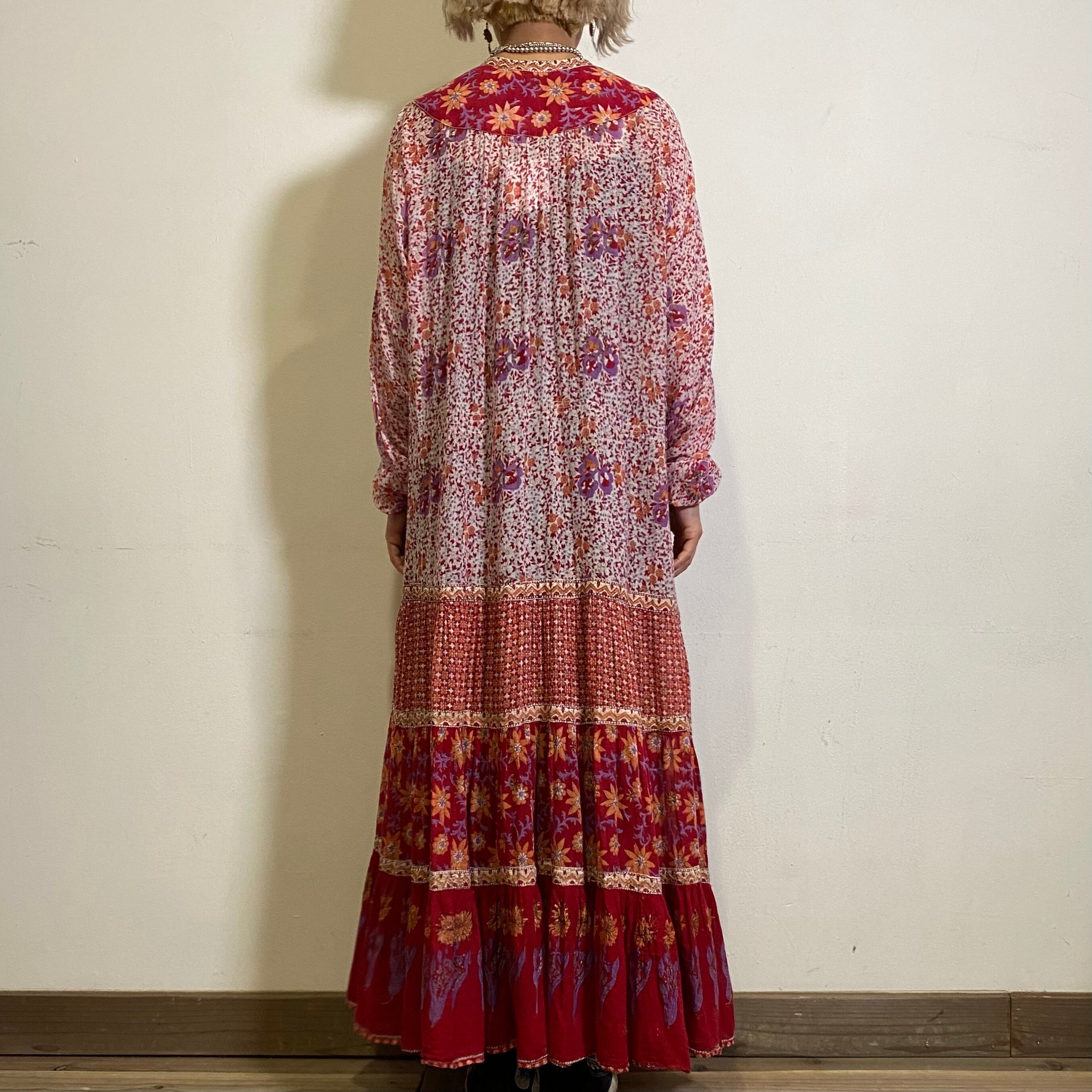 レッドベースに裾の切り替えが可愛い、70年代のインド綿ワンピースです。