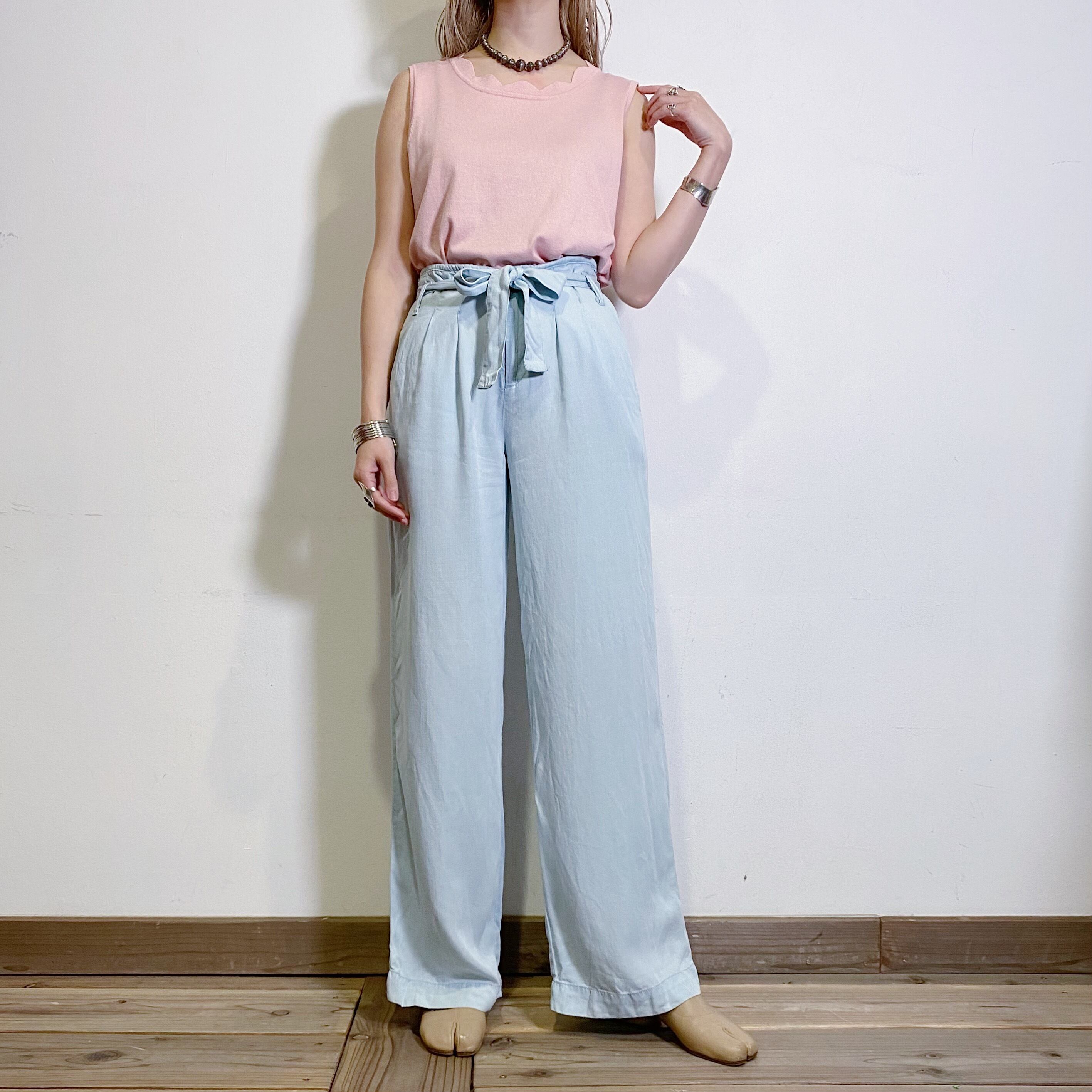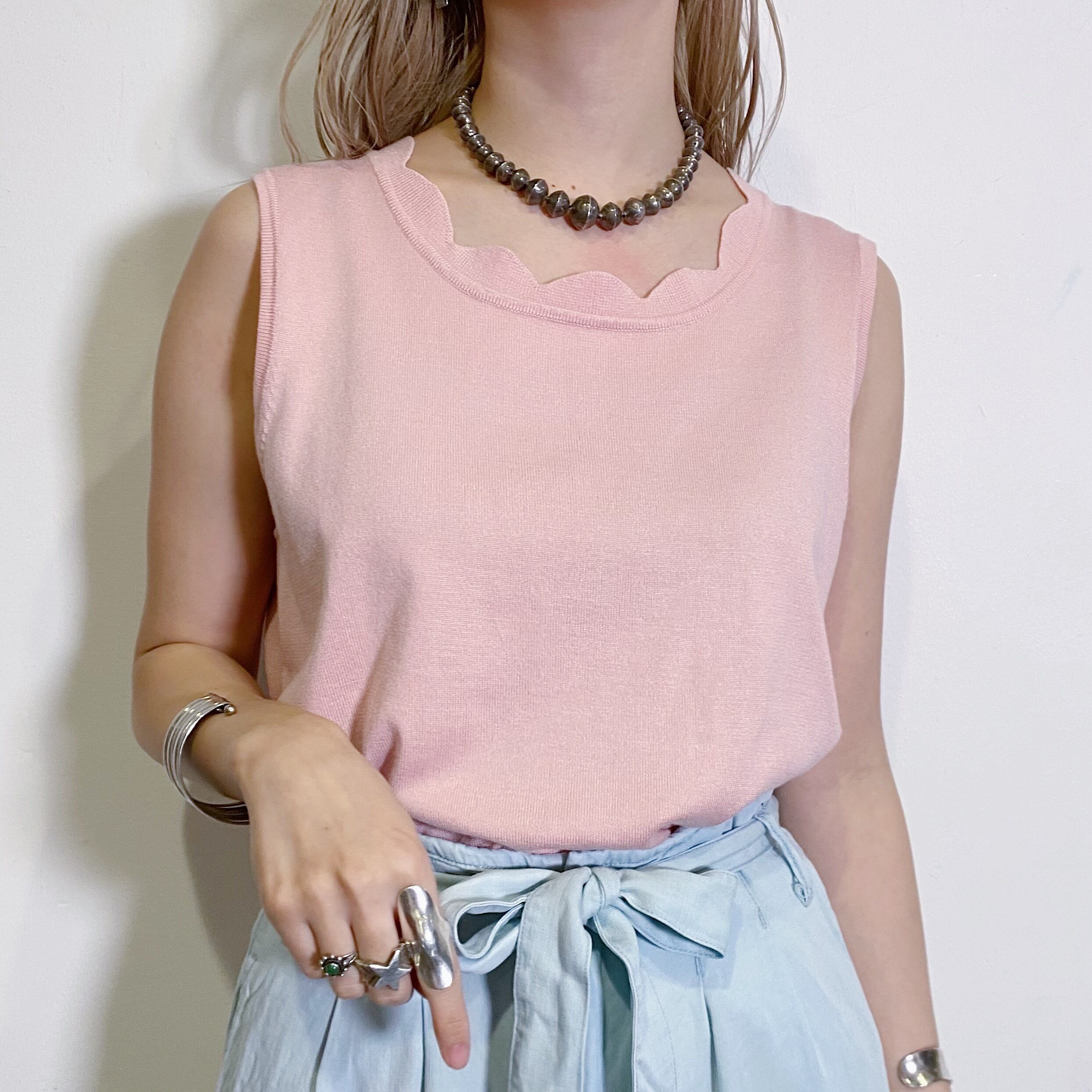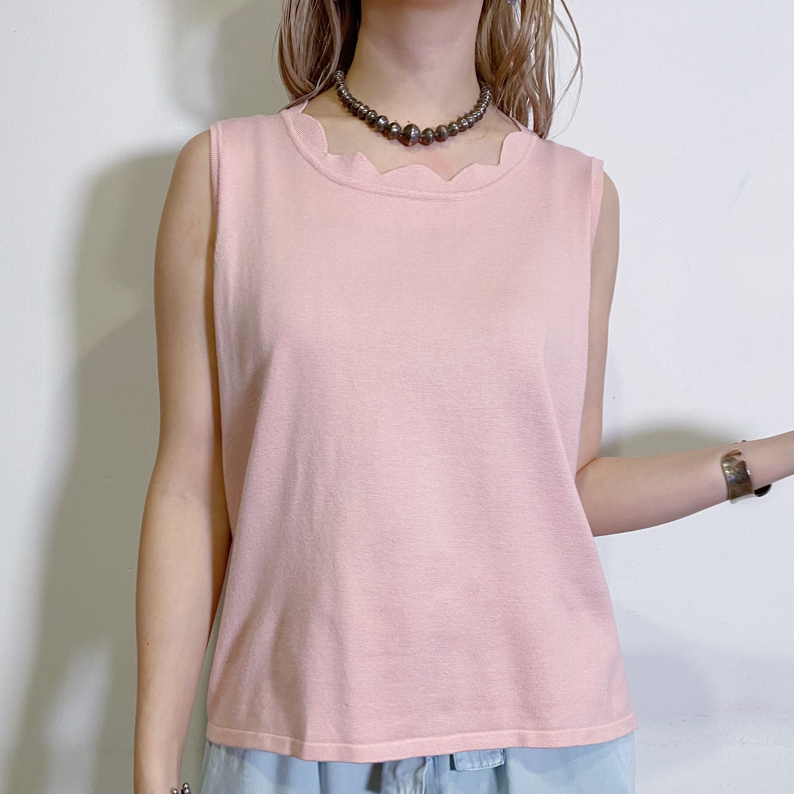 ベビーピンクの色合いが可愛い、サマーニット地のノースリーブトップスです。